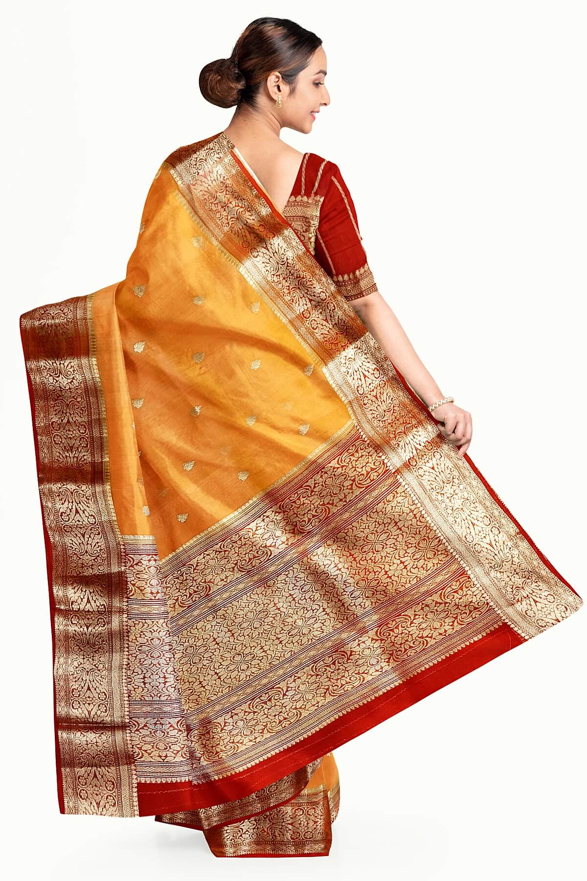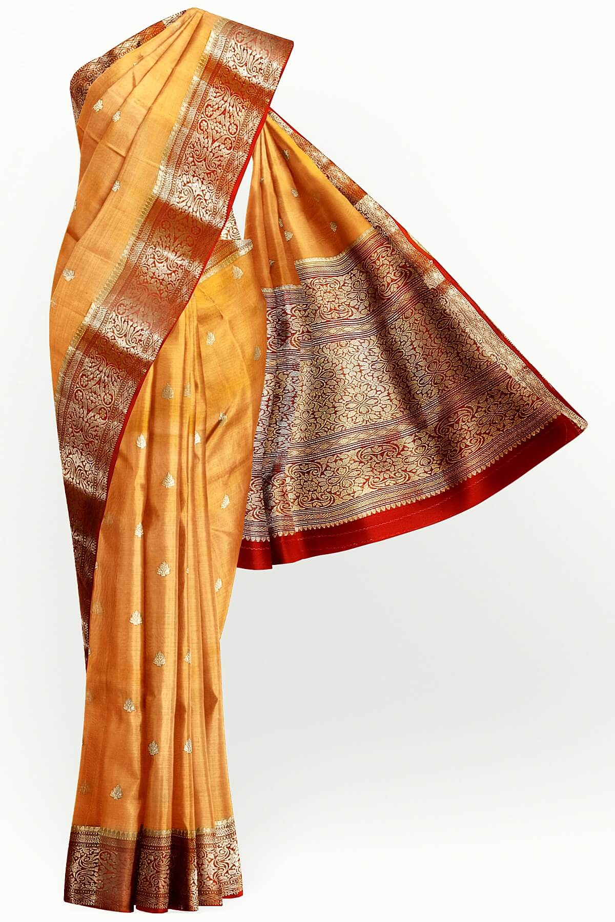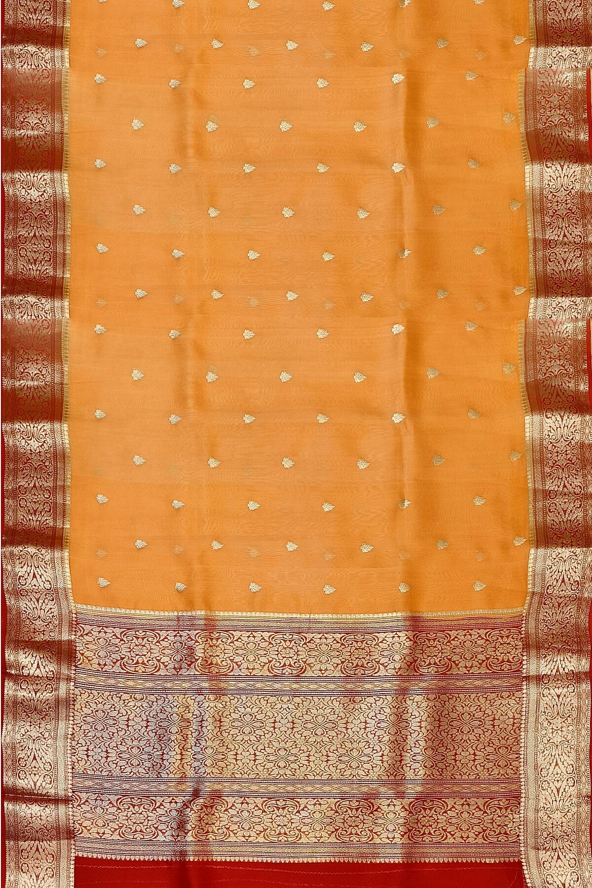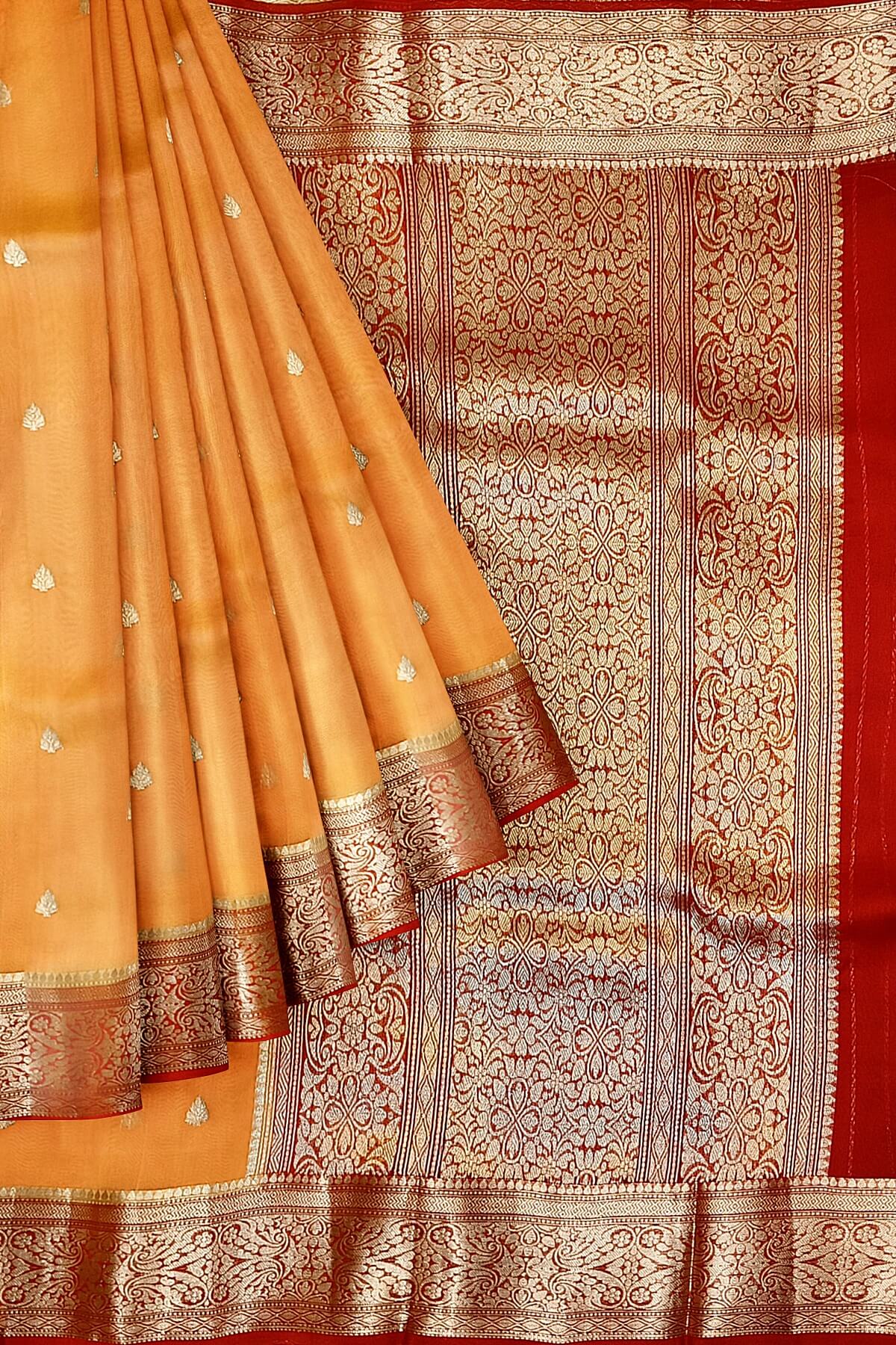 Description: Banarasi kora (organza) silk saree in peach with motifs and a contrast pallu in red.