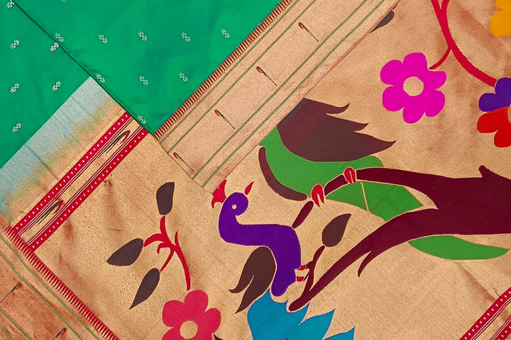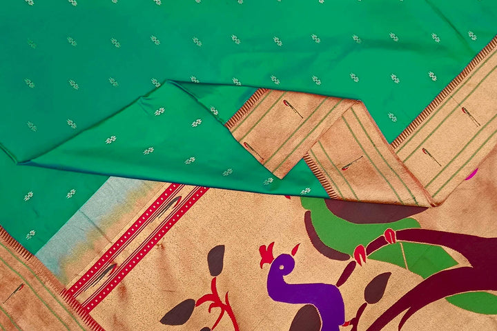 Description : Paithani pure silk saree in Rama green with small motifs and a beautiful contrast pallu with peacock & parrot , complemented with a muniya border