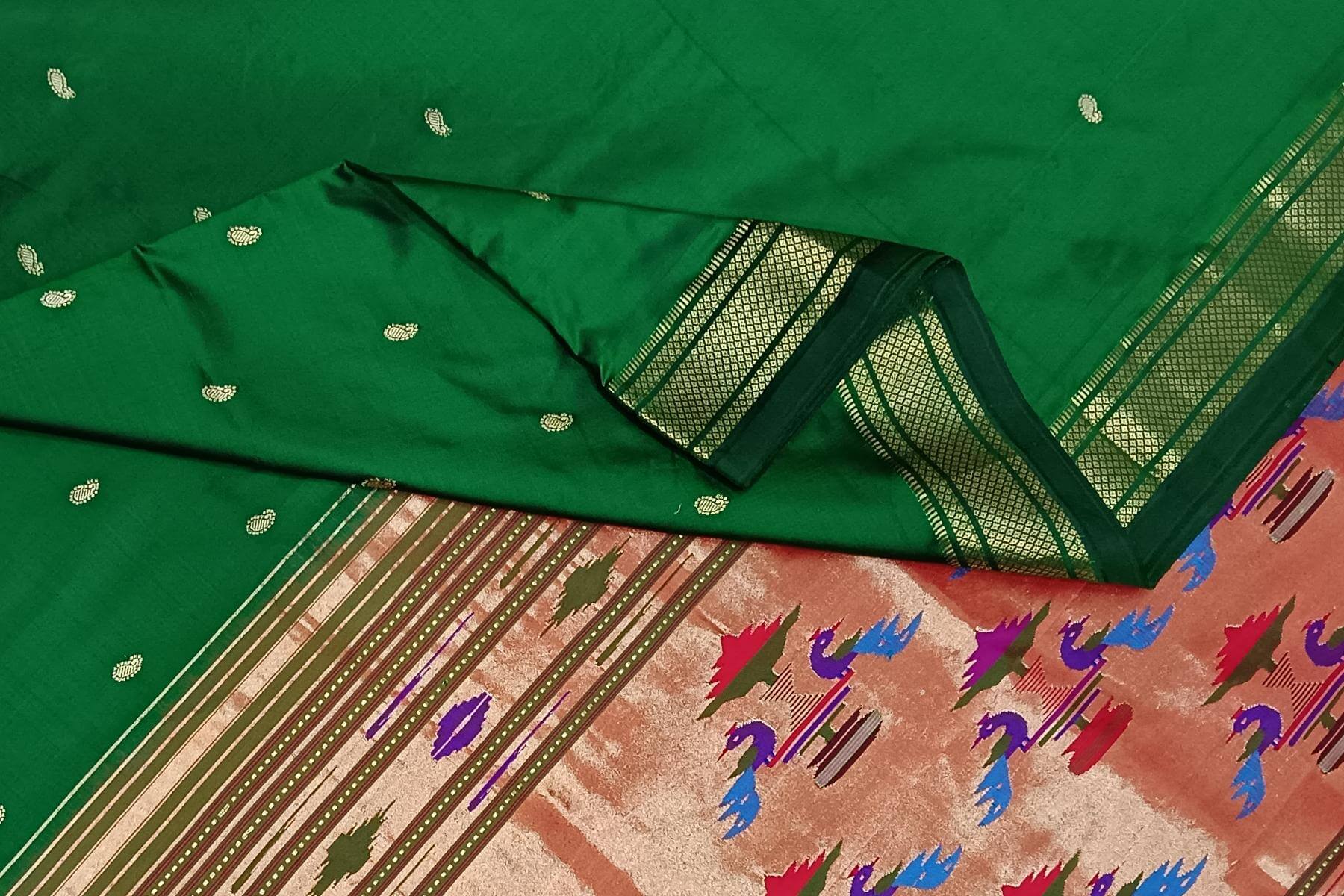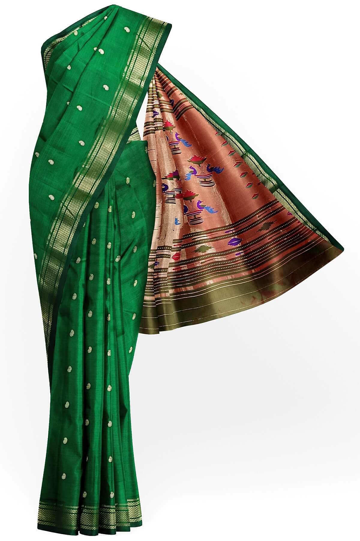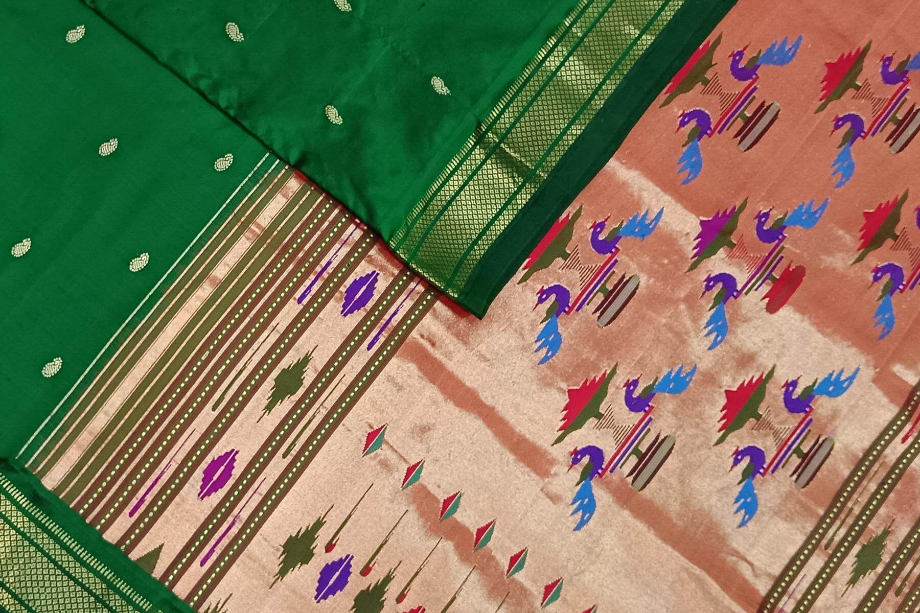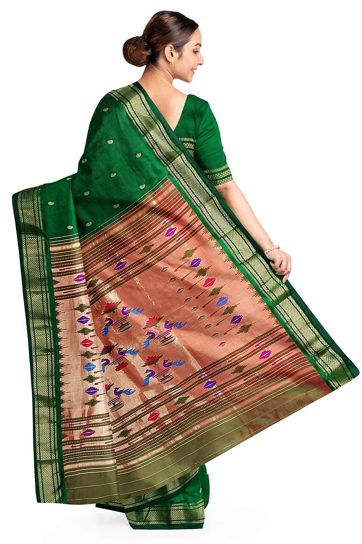 Description : Handwoven Paithani pure silk saree in dark green with paisley motifs and a rich pallu with peacock motifs..