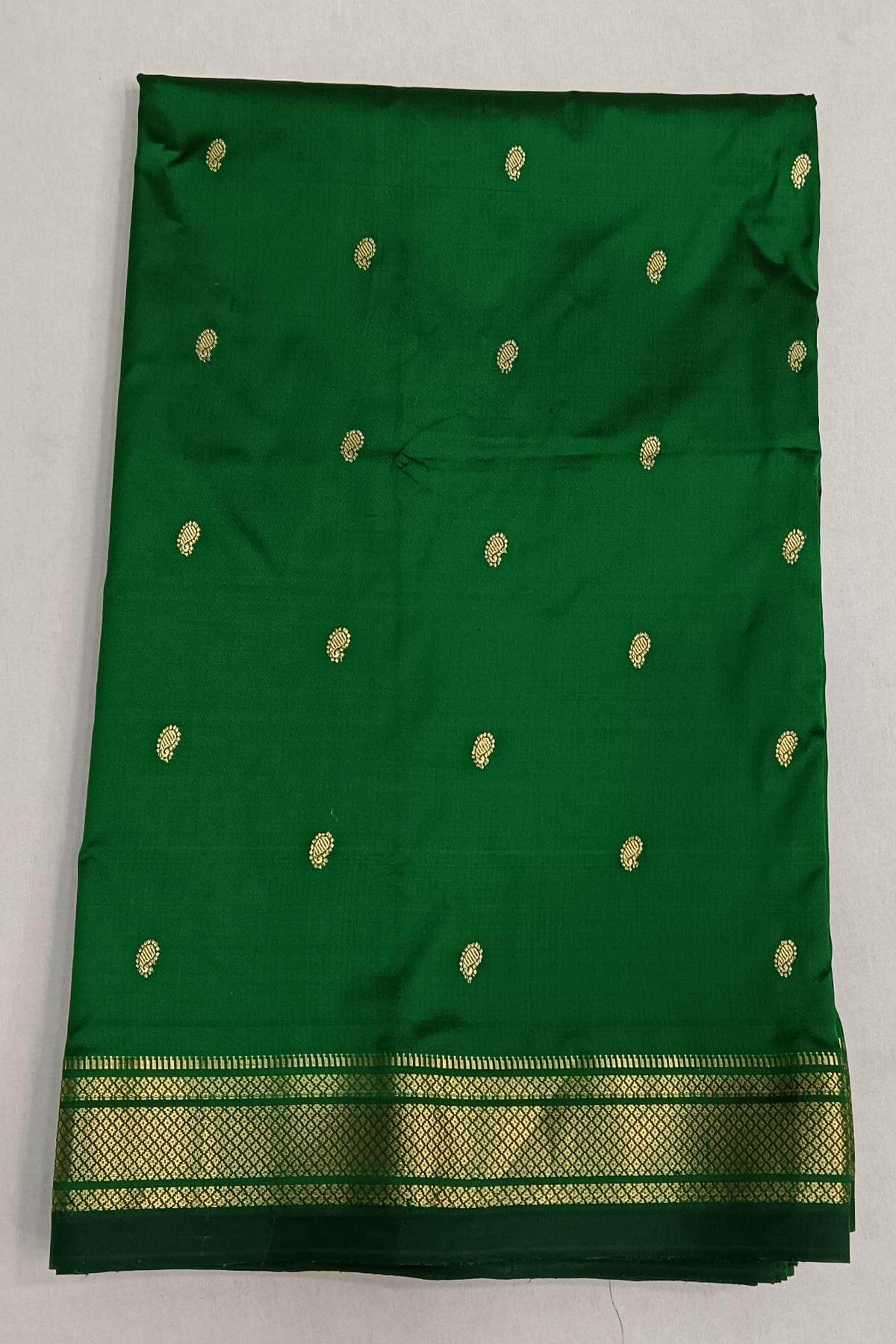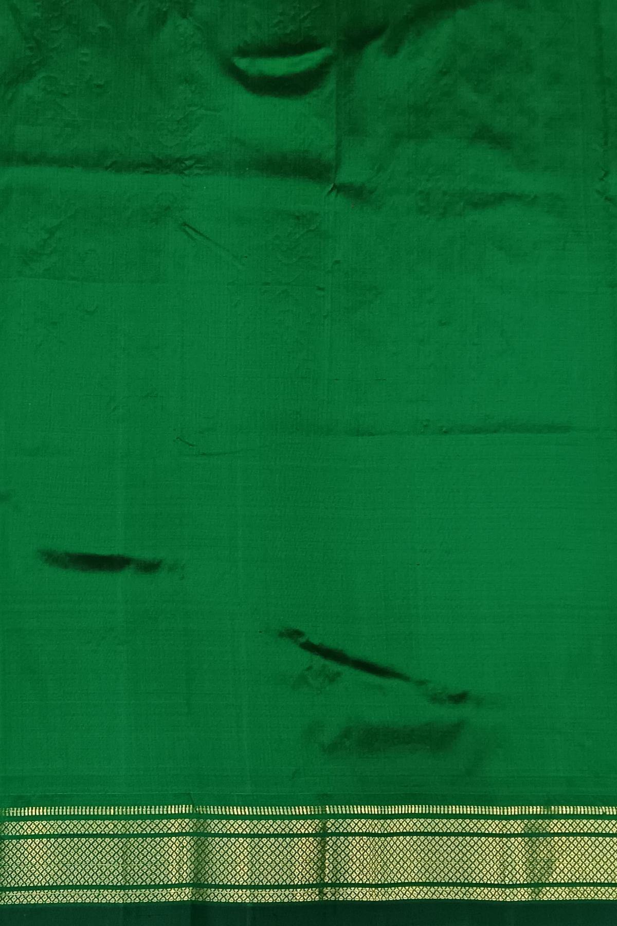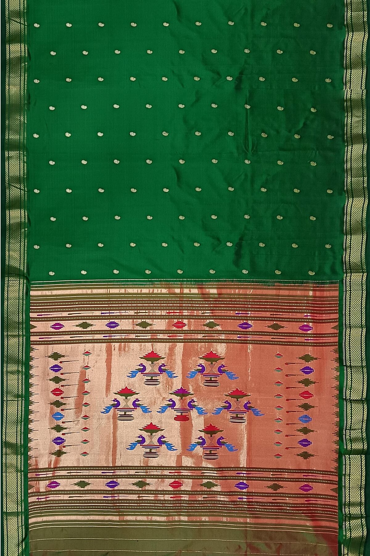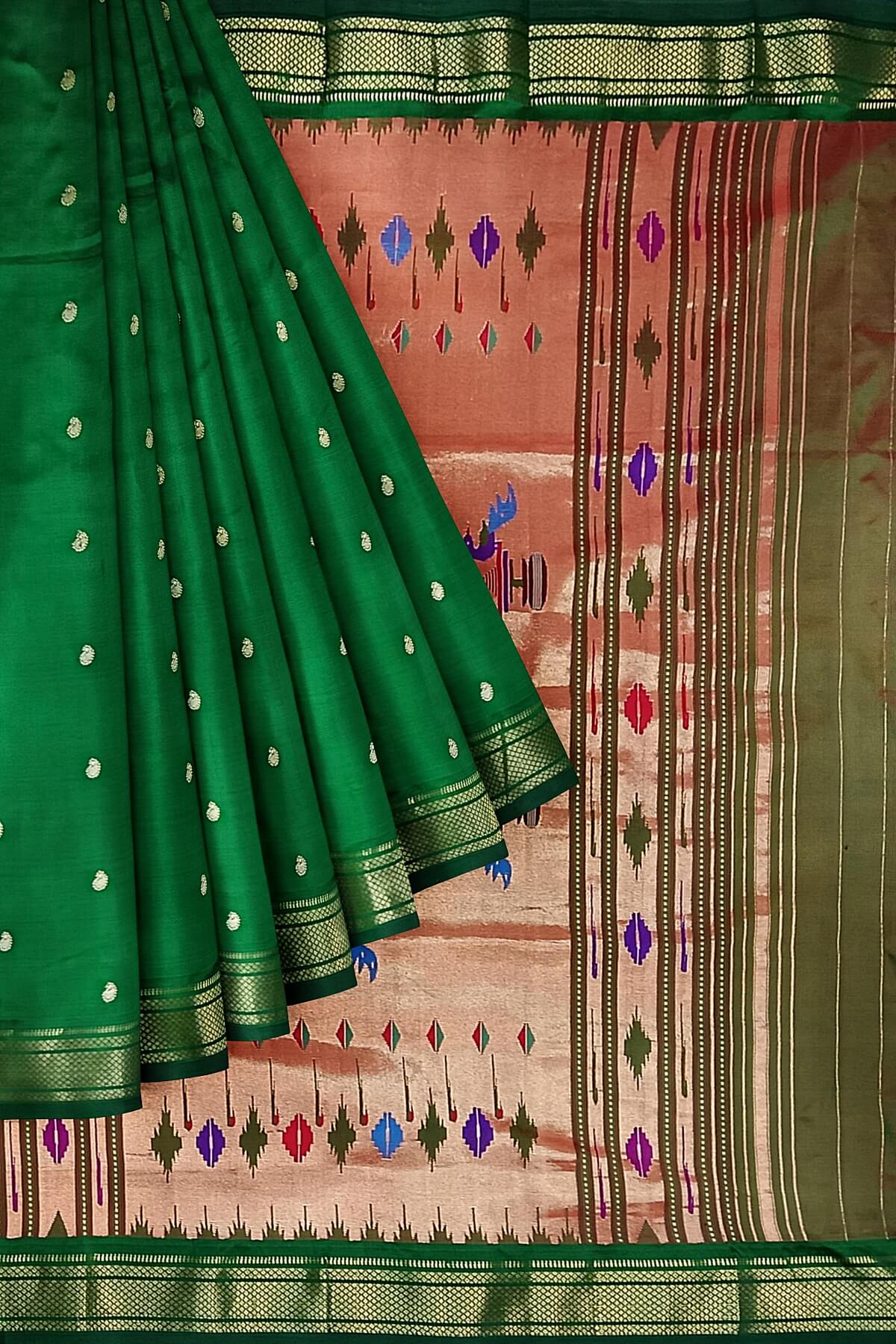 Description : Handwoven Paithani pure silk saree in dark green with paisley motifs and a rich pallu with peacock motifs..