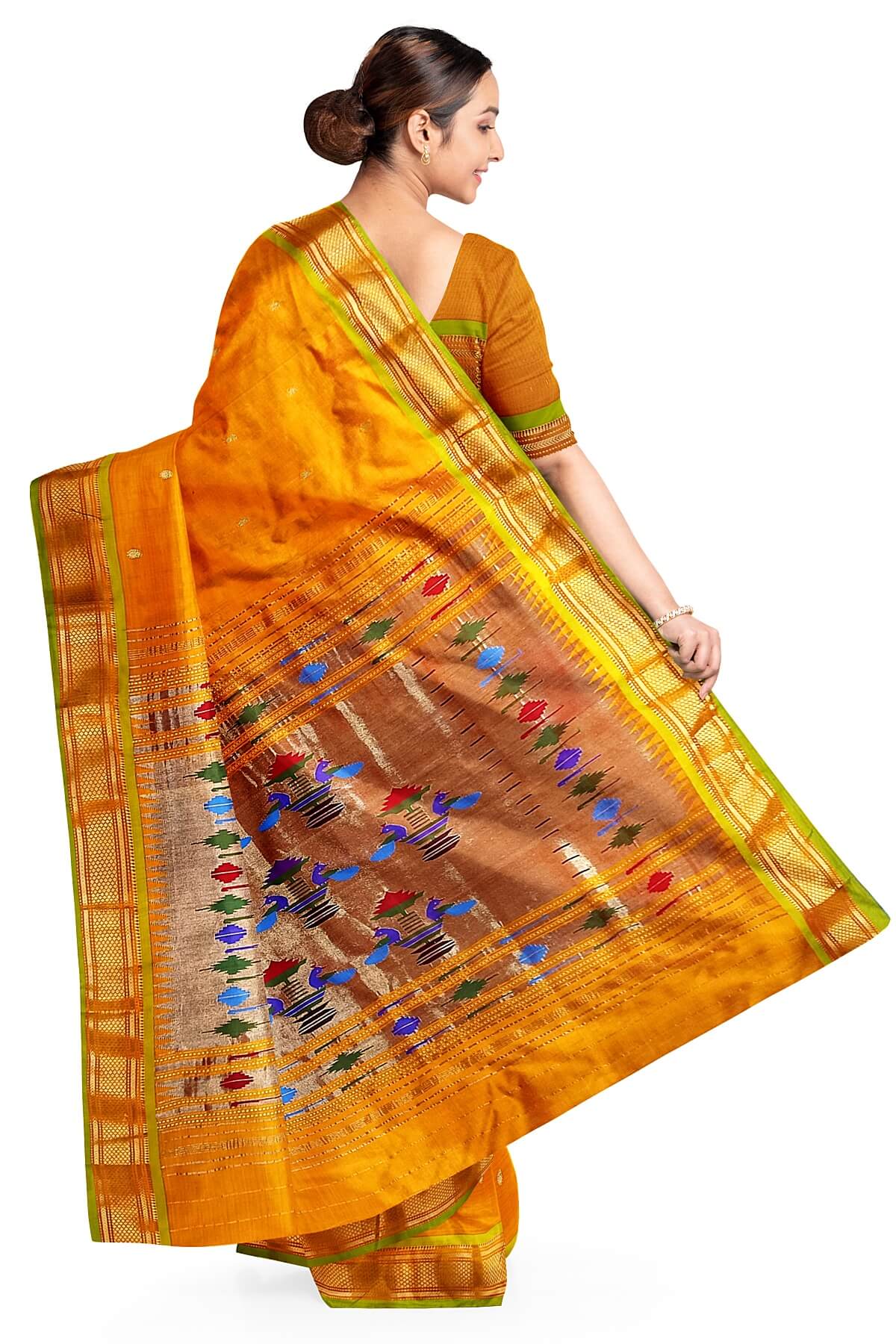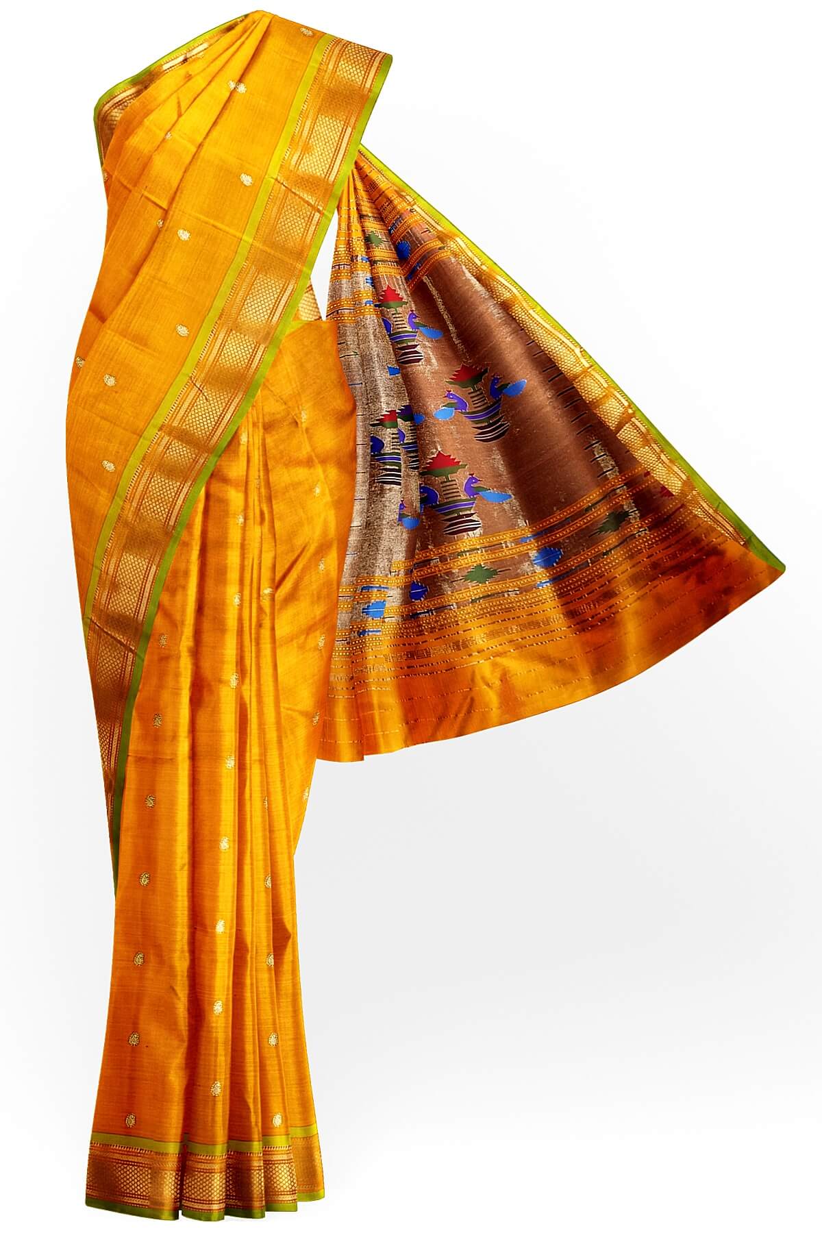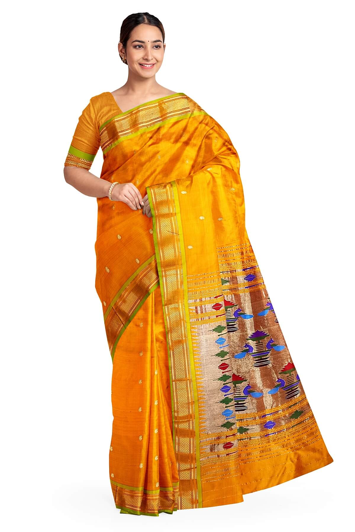 Description : Handwoven Paithani pure silk saree in mustard yellow with paisley motifs and a rich pallu with peacock motifs.