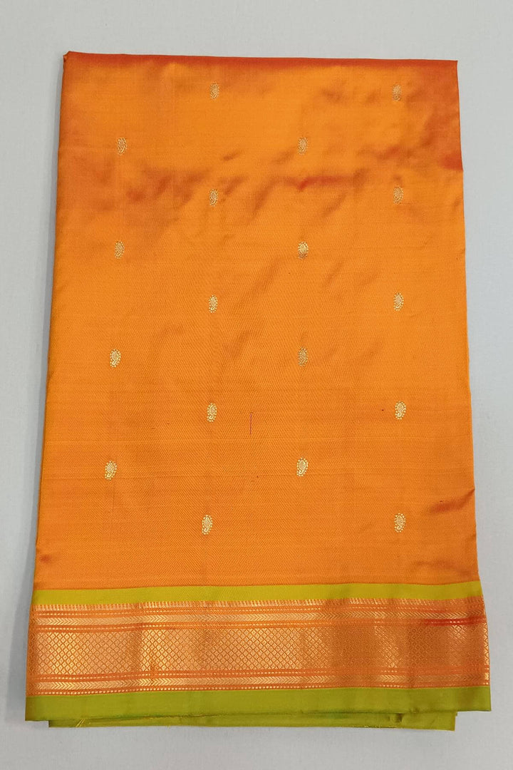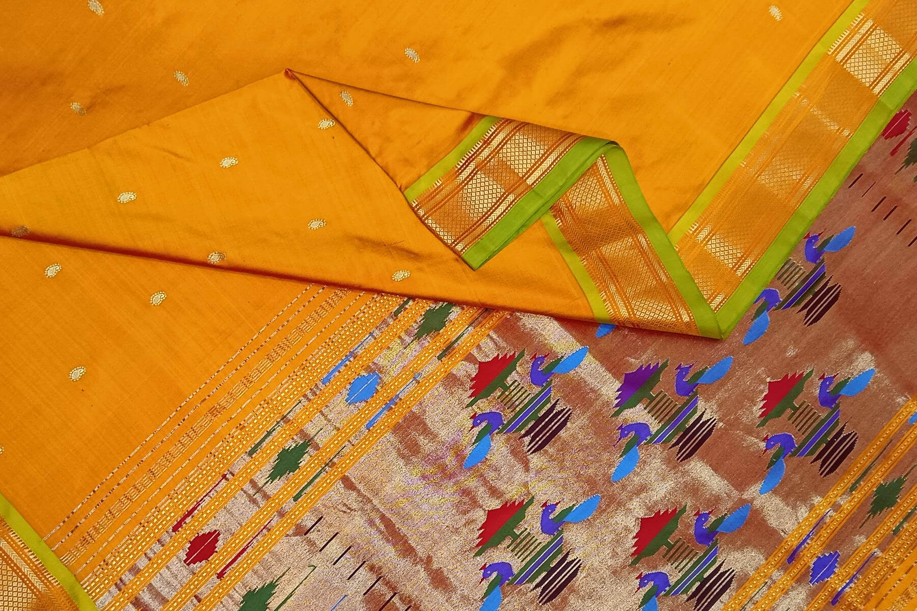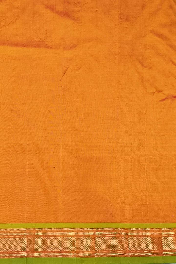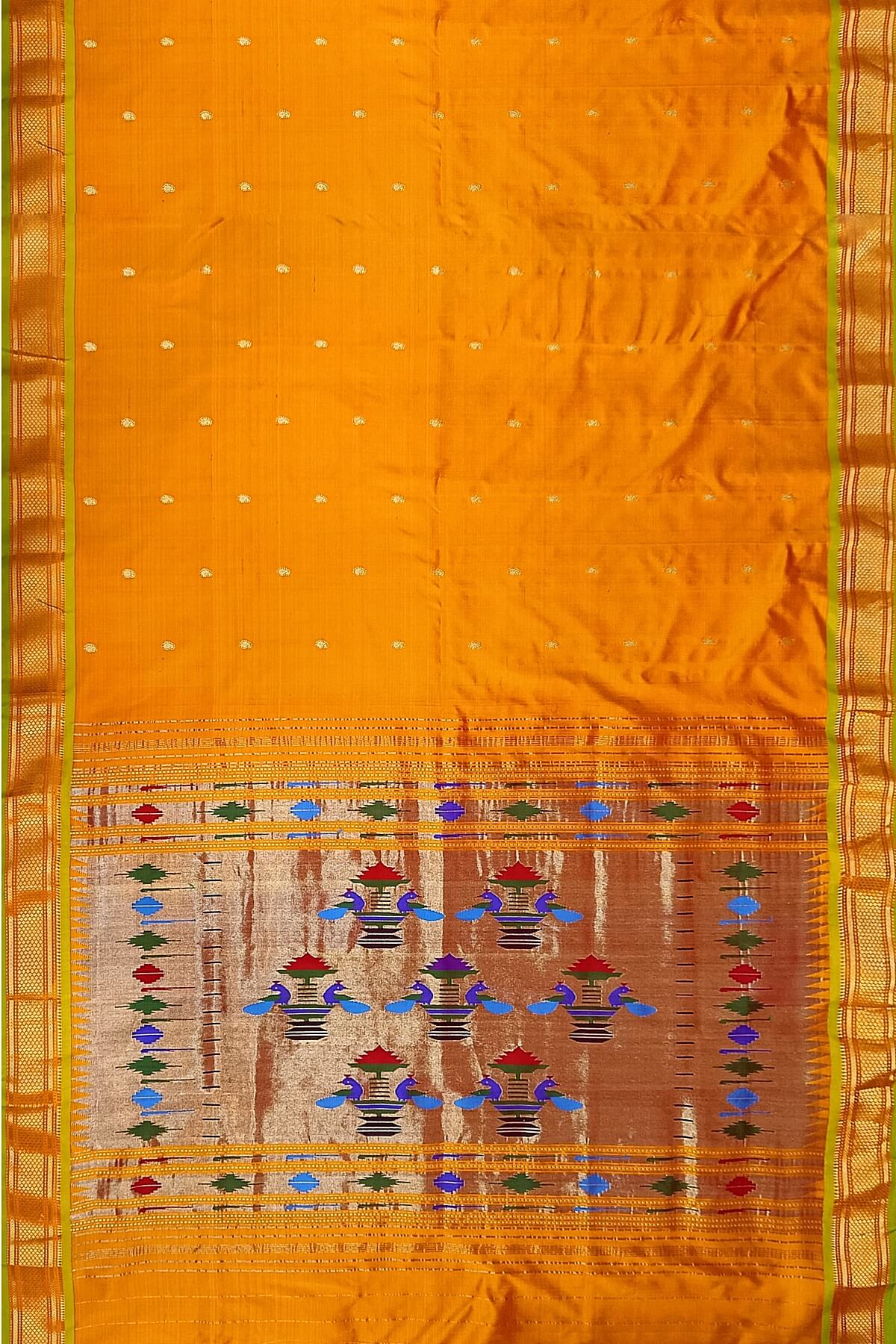 Description : Handwoven Paithani pure silk saree in mustard yellow with paisley motifs and a rich pallu with peacock motifs.