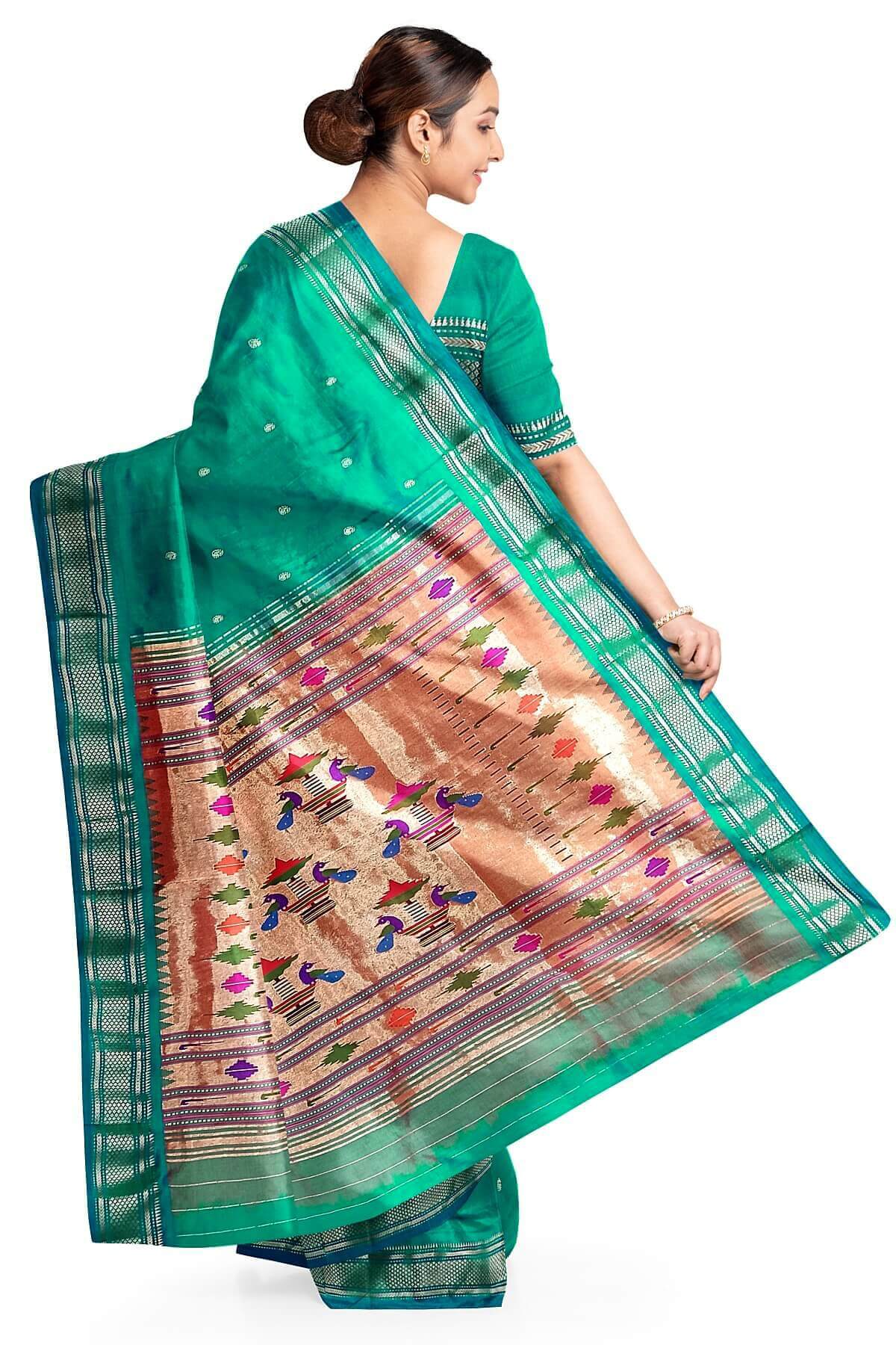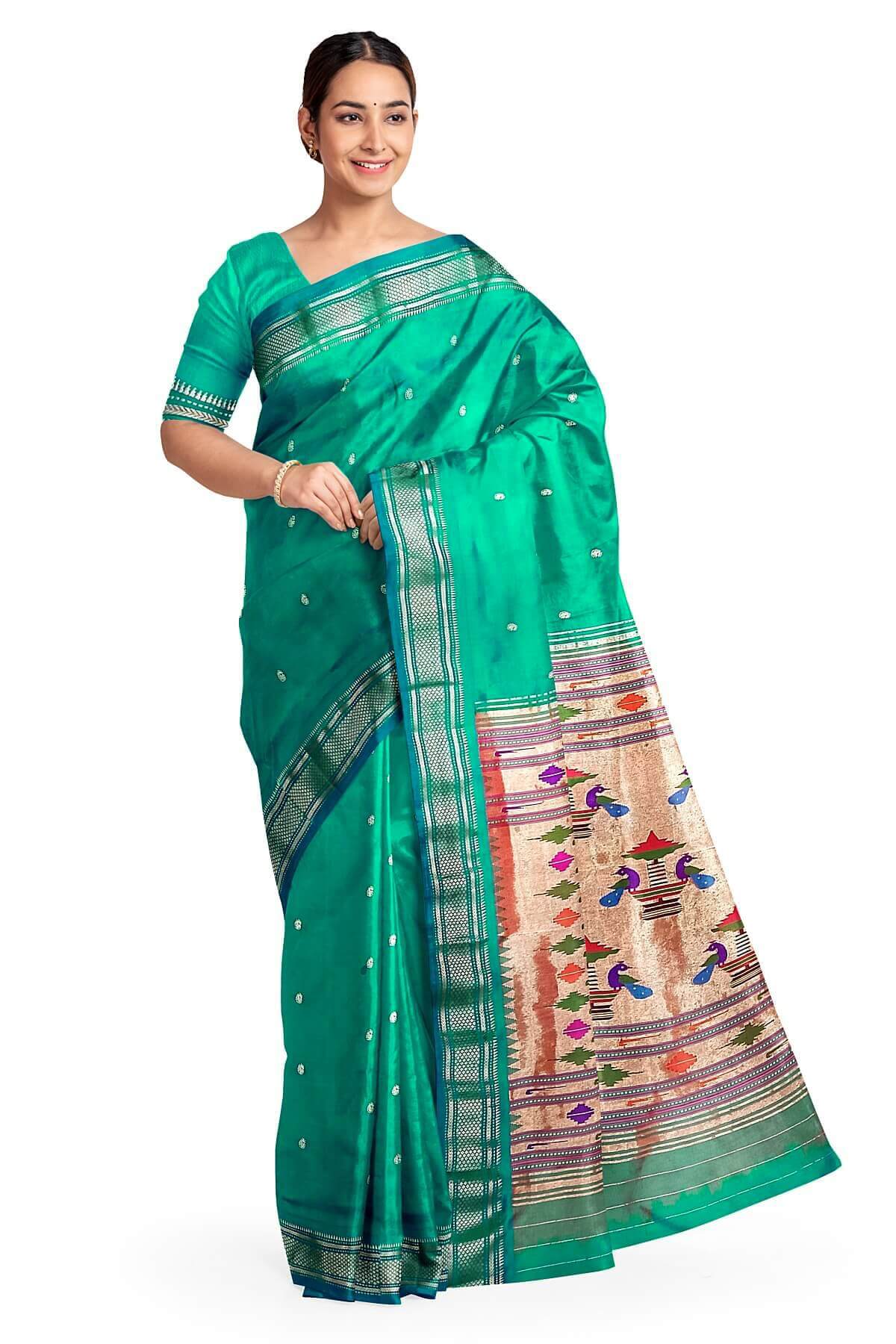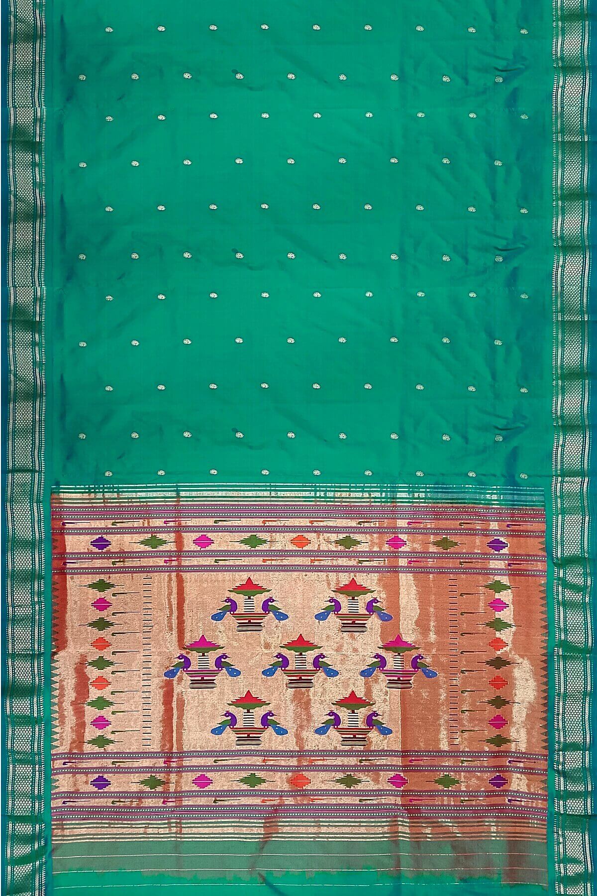 Description : Handwoven Paithani pure silk saree in rama green with mango motifs and a rich pallu with peacock motifs.