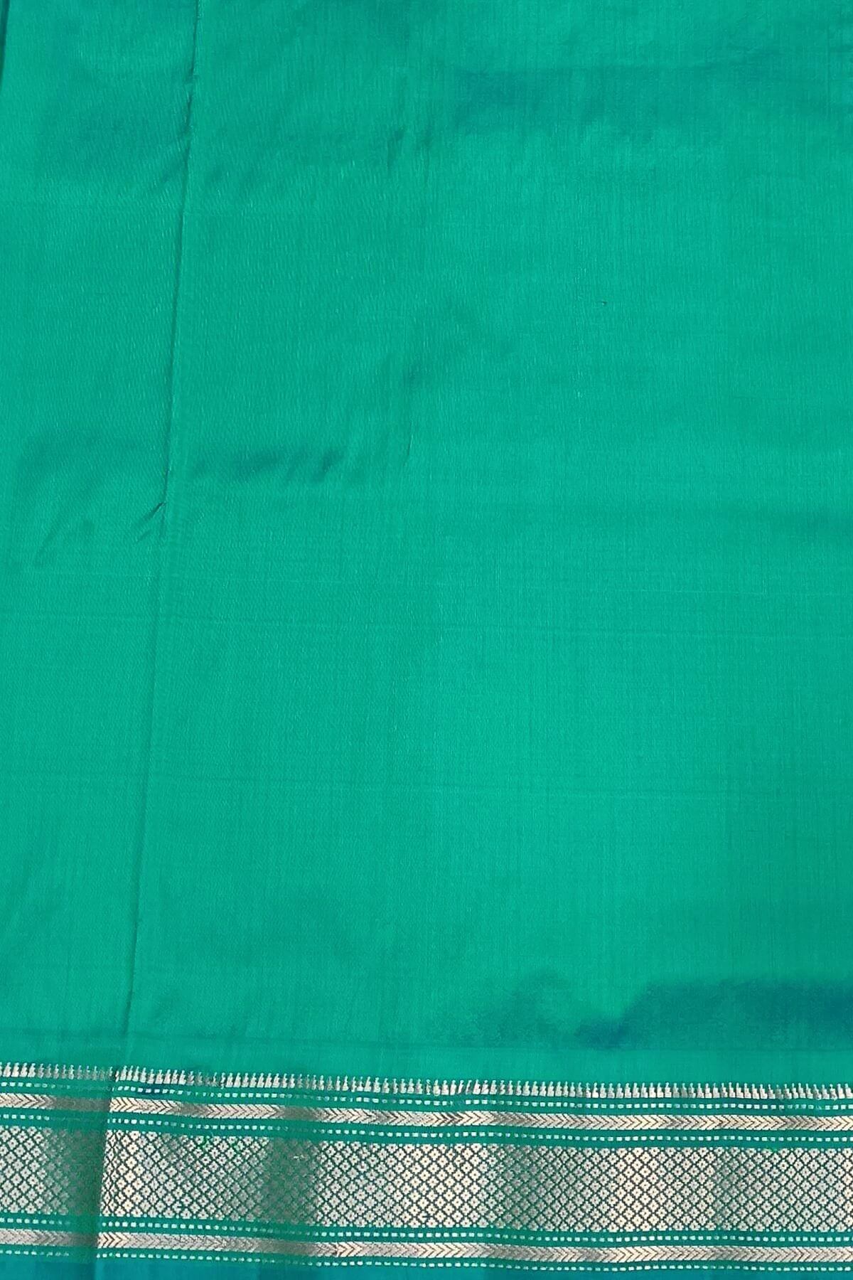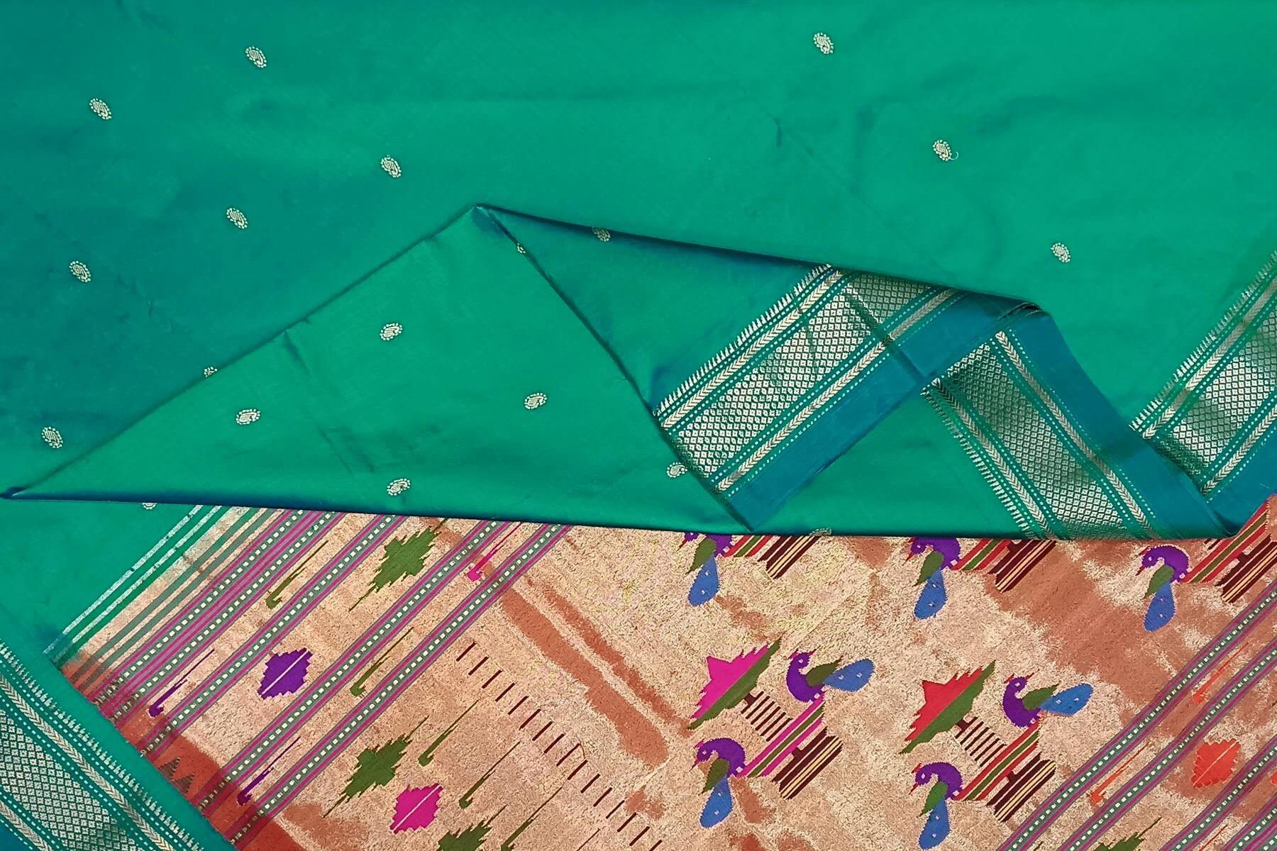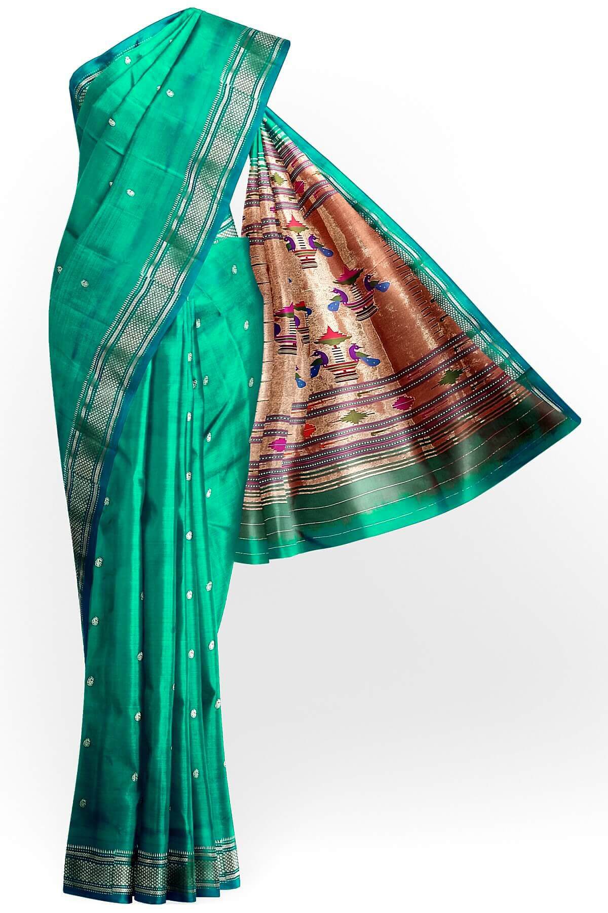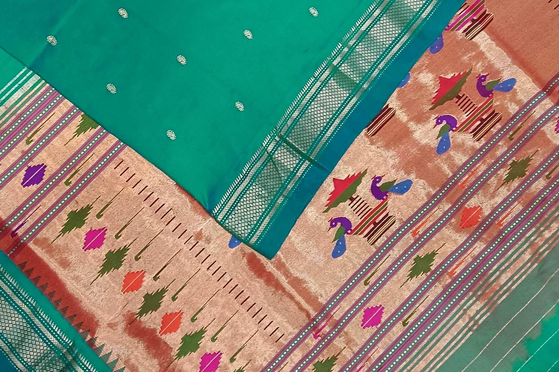 Description : Handwoven Paithani pure silk saree in rama green with mango motifs and a rich pallu with peacock motifs.