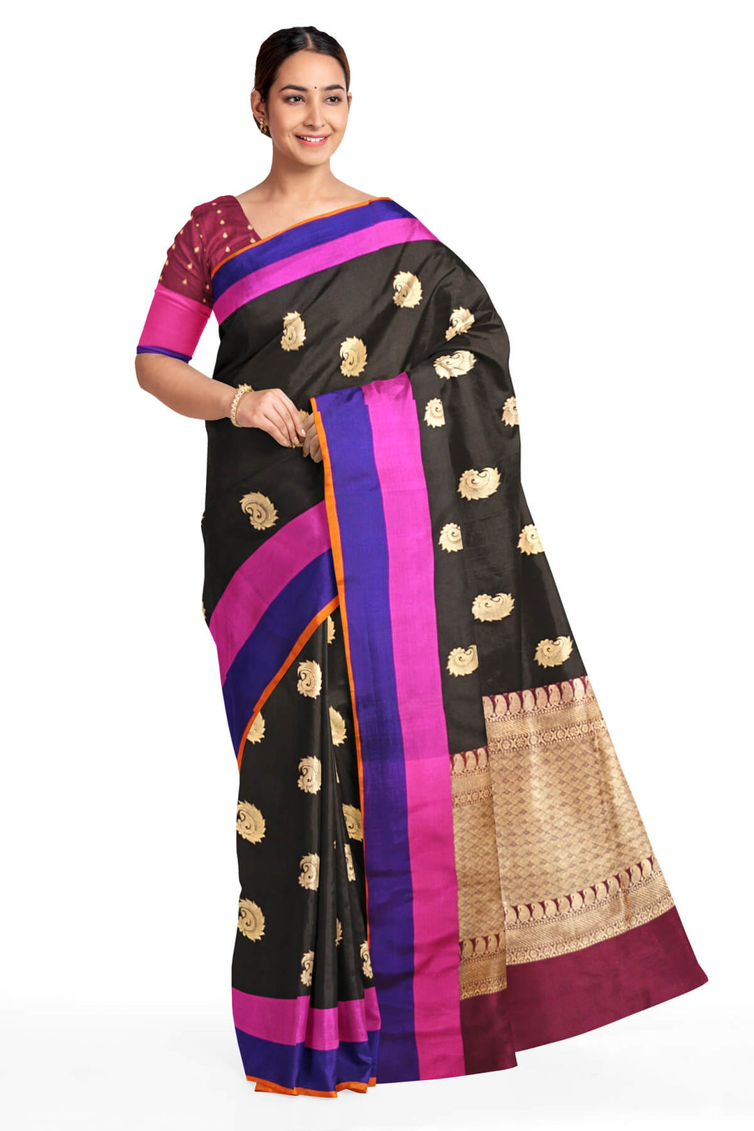 Handloom Banarasi katan pure silk saree in black with floral motifs