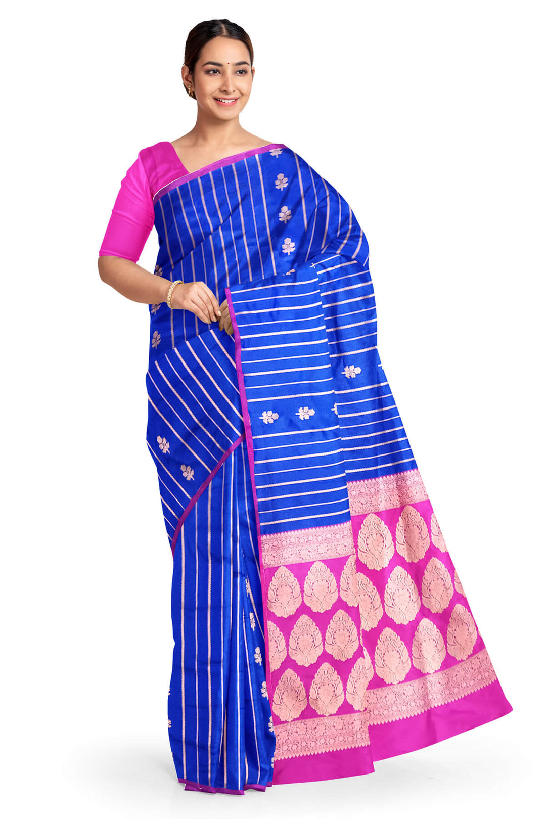 Banarasi katan pure silk saree in royal blue with stripes & floral motifs in gold.