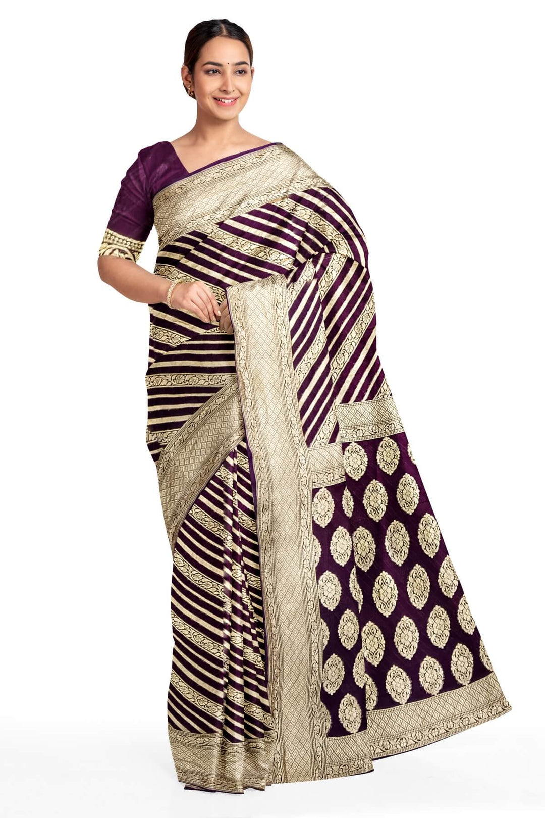Banarasi khaddi silk georgette saree in brown with diagonal lines on the body