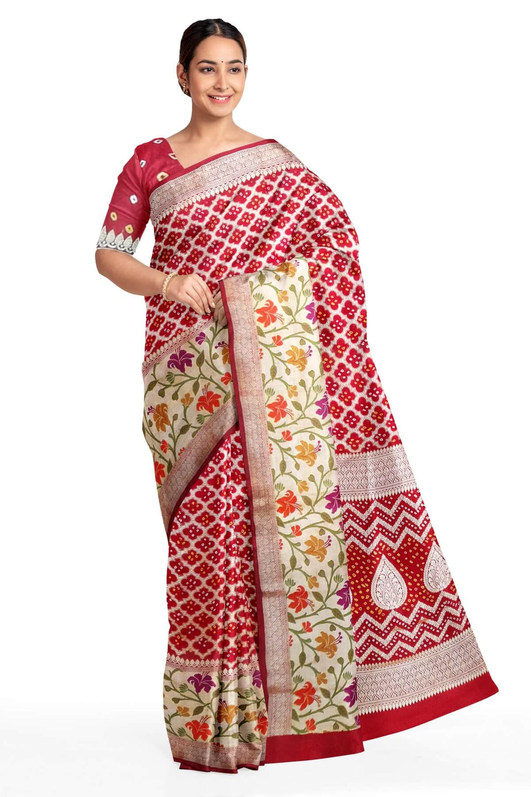 Handloom Banarasi silk saree in satin weave in red with floral motifs all over the body.