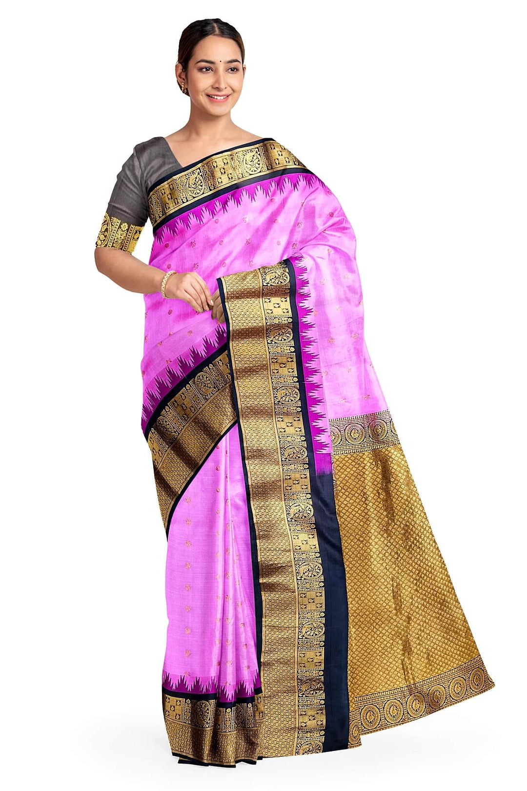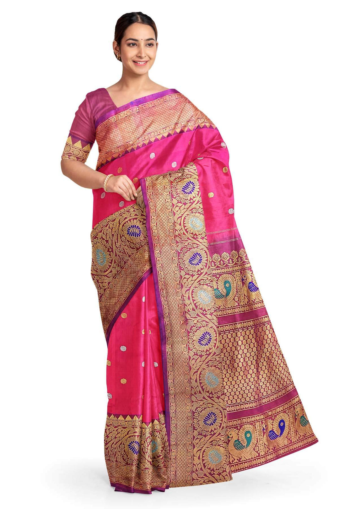 Gadwal pure silk saree in pink with peacock & disc motif in gold.