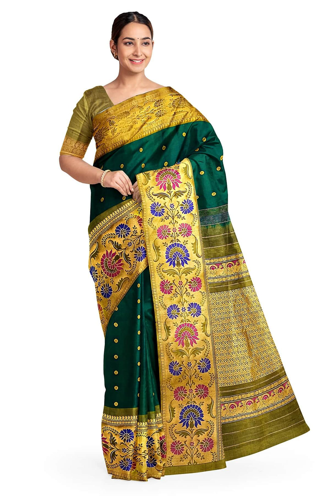 Handwoven Gadwal pure silk saree in bottle green with gold motifs all over the body.