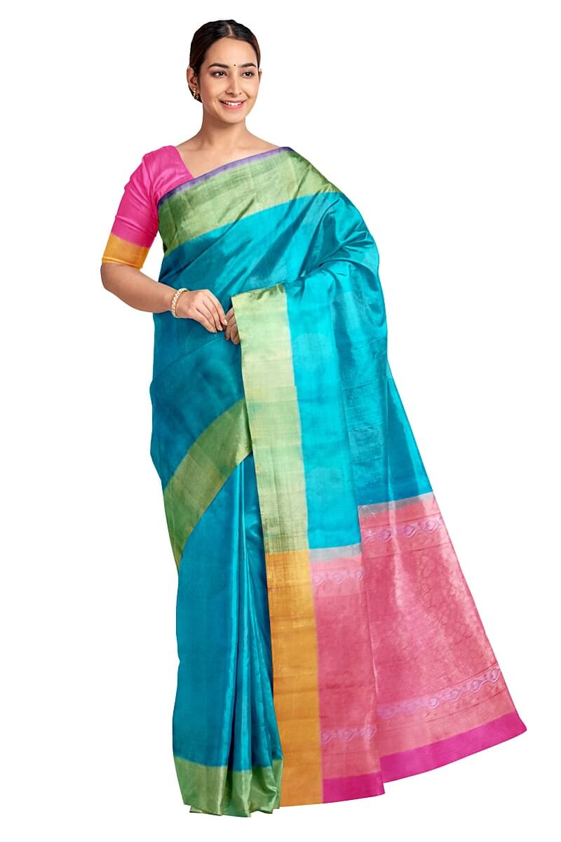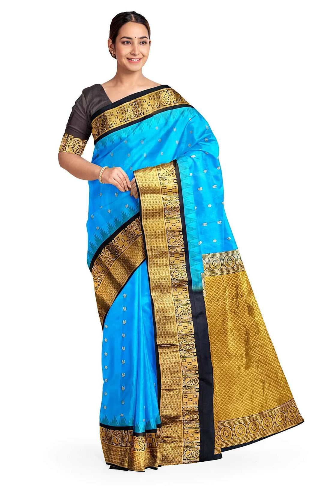 Gadwal pure silk saree in copper sulphate blue with peacock & disc motif in gold.