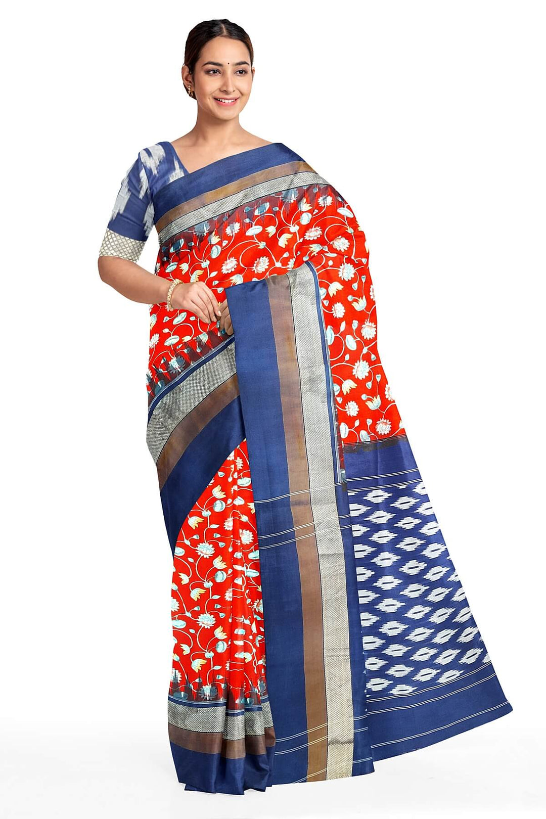 Pure silk saree in red & blue with round & floral motifs in satin weave
