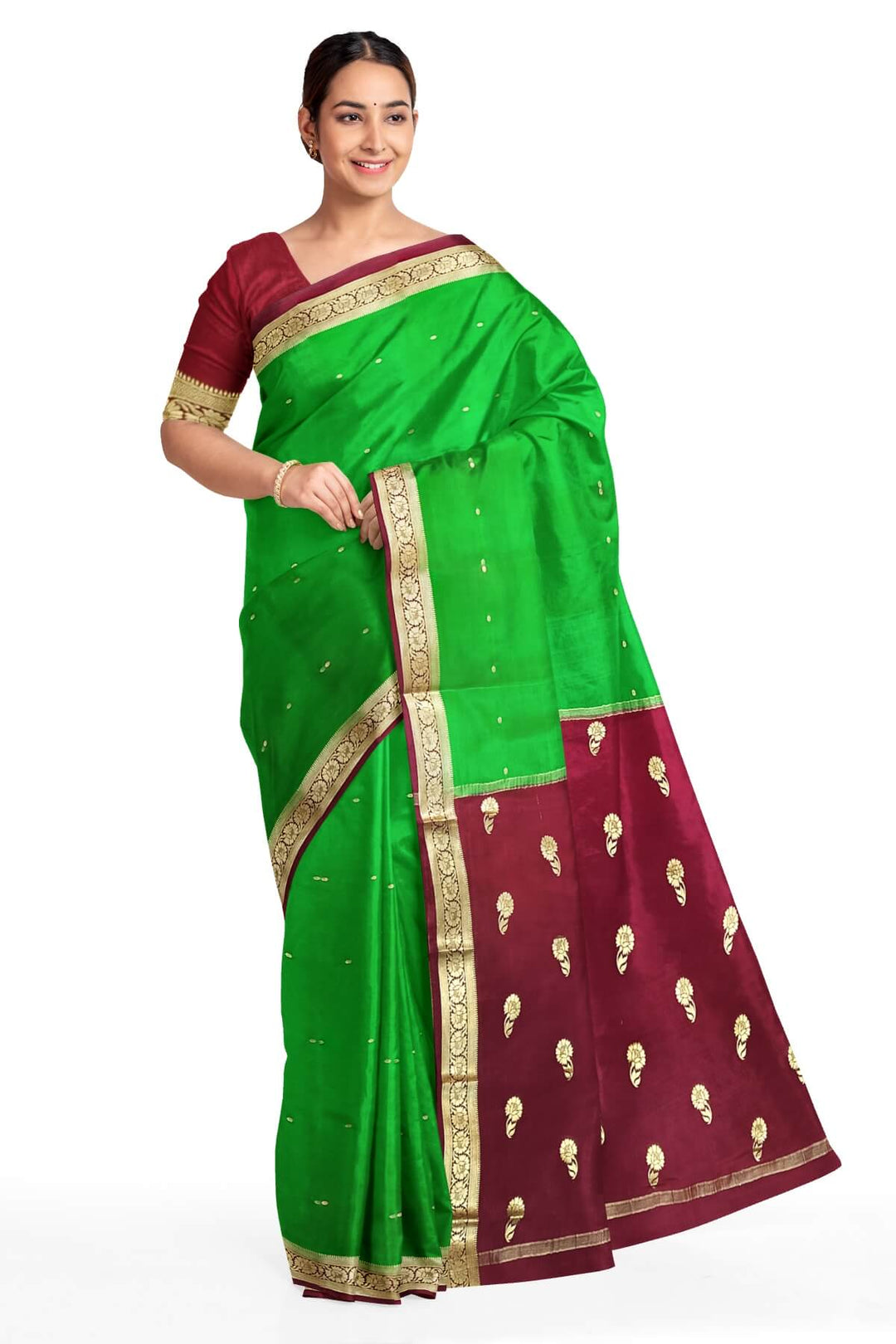 Mysore crepe pure silk saree in green with small motifs all over the body.