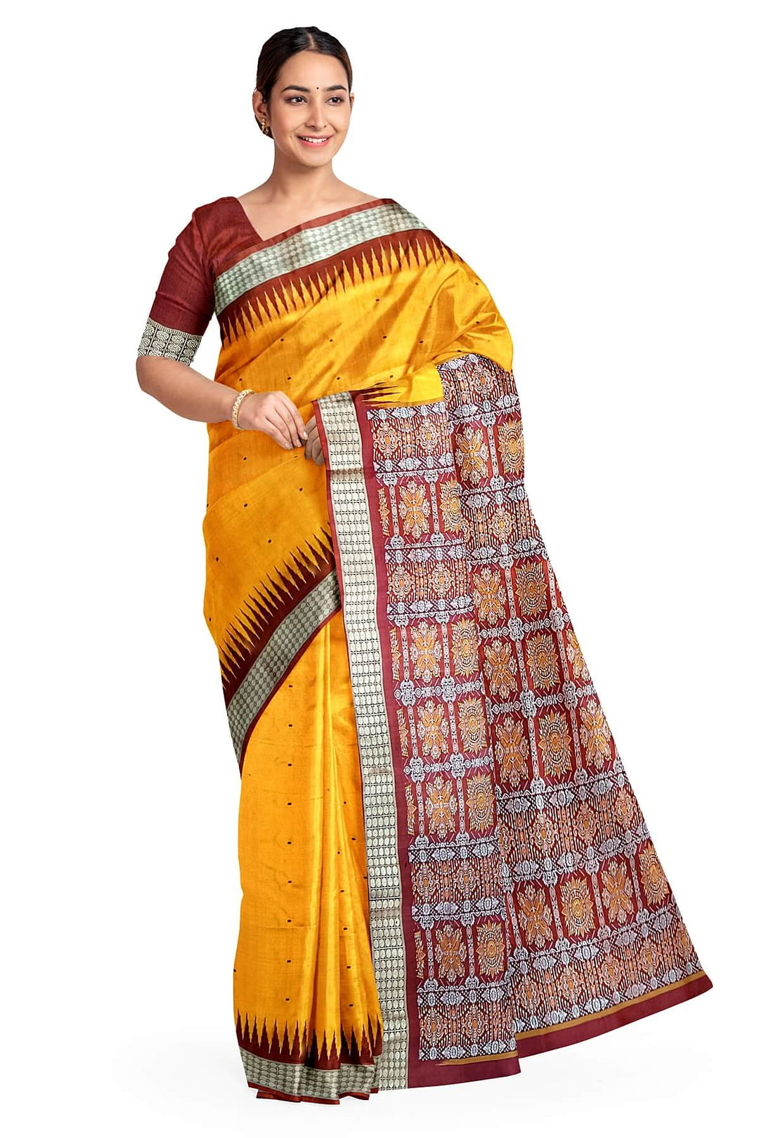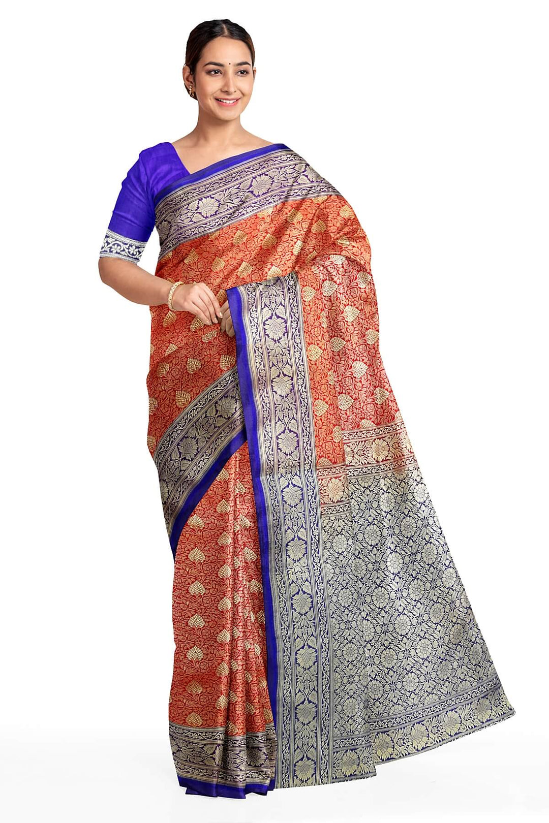 Desi tussar pure silk saree in orange colour floral motifs on the body and a zari pallu in floral pattern