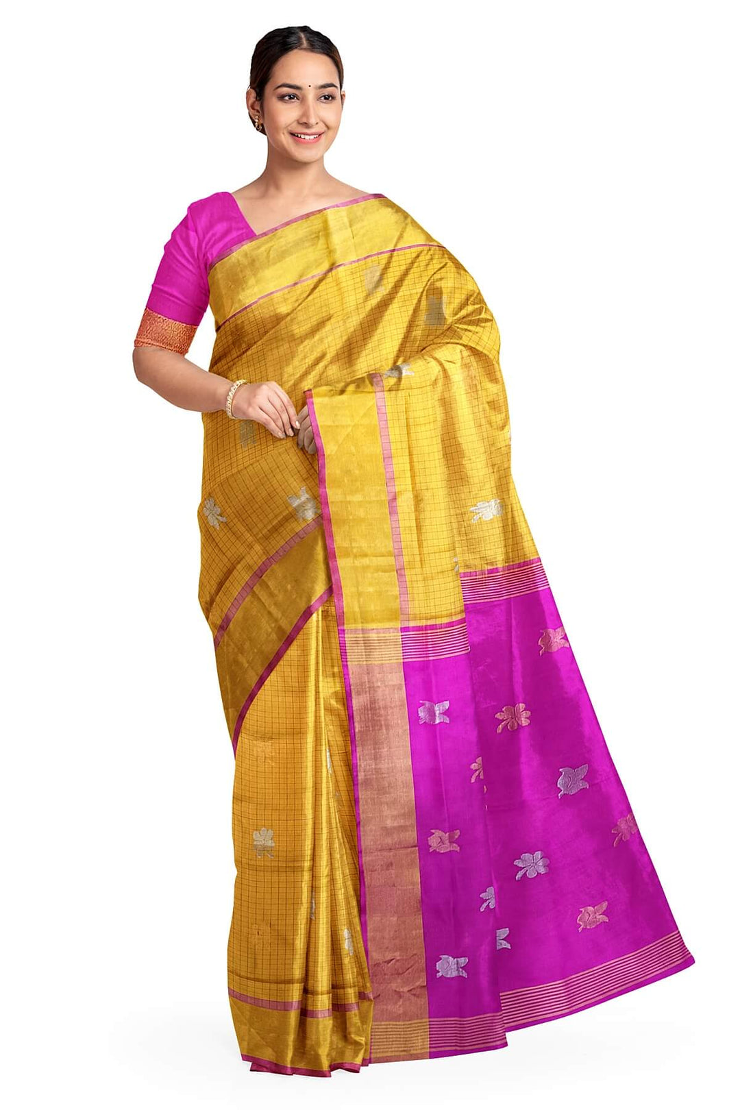 Handwoven Uppada pure silk saree in yellow in fine checks with gold & silver motifs.
