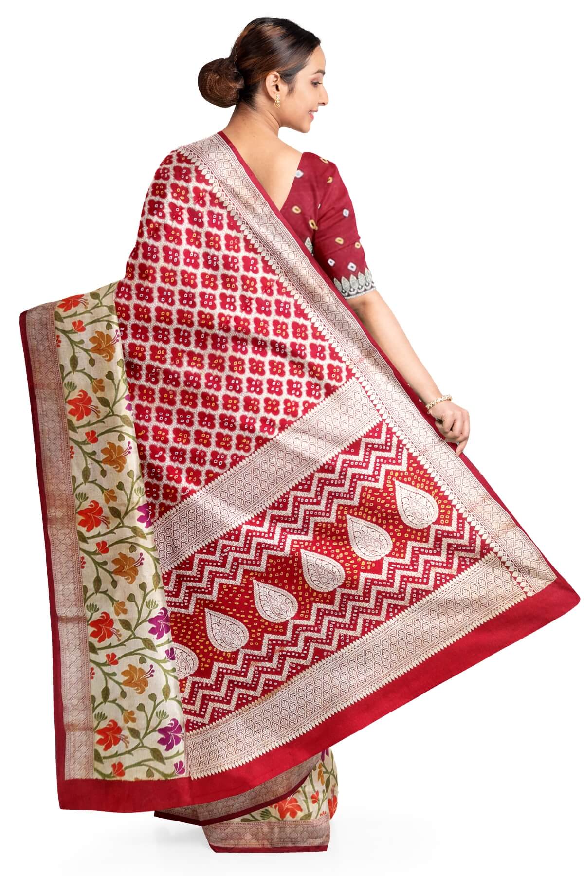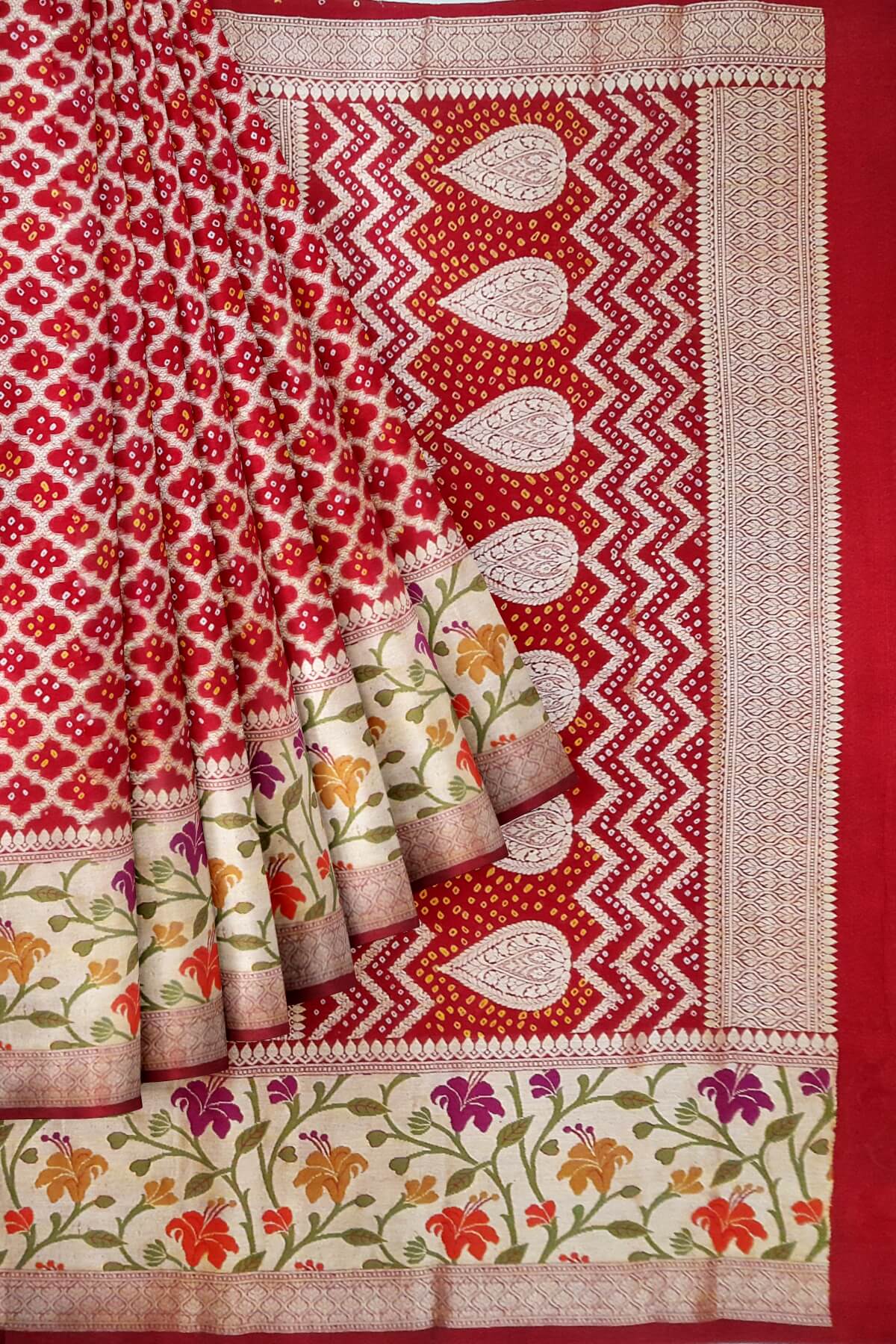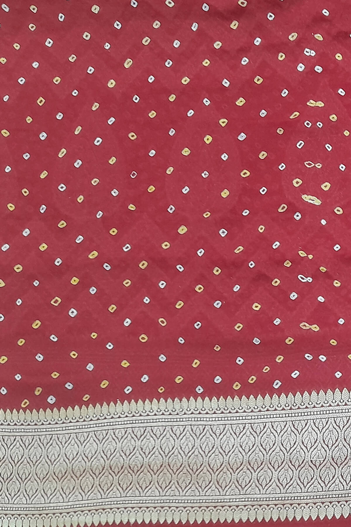 Description: Maroon colour Banarasi khaddi silk georgette bandhini saree is bedecked with silver, diamond pattern. The gorgeous cream floral jaal border, and the rich zari pallu complement beautifully.