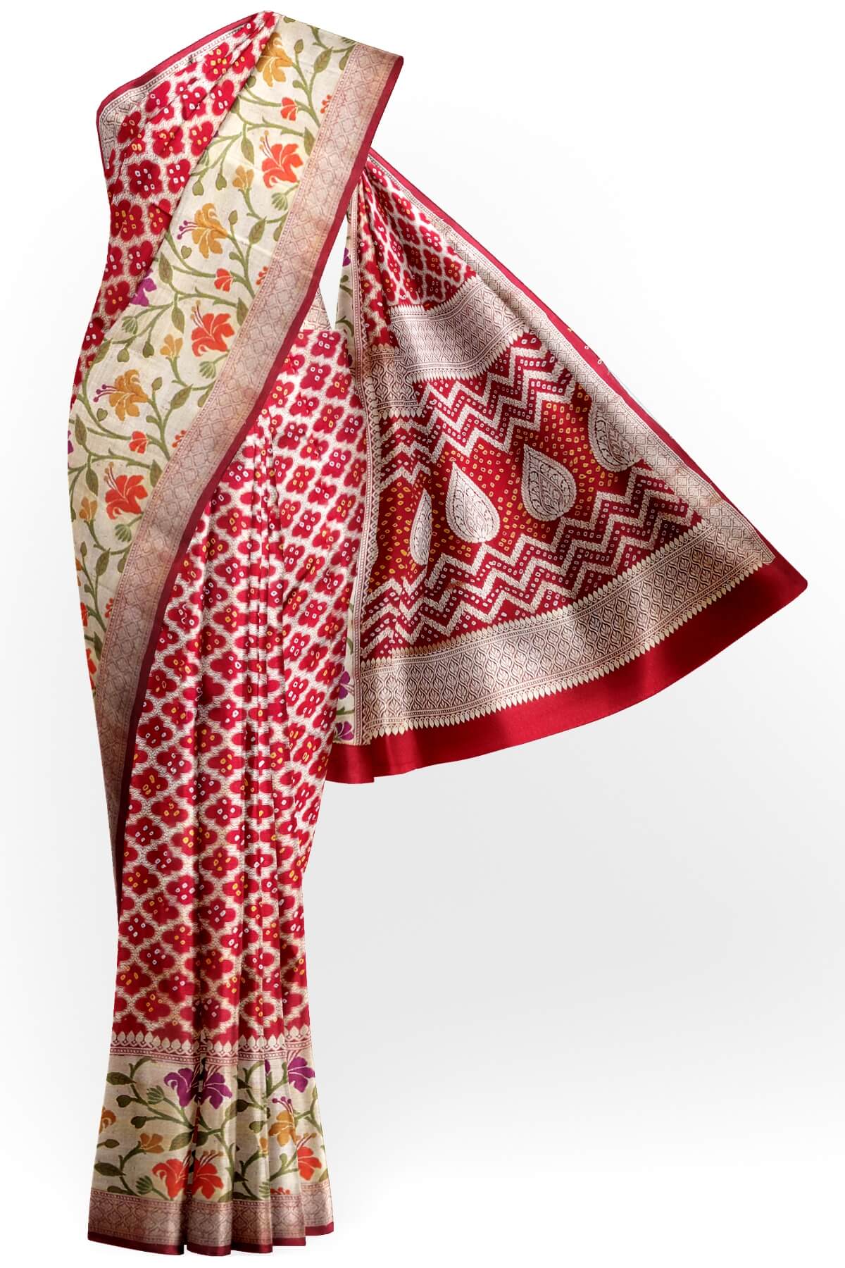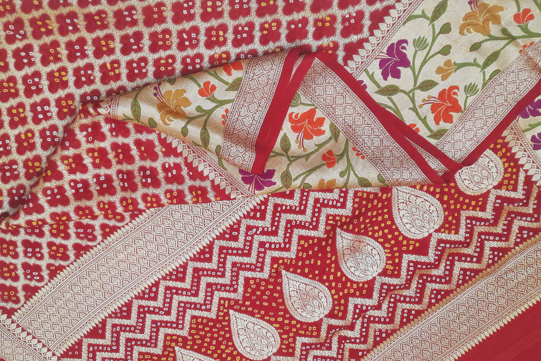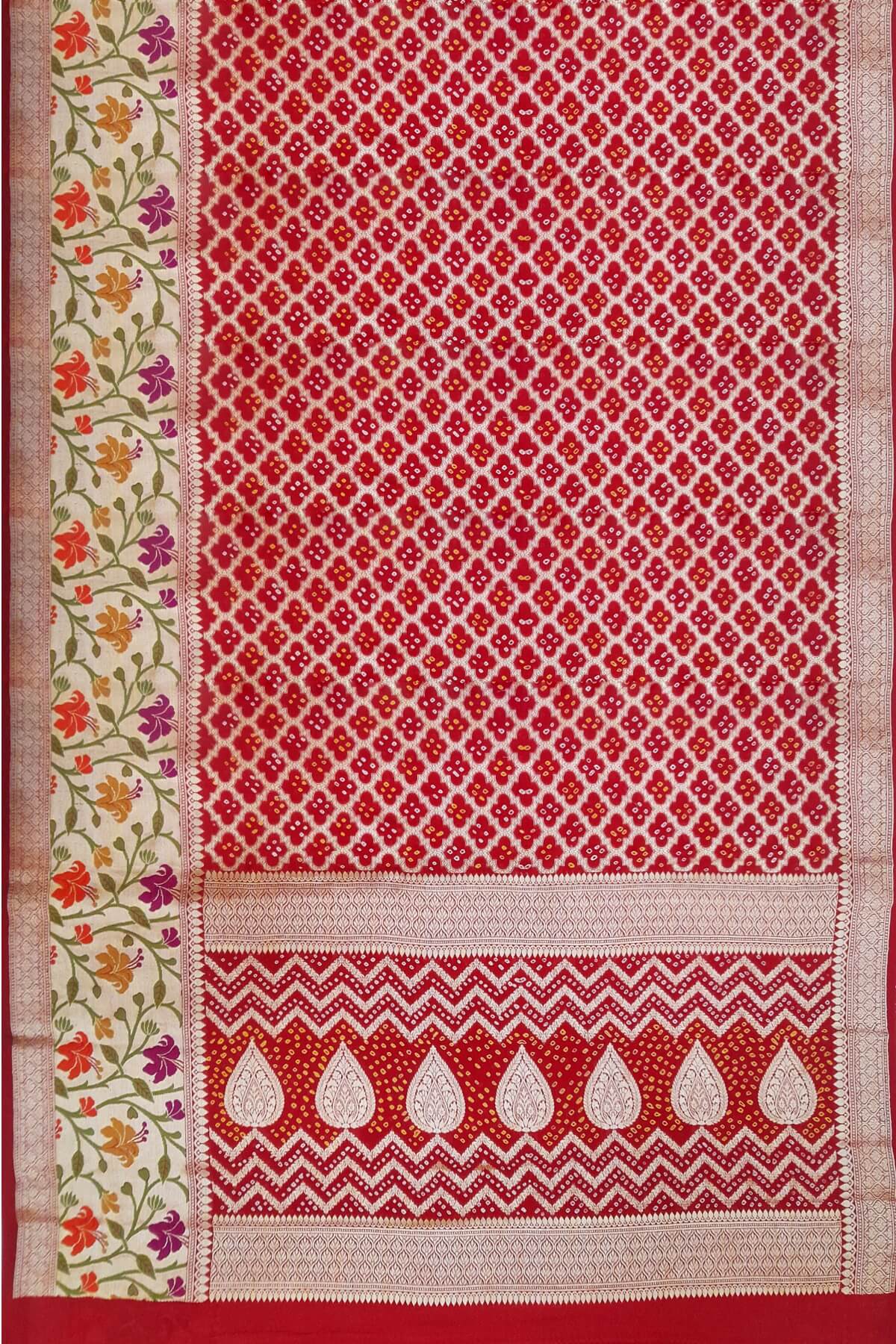 Description: Maroon colour Banarasi khaddi silk georgette bandhini saree is bedecked with silver, diamond pattern. The gorgeous cream floral jaal border, and the rich zari pallu complement beautifully.