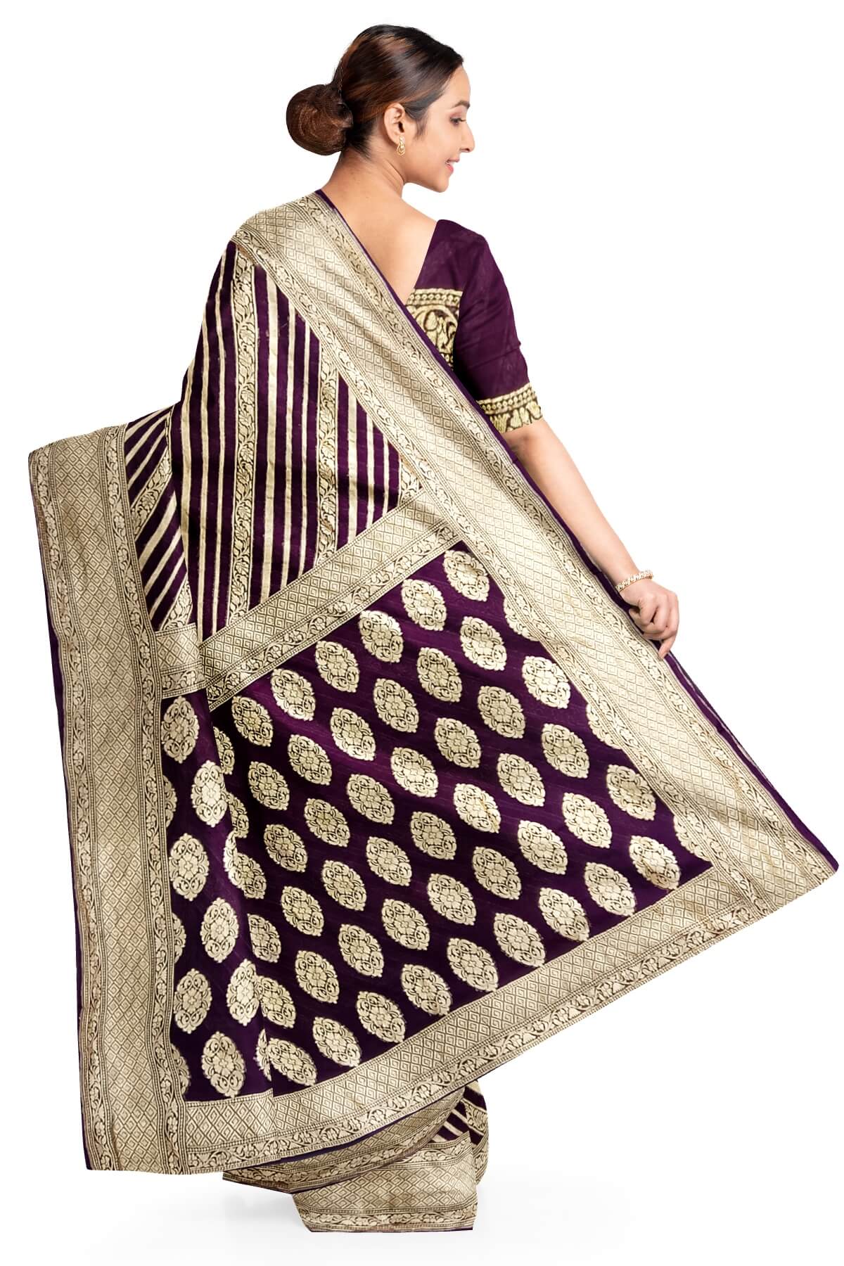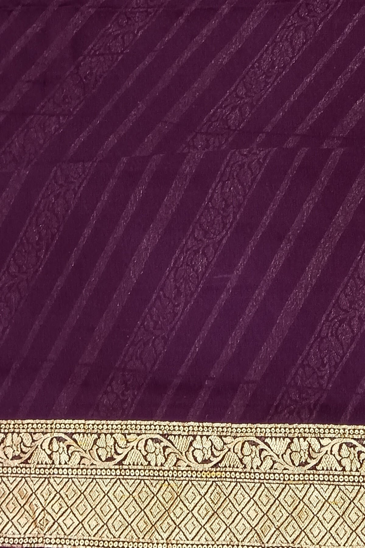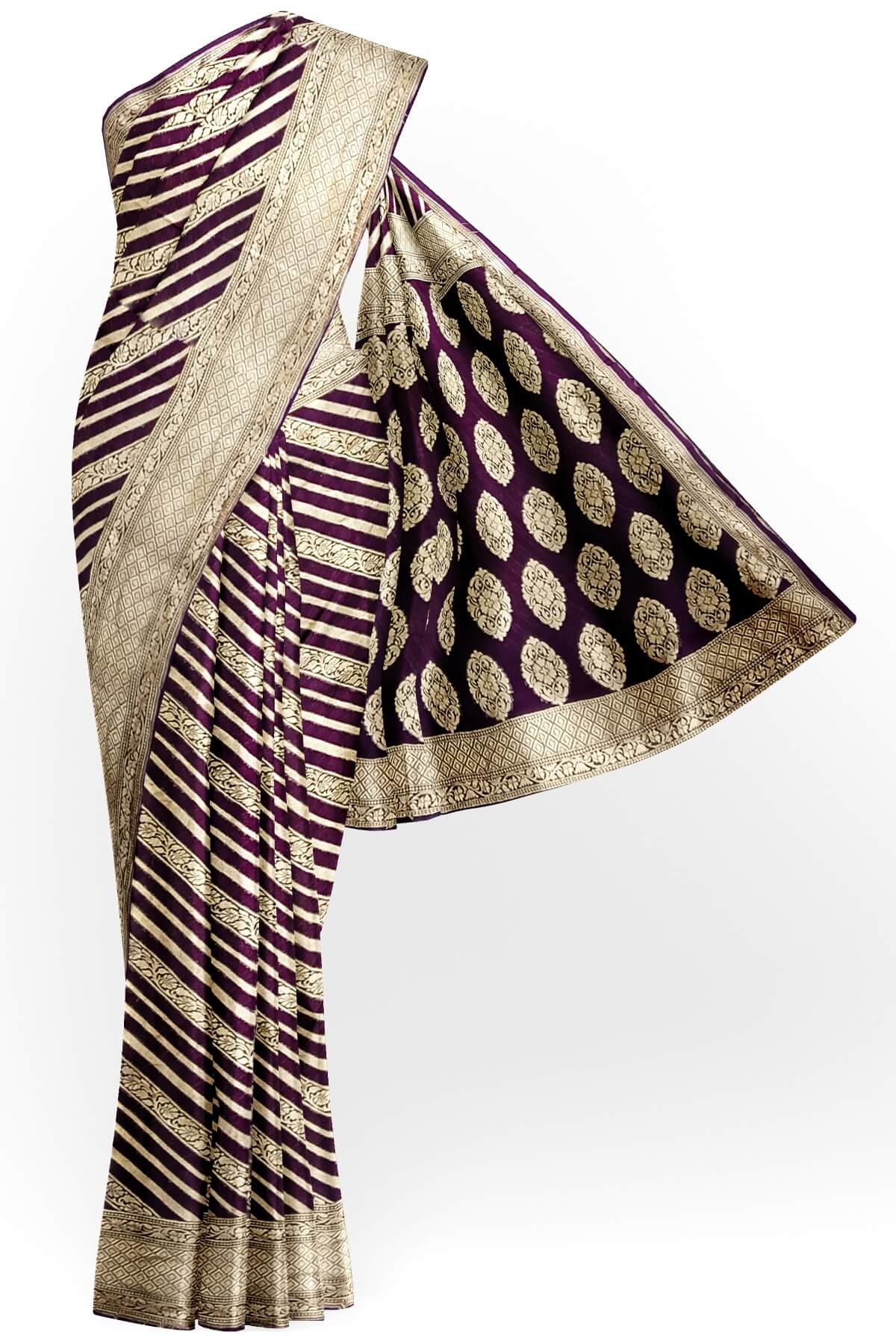 Description: Handwoven Banarasi silk georgette saree in brown with diagonal lines on the body and floral pattern in pallu.