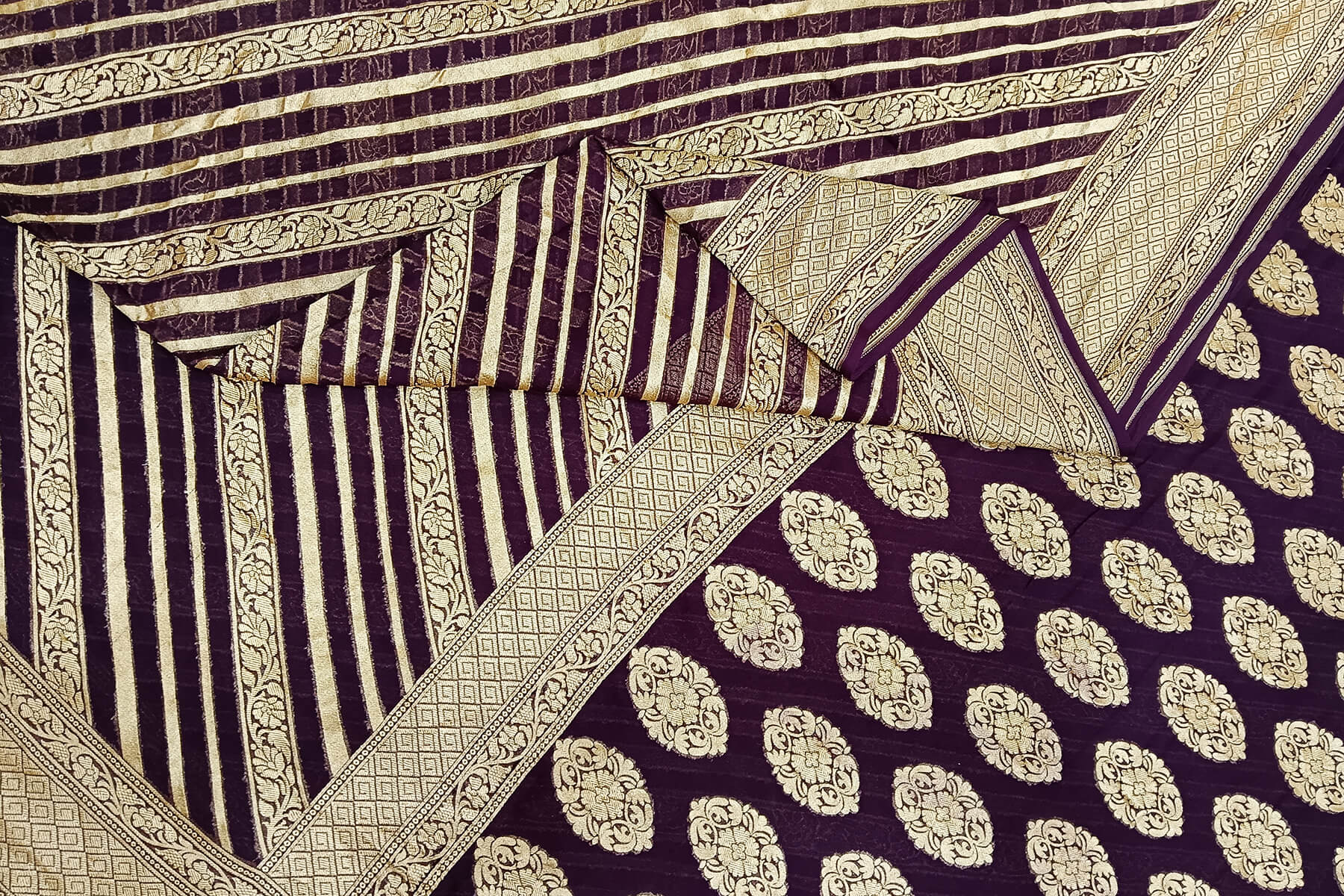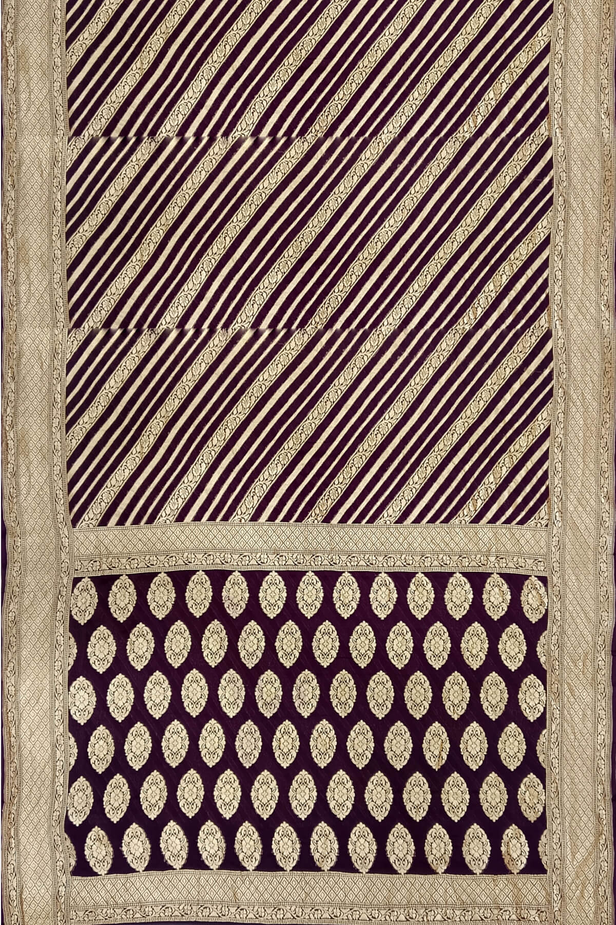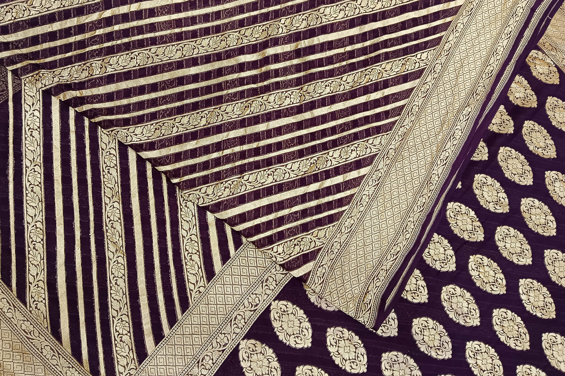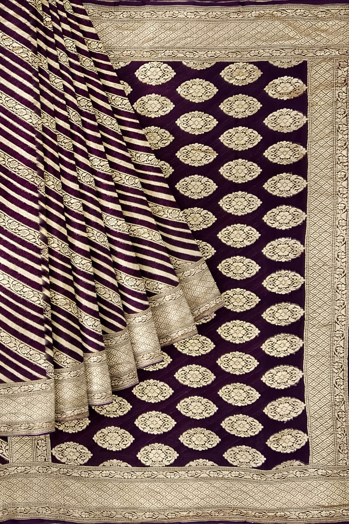 Description: Handwoven Banarasi silk georgette saree in brown with diagonal lines on the body and floral pattern in pallu.