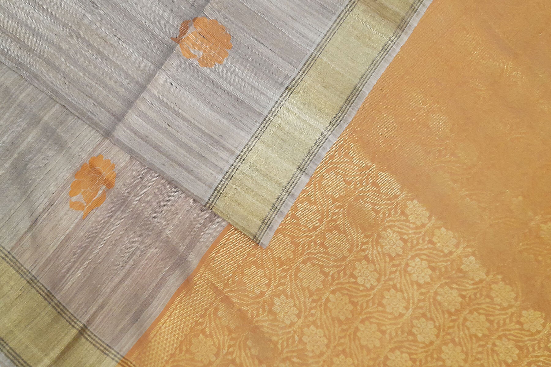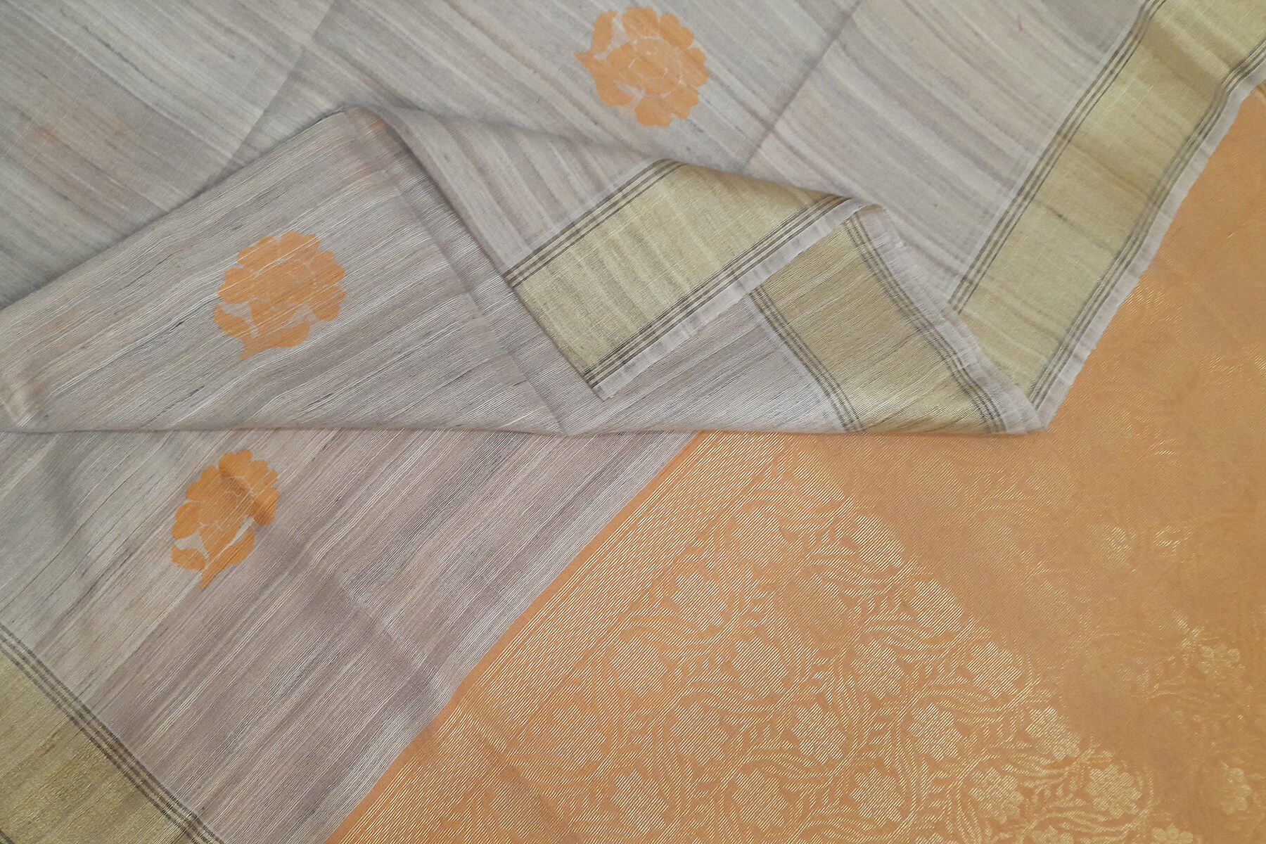 Description : Desi tussar pure silk saree in orange colour floral motifs on the body and a zari pallu in floral pattern