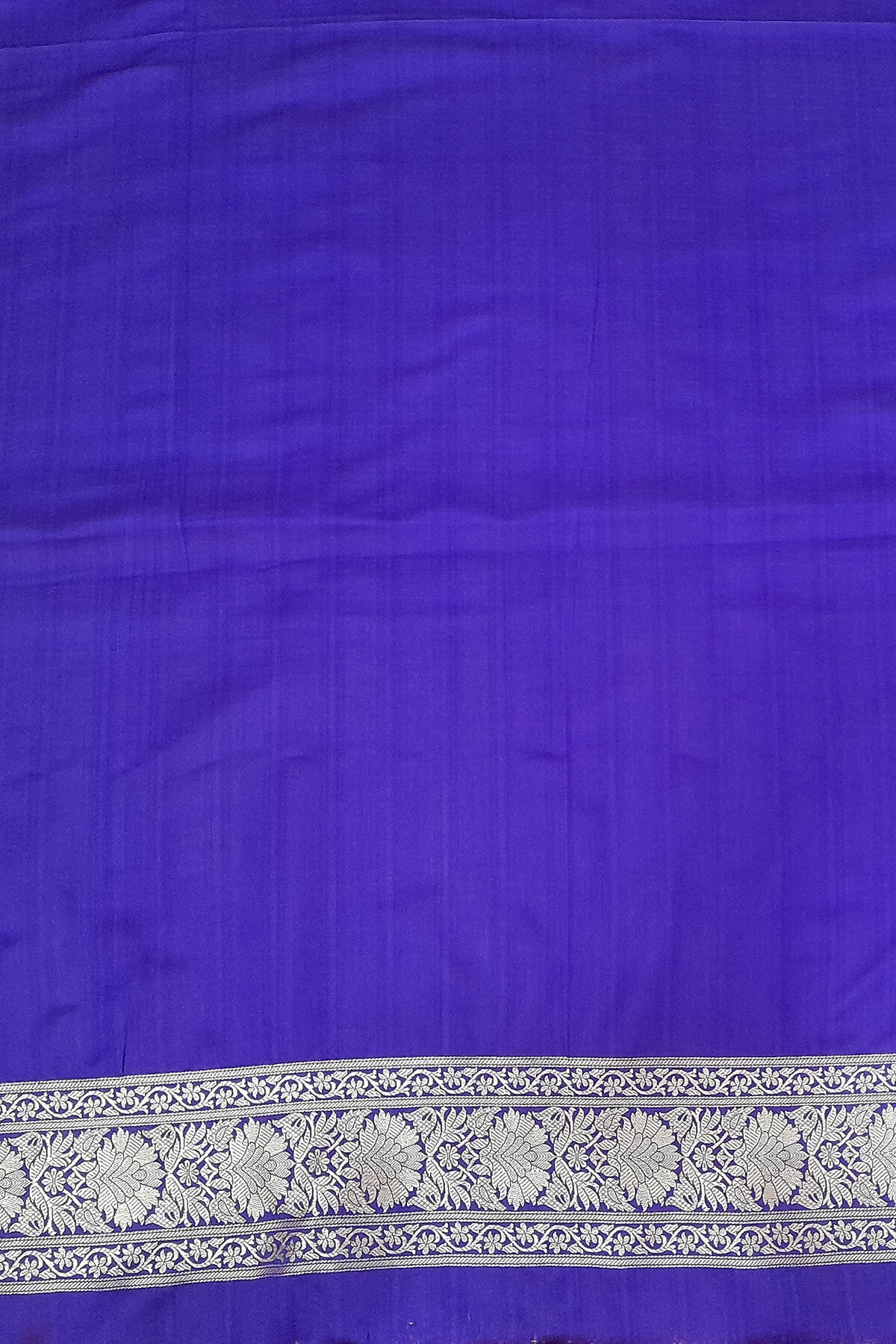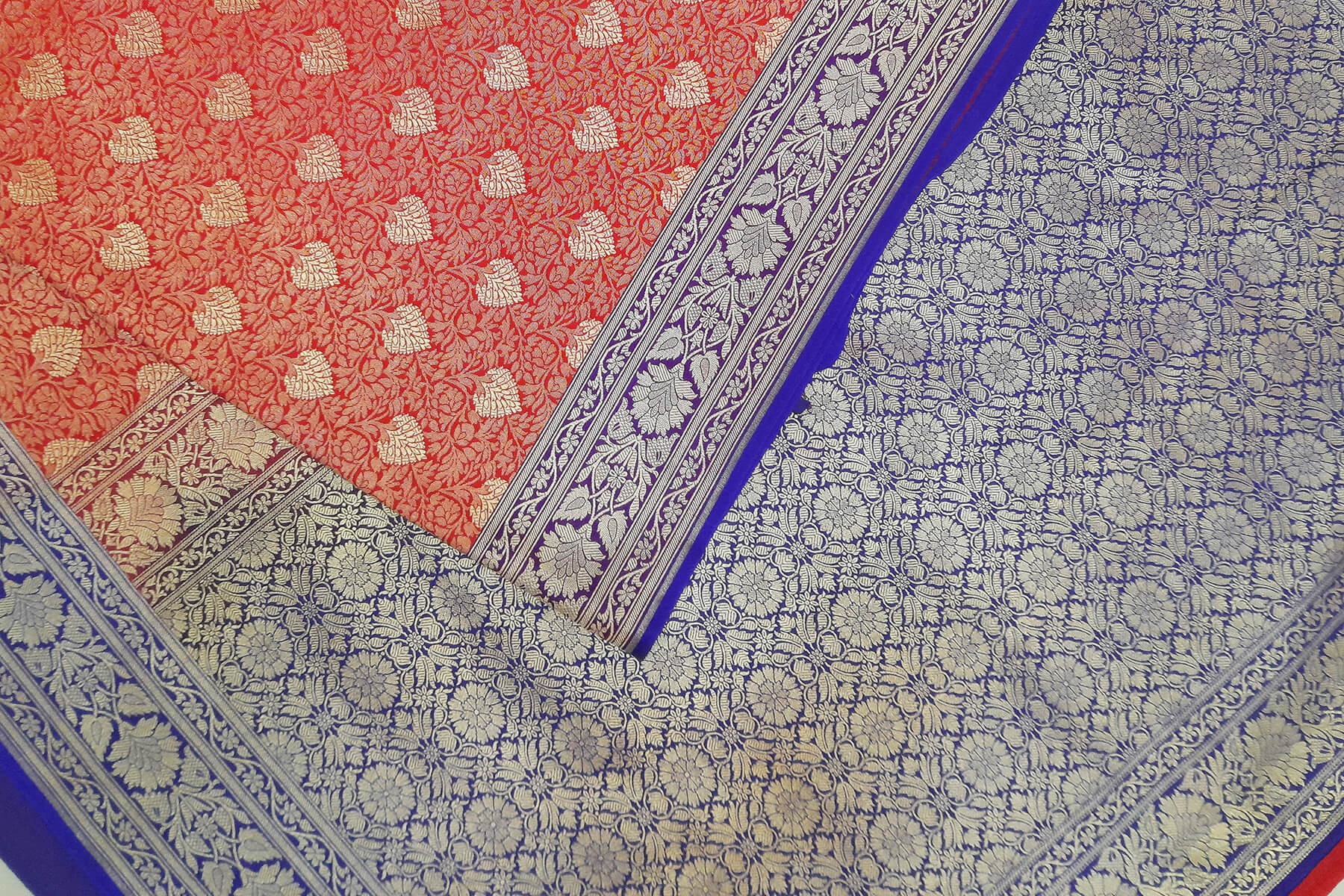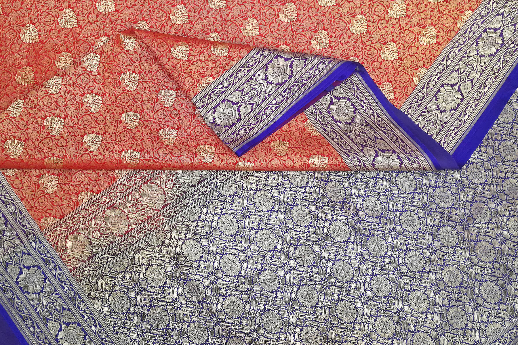 Description: Handloom Banarasi silk saree in satin weave in red with floral motifs all over the body.