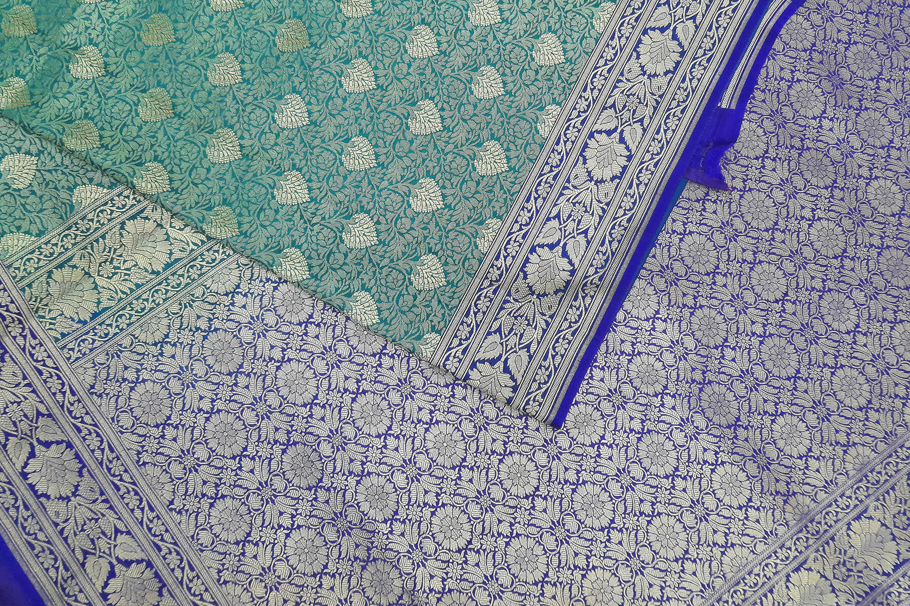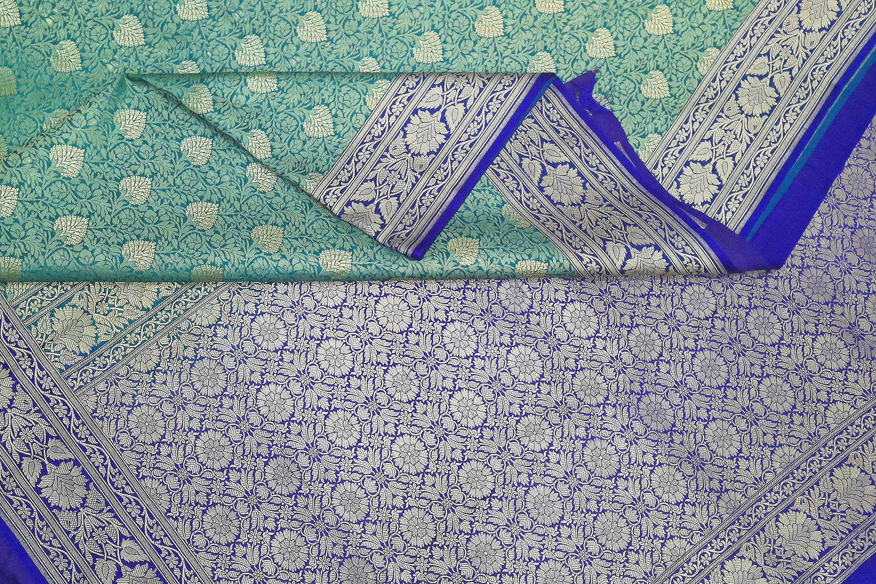 Description: Handloom Banarasi silk saree in satin weave in red with floral motifs all over the body.