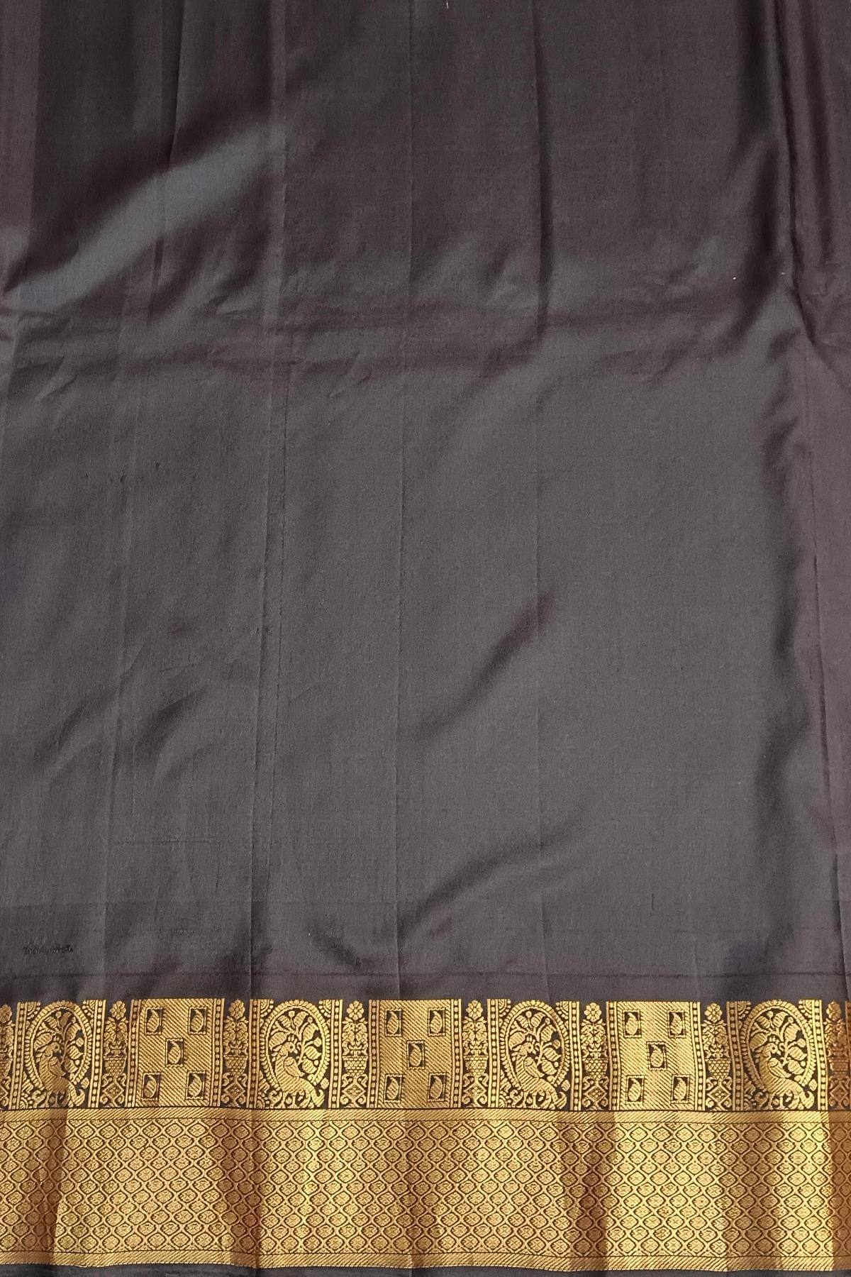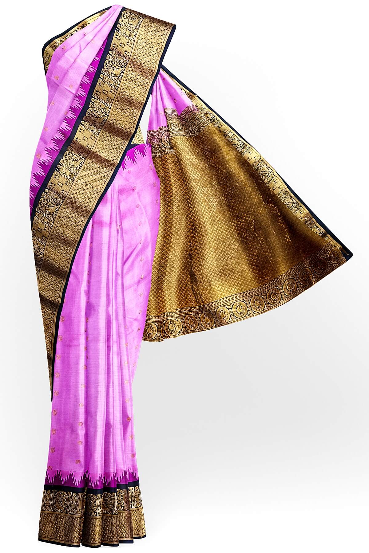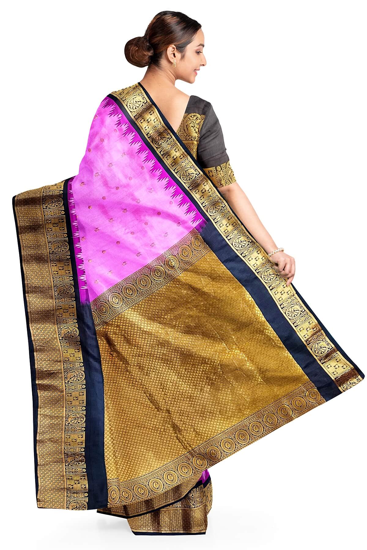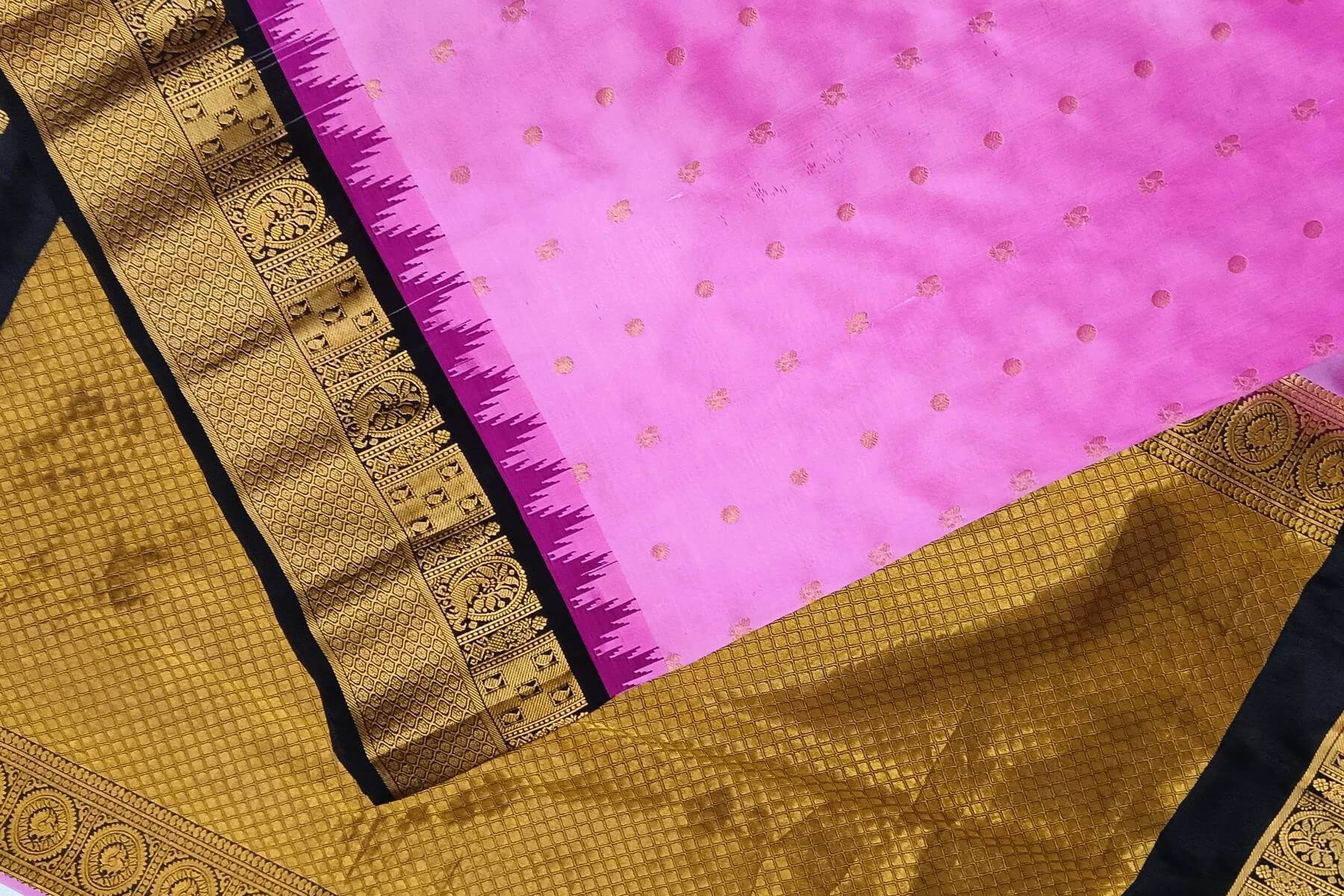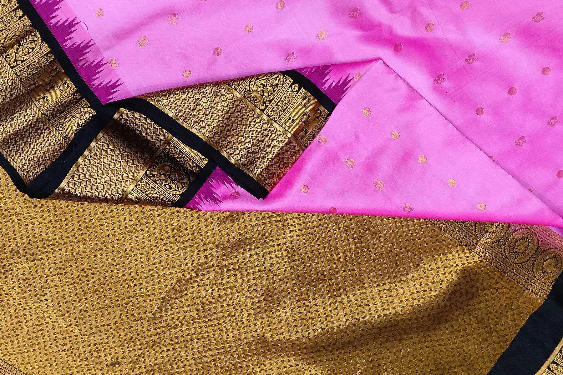 Description : Gadwal pure silk saree in pink with peacock & disc motif in gold. This is enhanced with rich contrast pallu in brown and a 7 inch border with parrot motifs.
