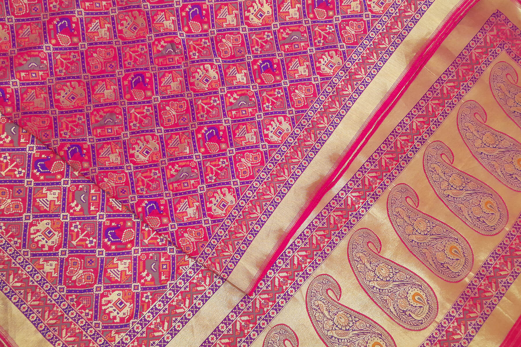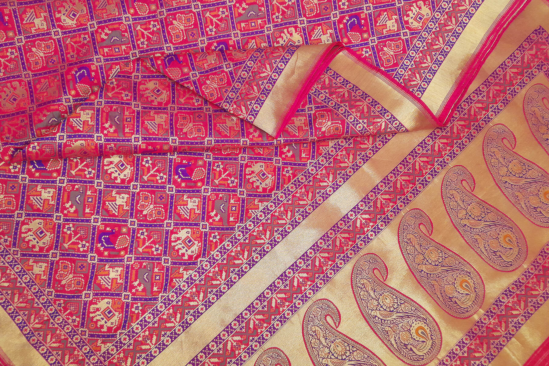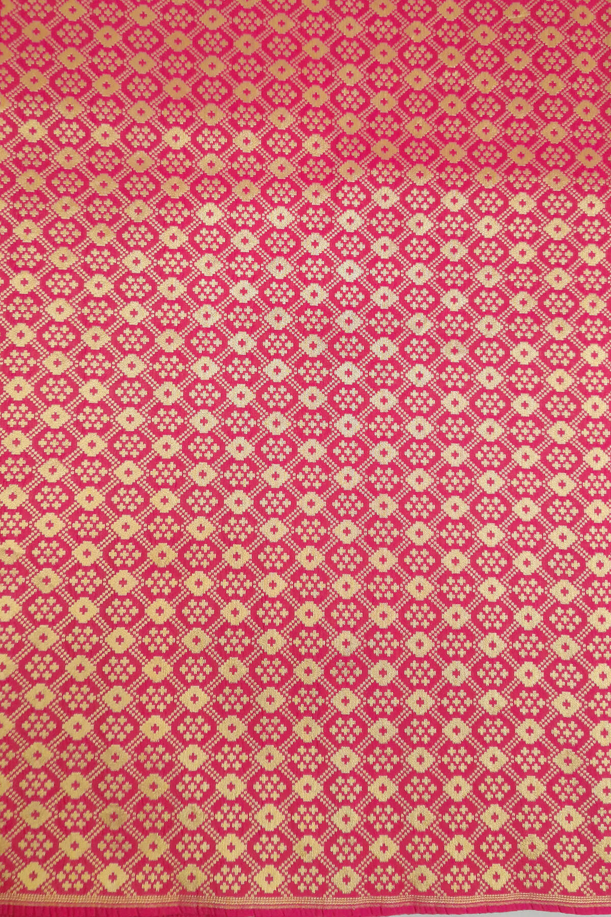 Description: Handwoven Banarasi silk saree in narikunj pattern in pink with contrast pallu