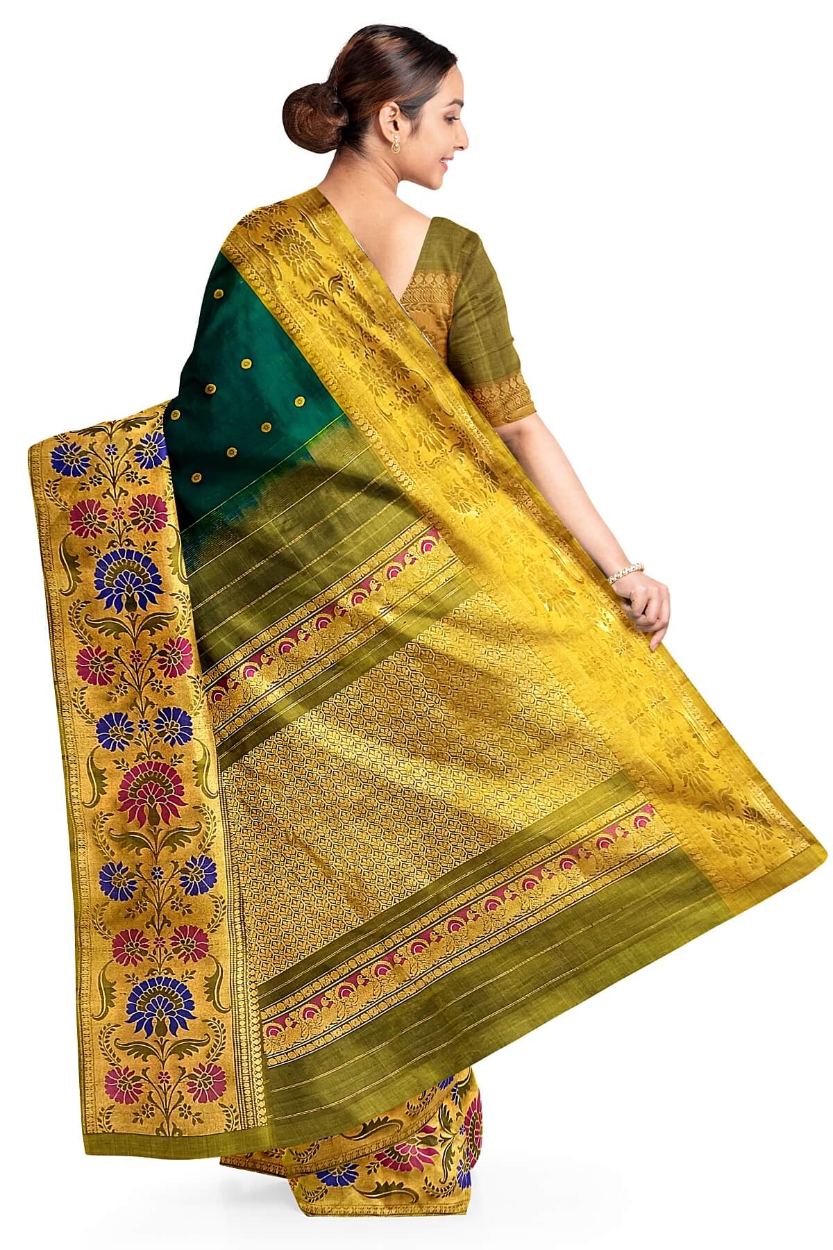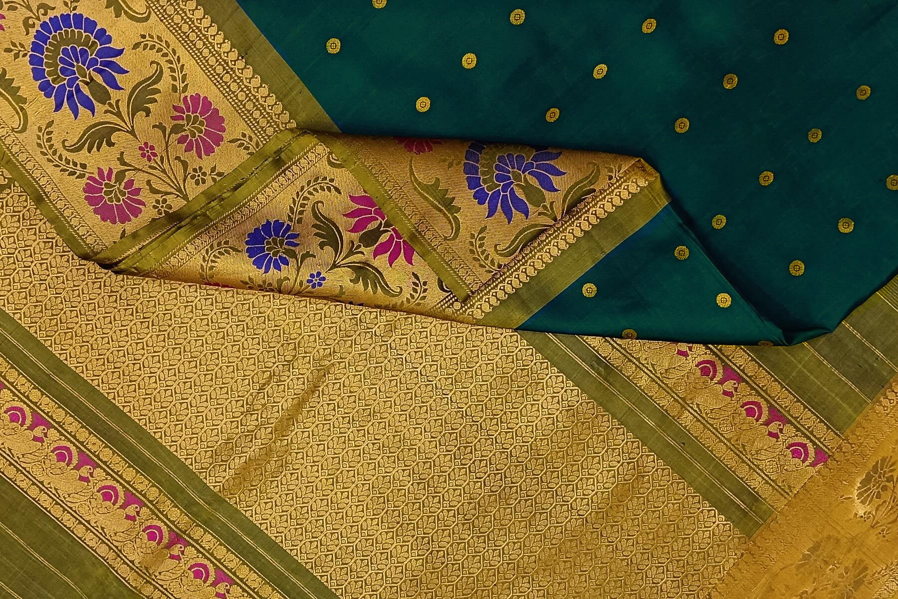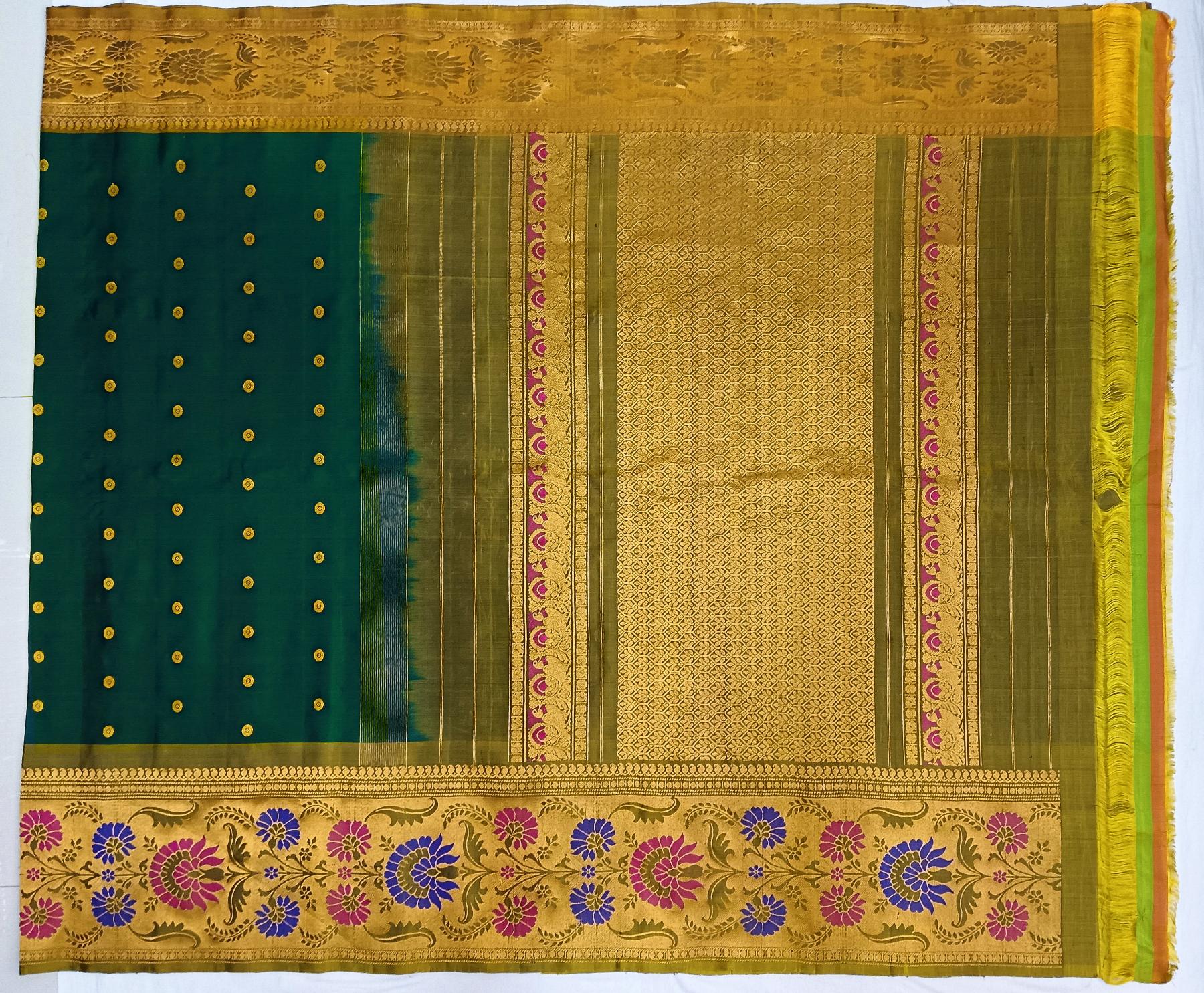Description : Handwoven Gadwal pure silk saree in bottle green with gold motifs all over the body. This is complemented by colourful meenakari work on pallu & border