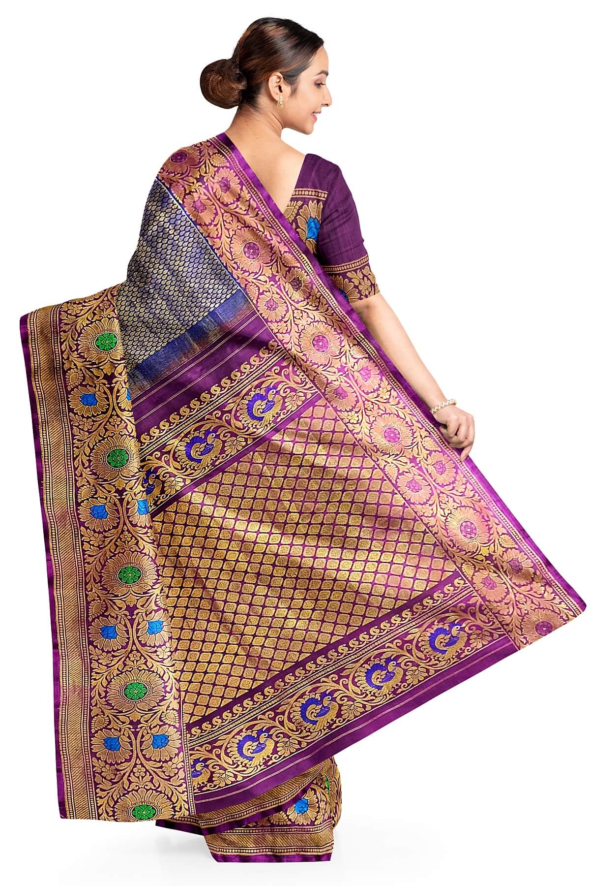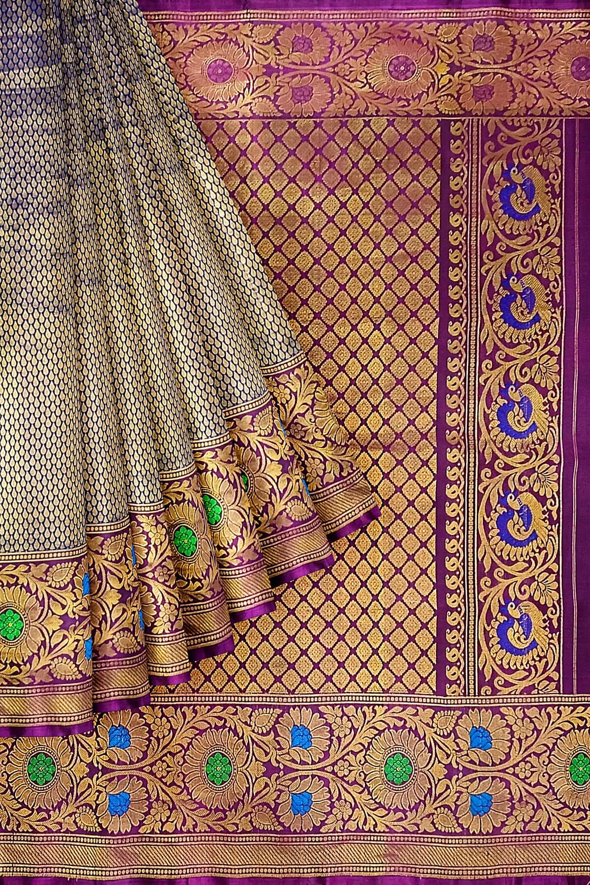 Description : Handwoven Gadwal pure silk brocade saree in blue with rain drop motifs all over the body. This is complemented by colourful meenakari work on pallu & border