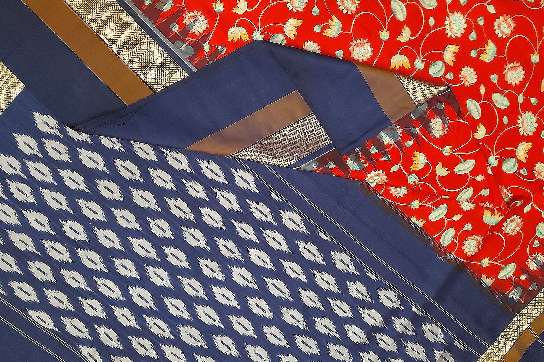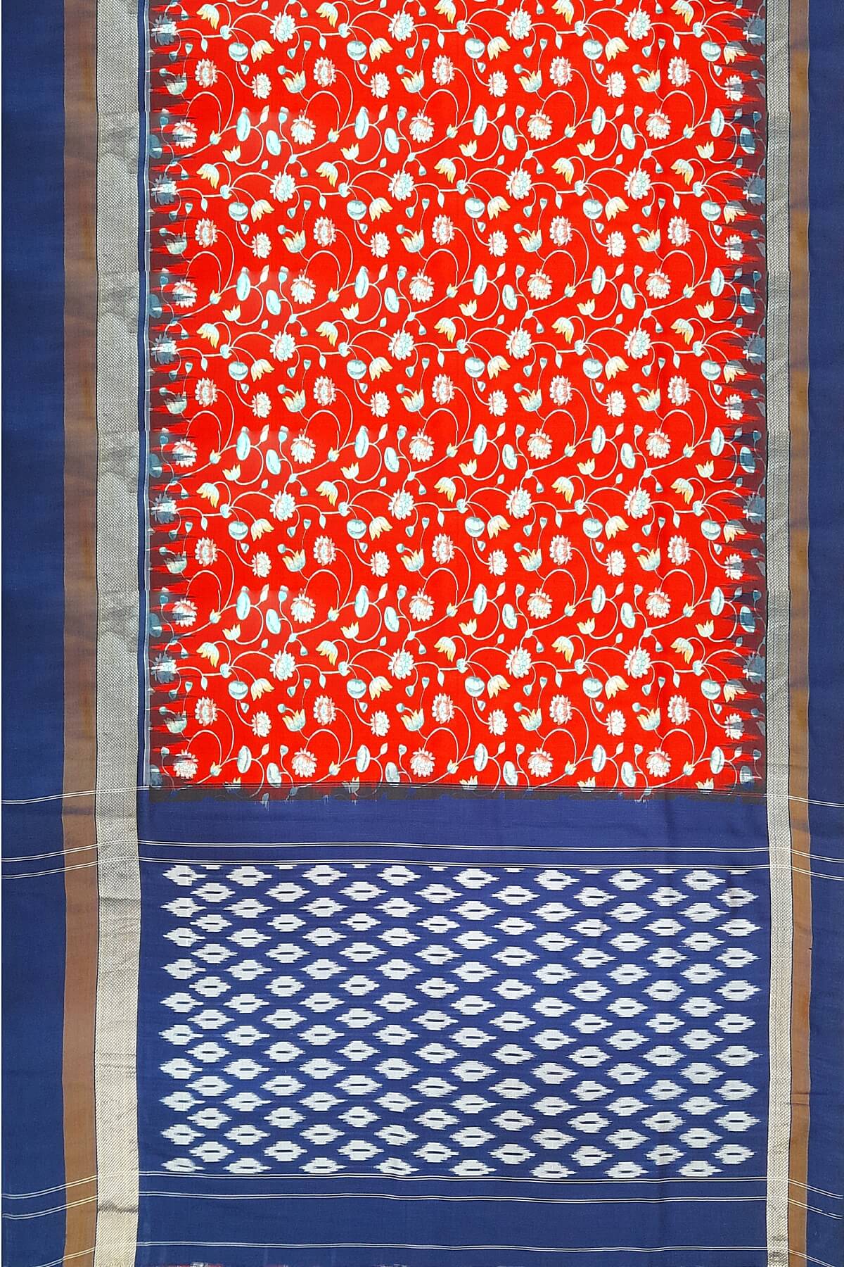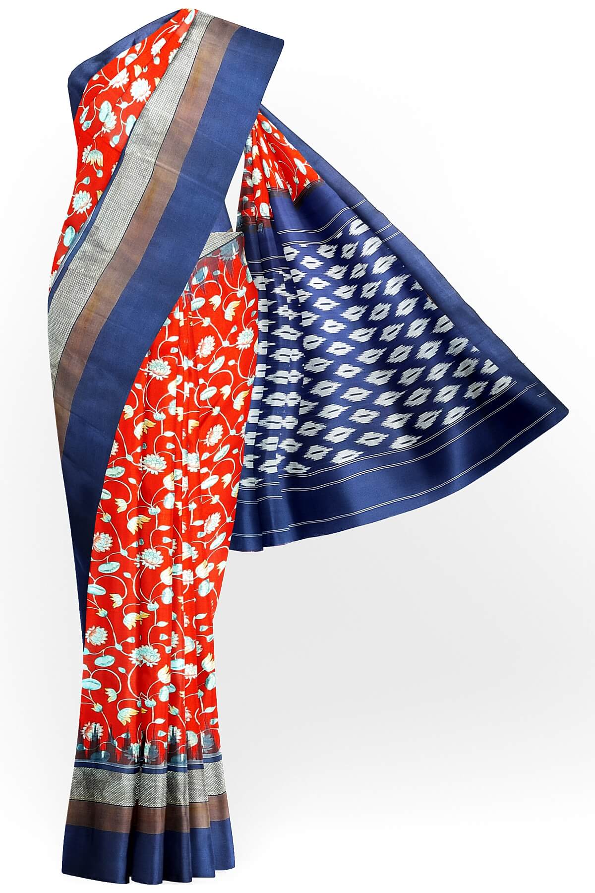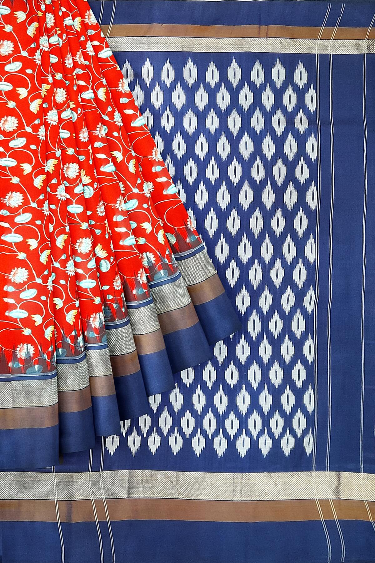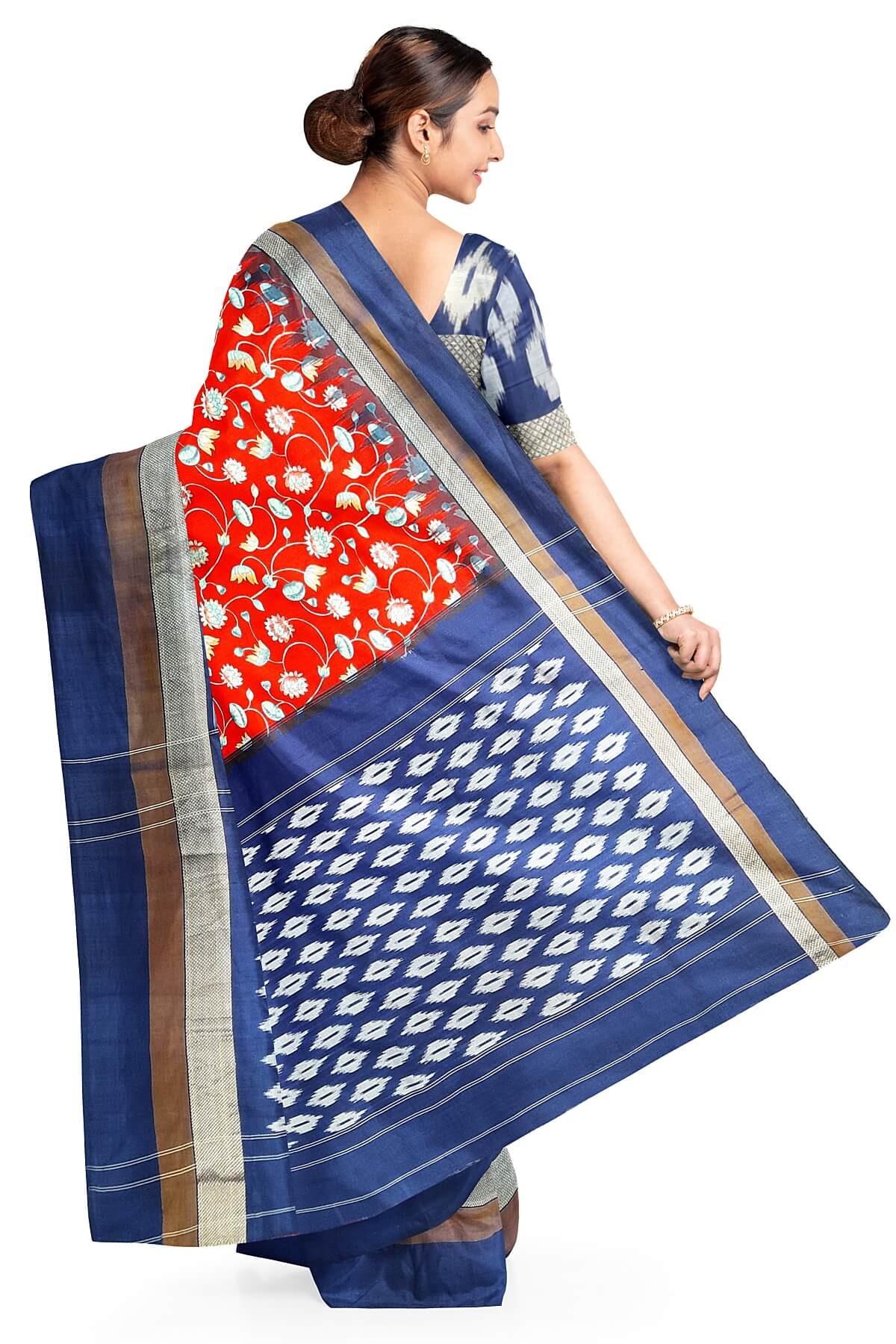 Description : Handwoven ikat pure silk floral printed red saree with lotus vines. The contrast pallu & blouse is of Ikat weave.