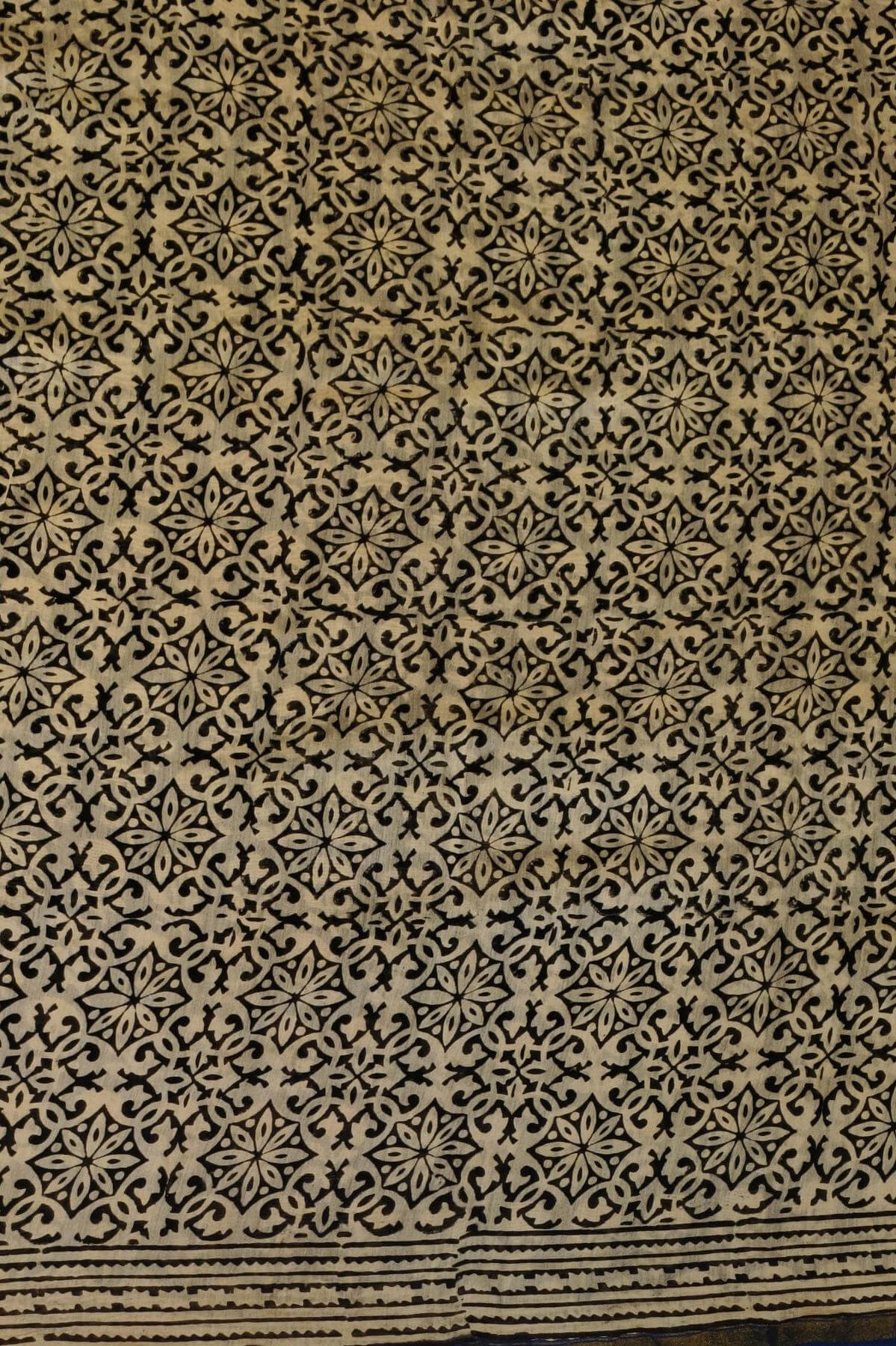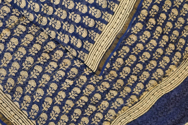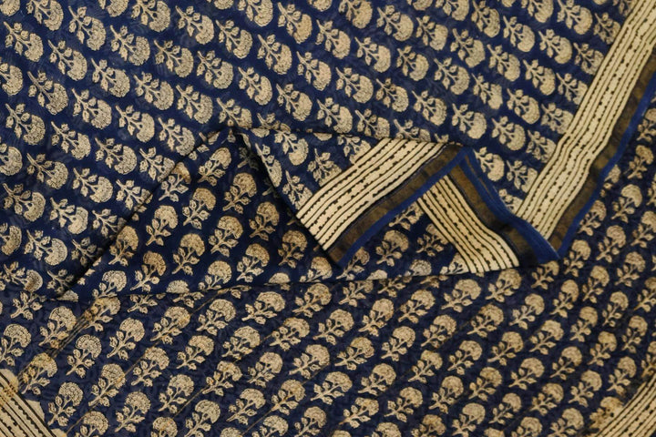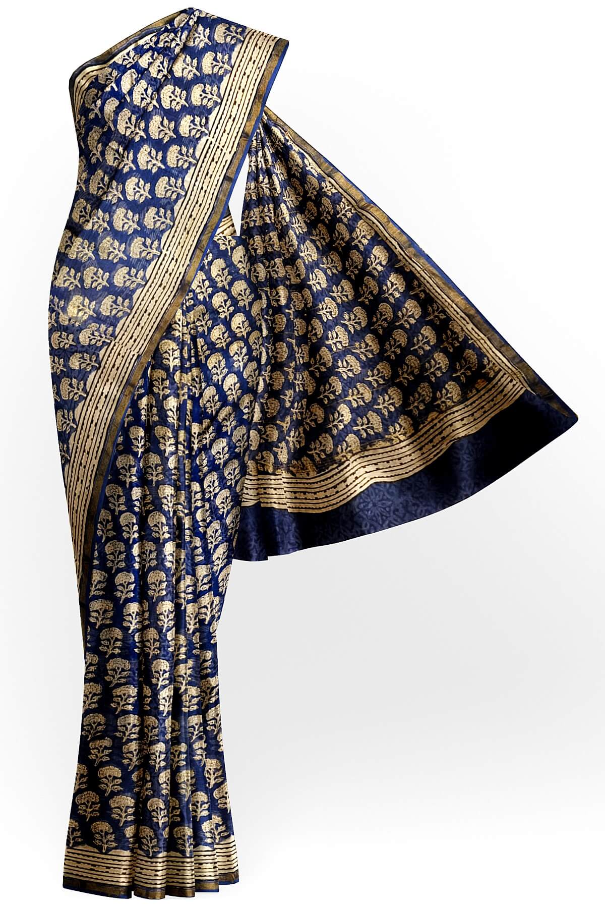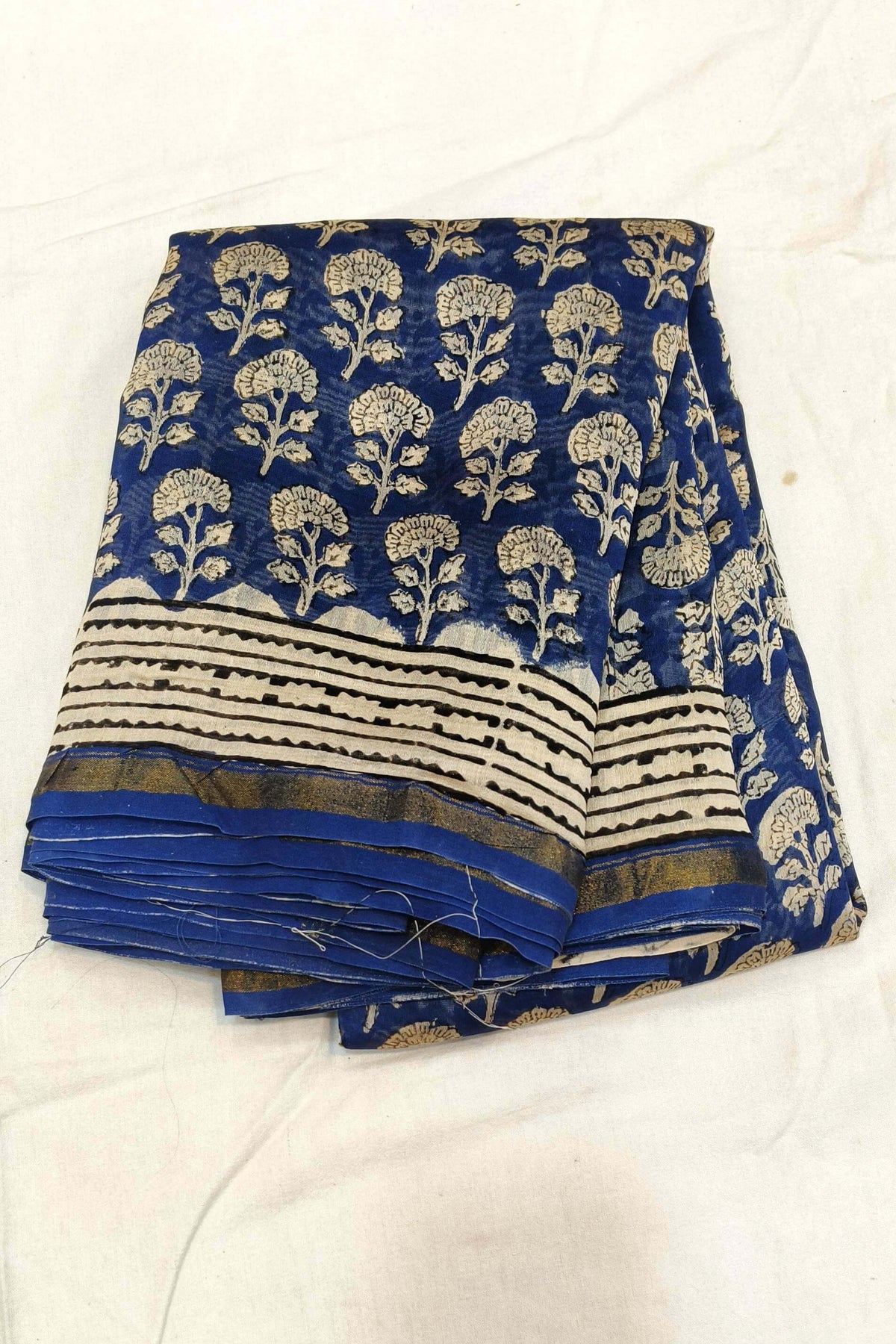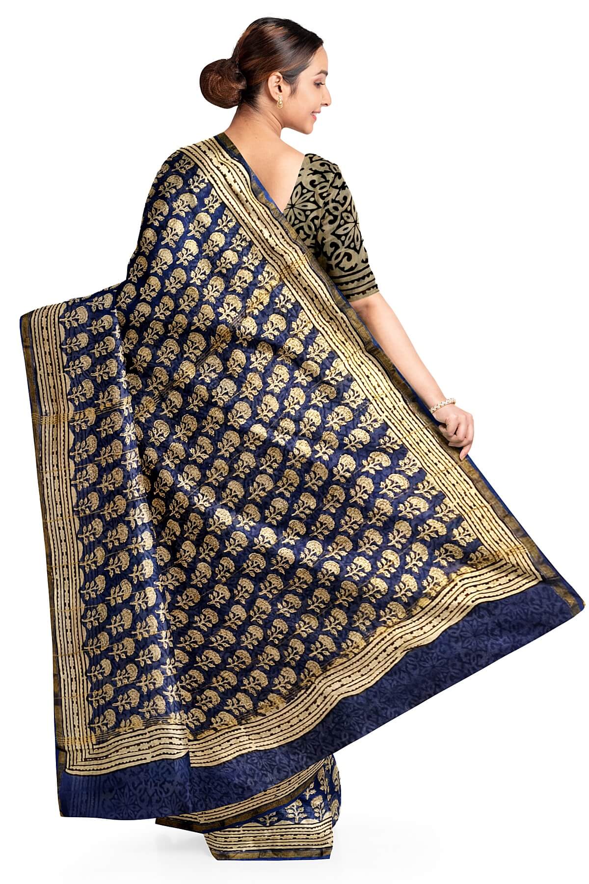 Description : Bagru hand block print on Chanderi silk cotton saree in navy blue in floral pattern