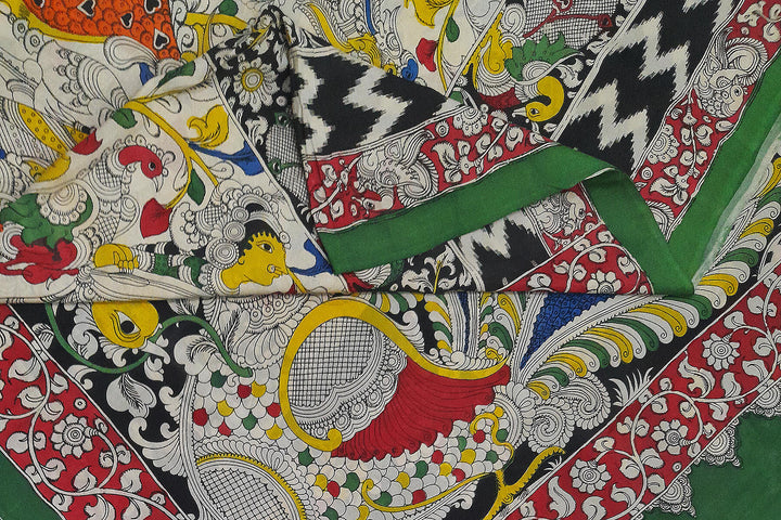 Description : Hand drawn hand painted pen kalamkari silk cotton saree with peacock motif in pallu