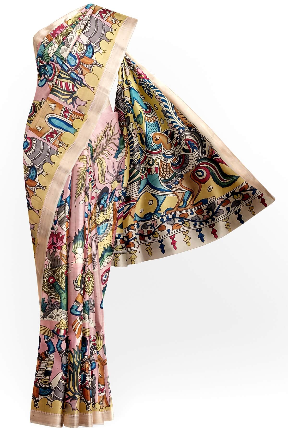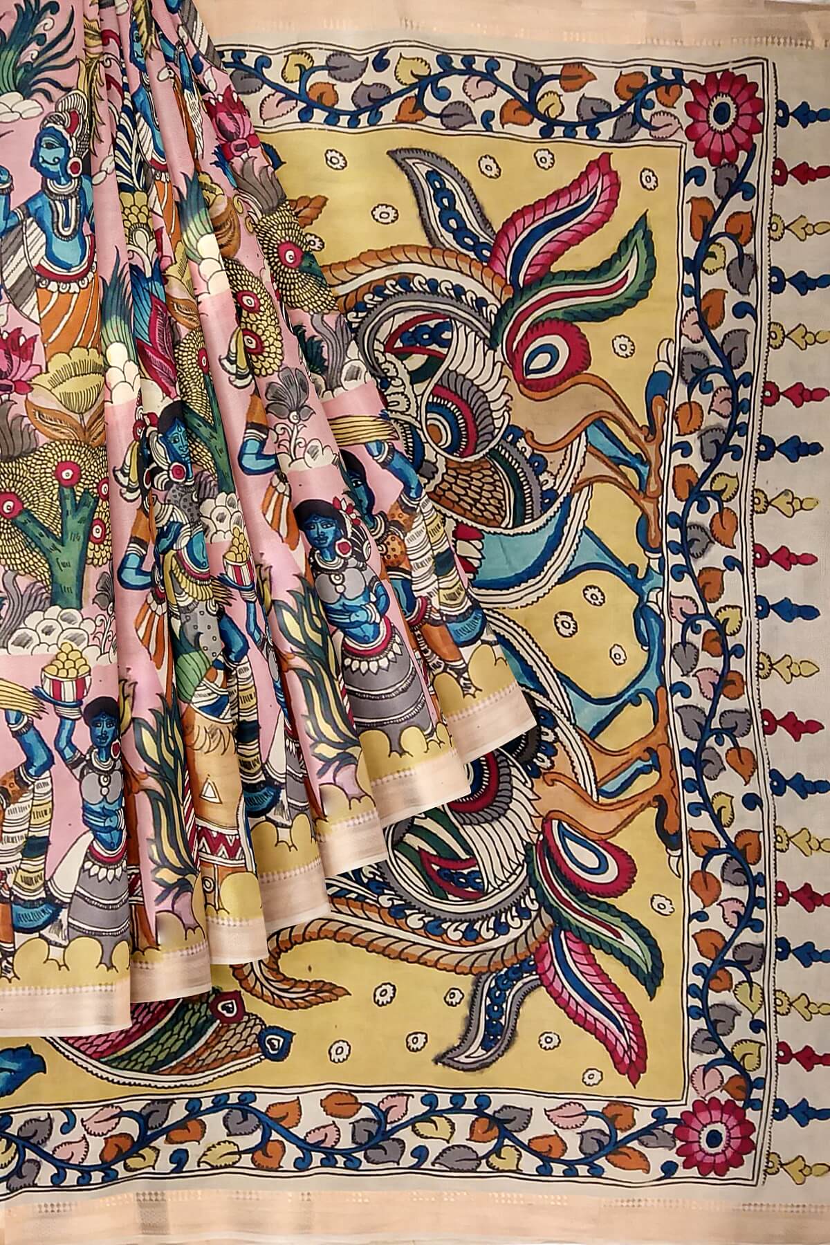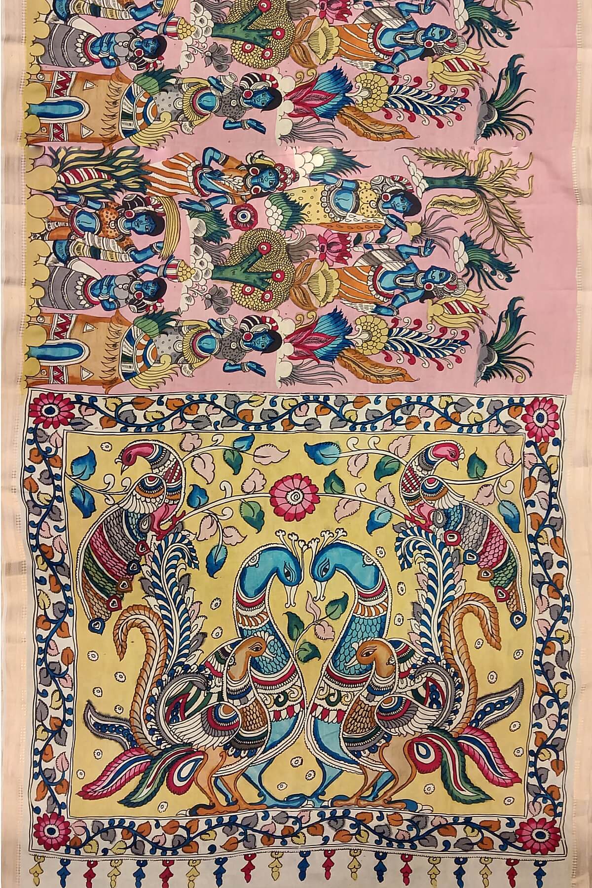 Description: Hand painted Kalamkari on Bangalore silk saree in pink with a village theme. The pallu has image of peacocks.