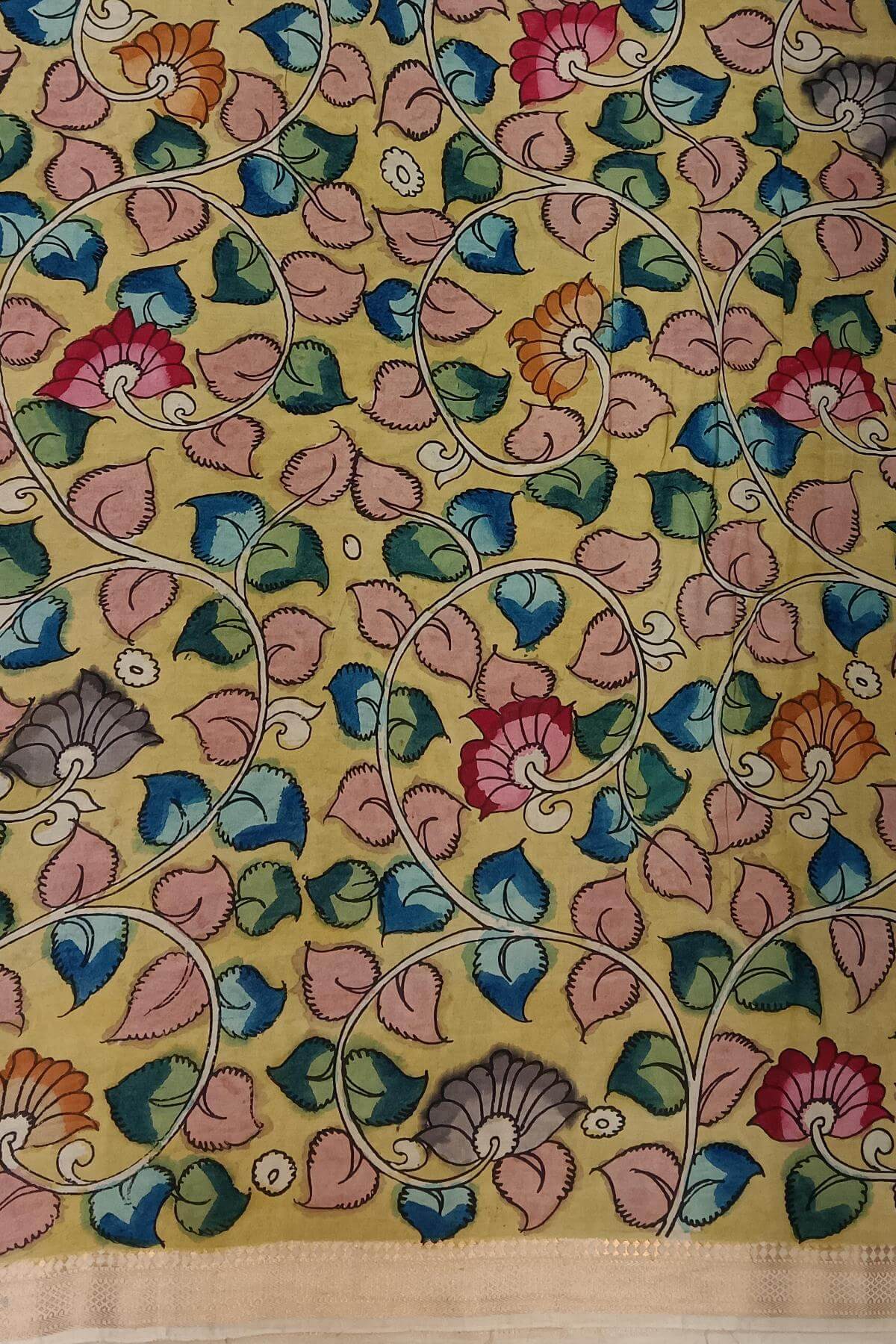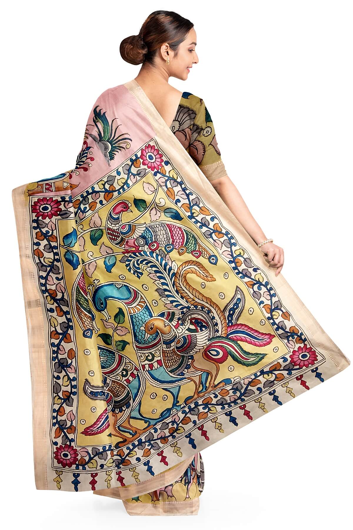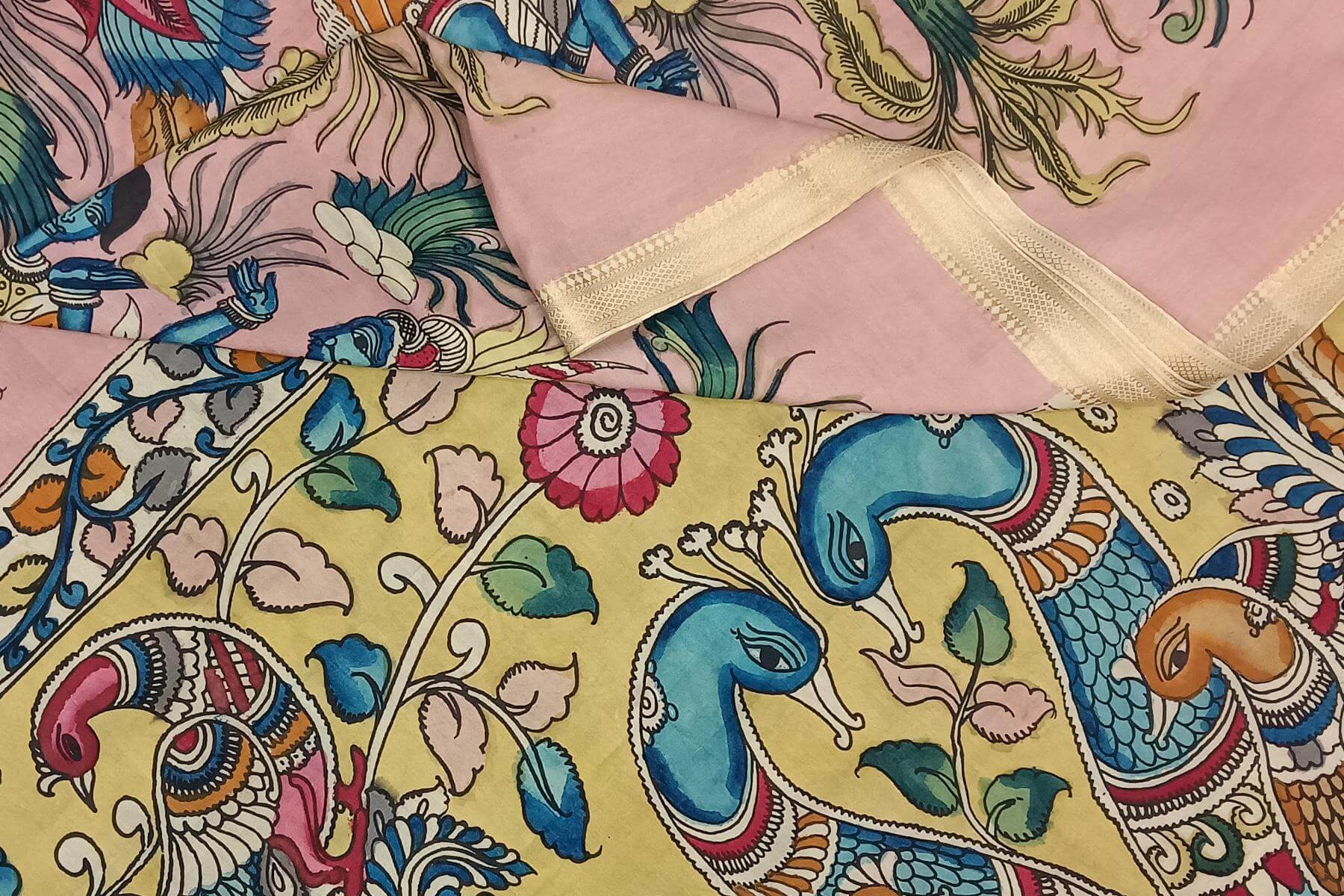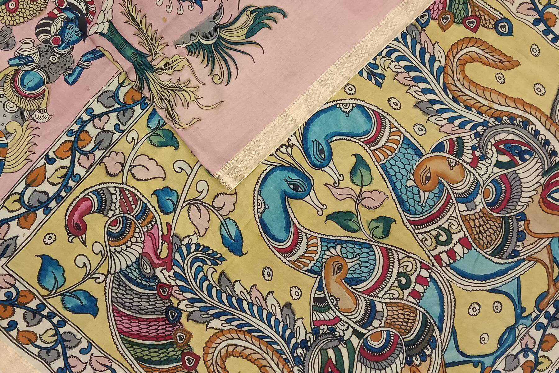 Description: Hand painted Kalamkari on Bangalore silk saree in pink with a village theme. The pallu has image of peacocks.
