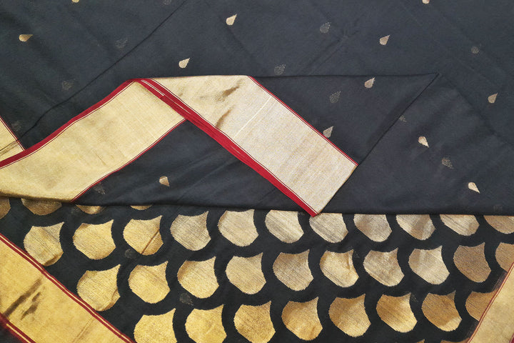 Description: Handloom Chanderi silk cotton saree with gold motifs in pallu