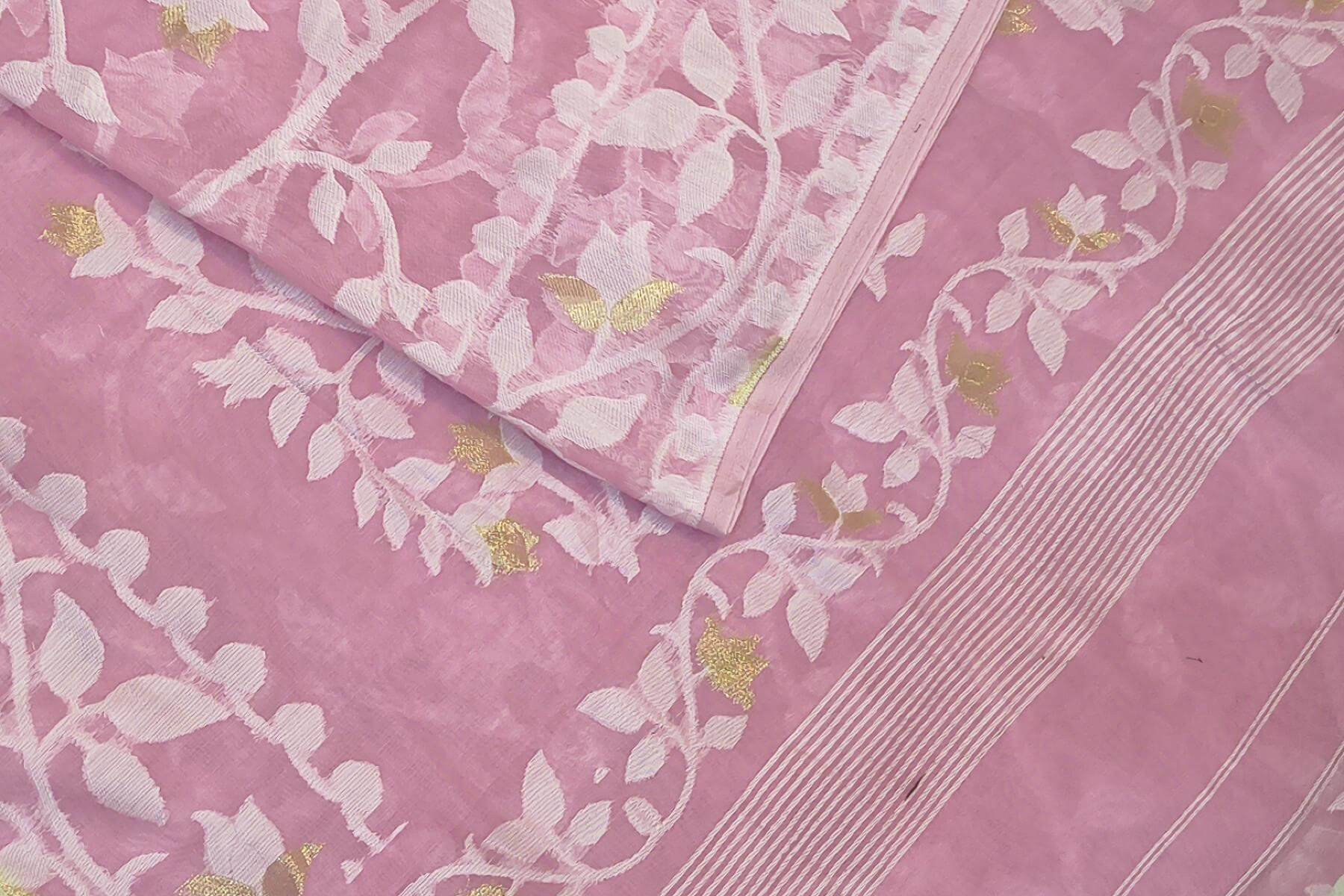 Description : Handloom silk cotton saree in baby pink in floral jamdani weave