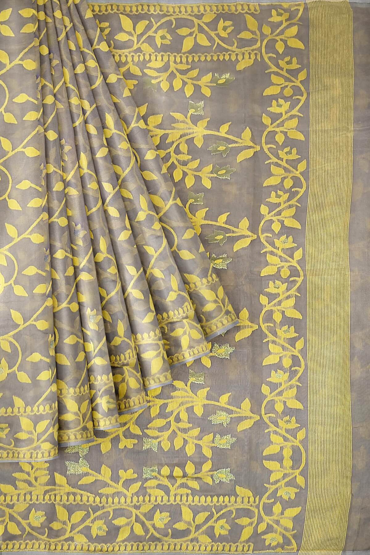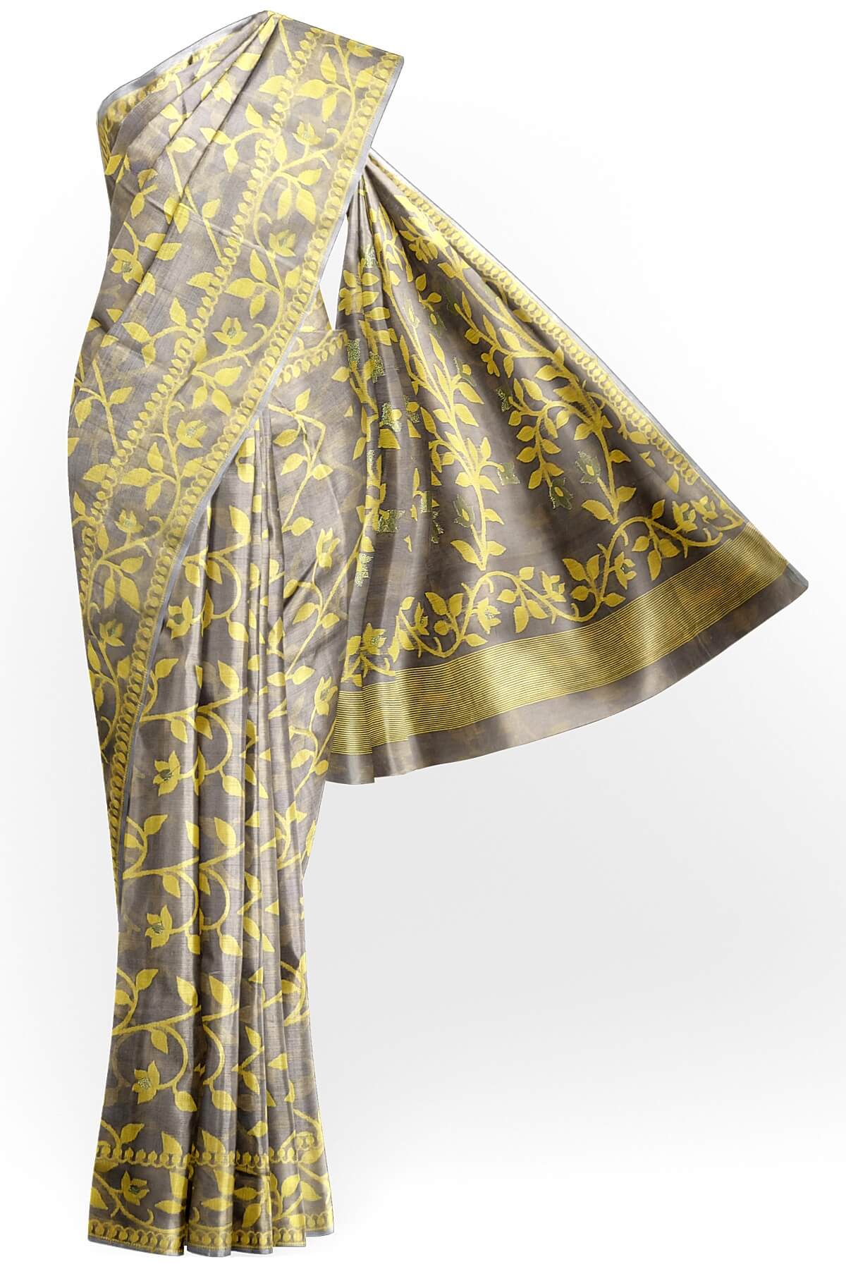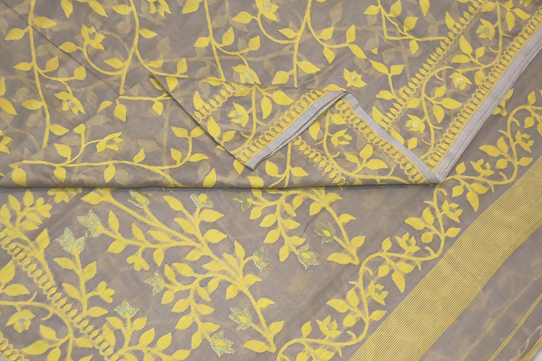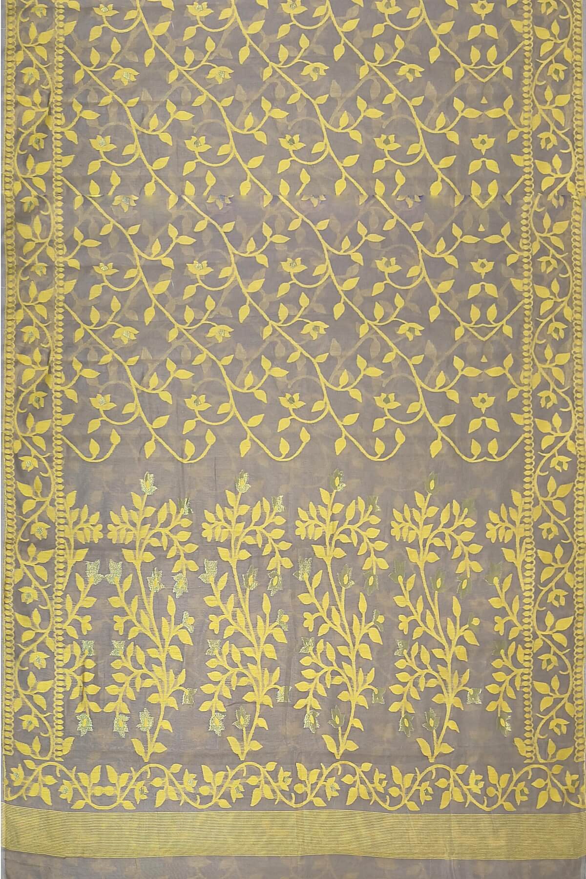 Description : Handloom silk cotton saree in grey in floral jamdani weave