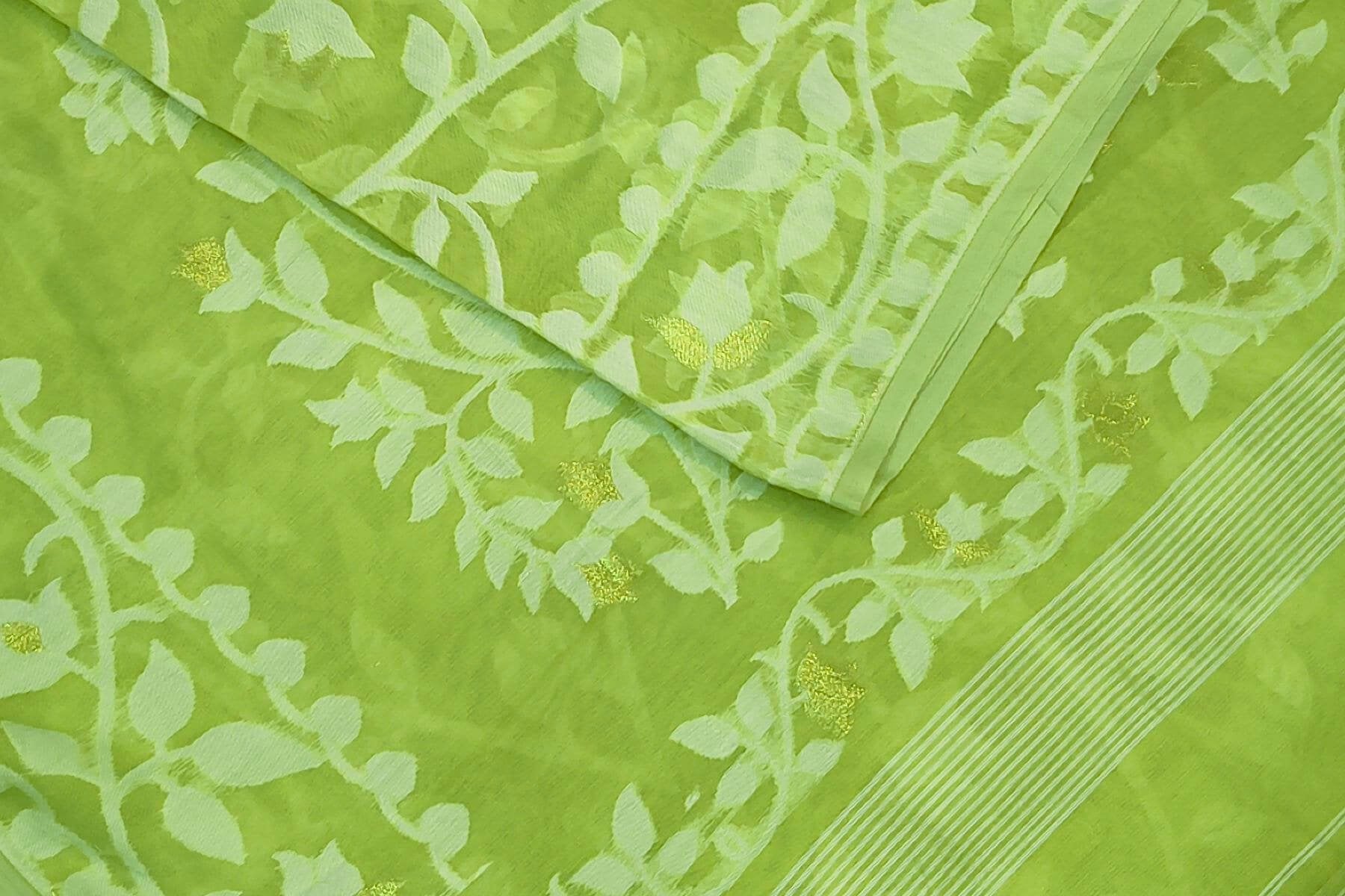 Description : Handloom silk cotton saree in pista green in floral jamdani weave