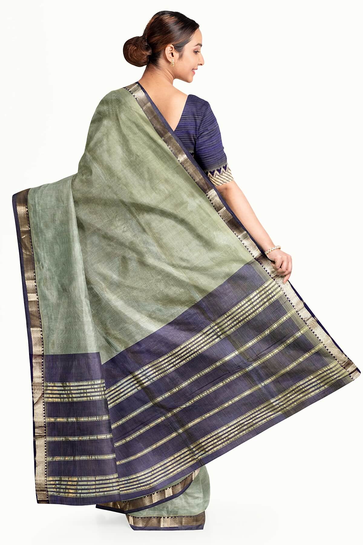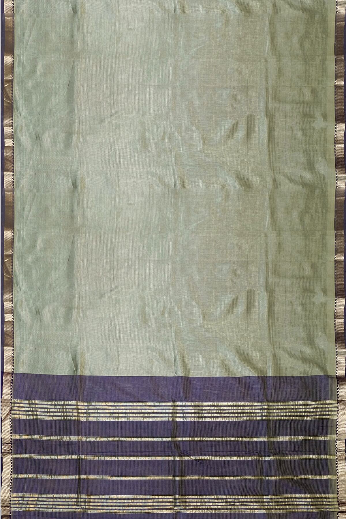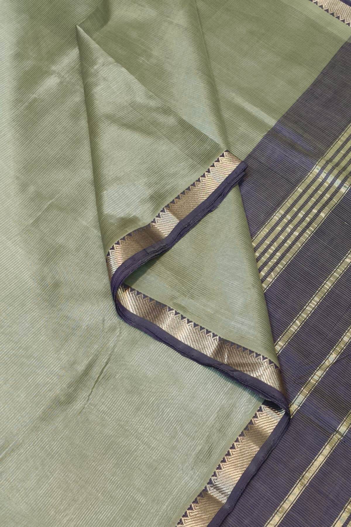 Description: Mangalgiri silk cotton saree in sage green with silver border and a contrast pallu