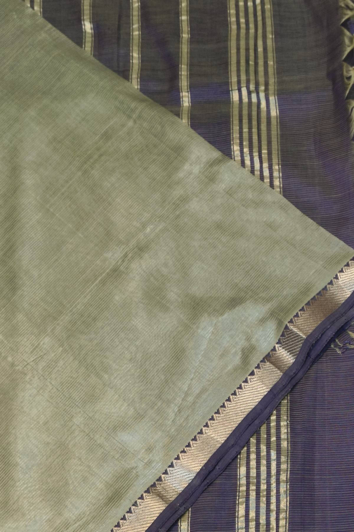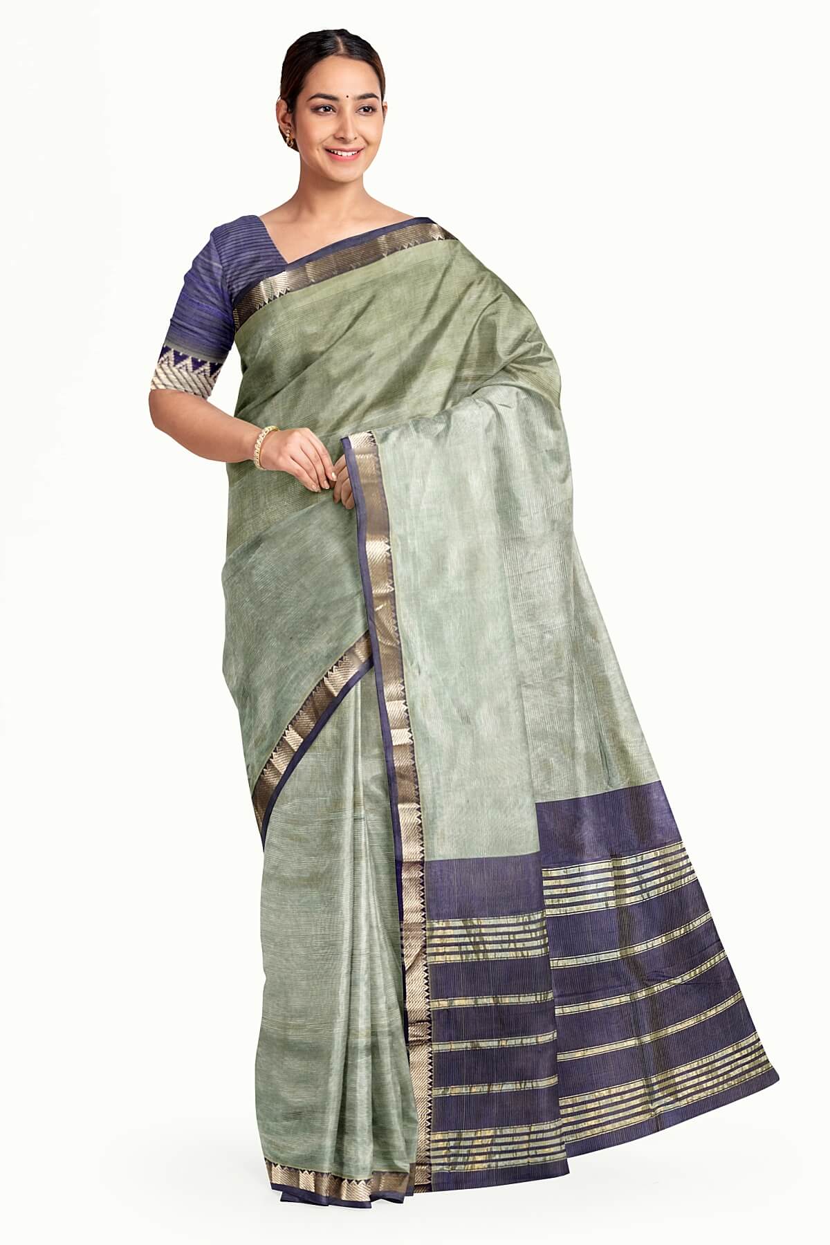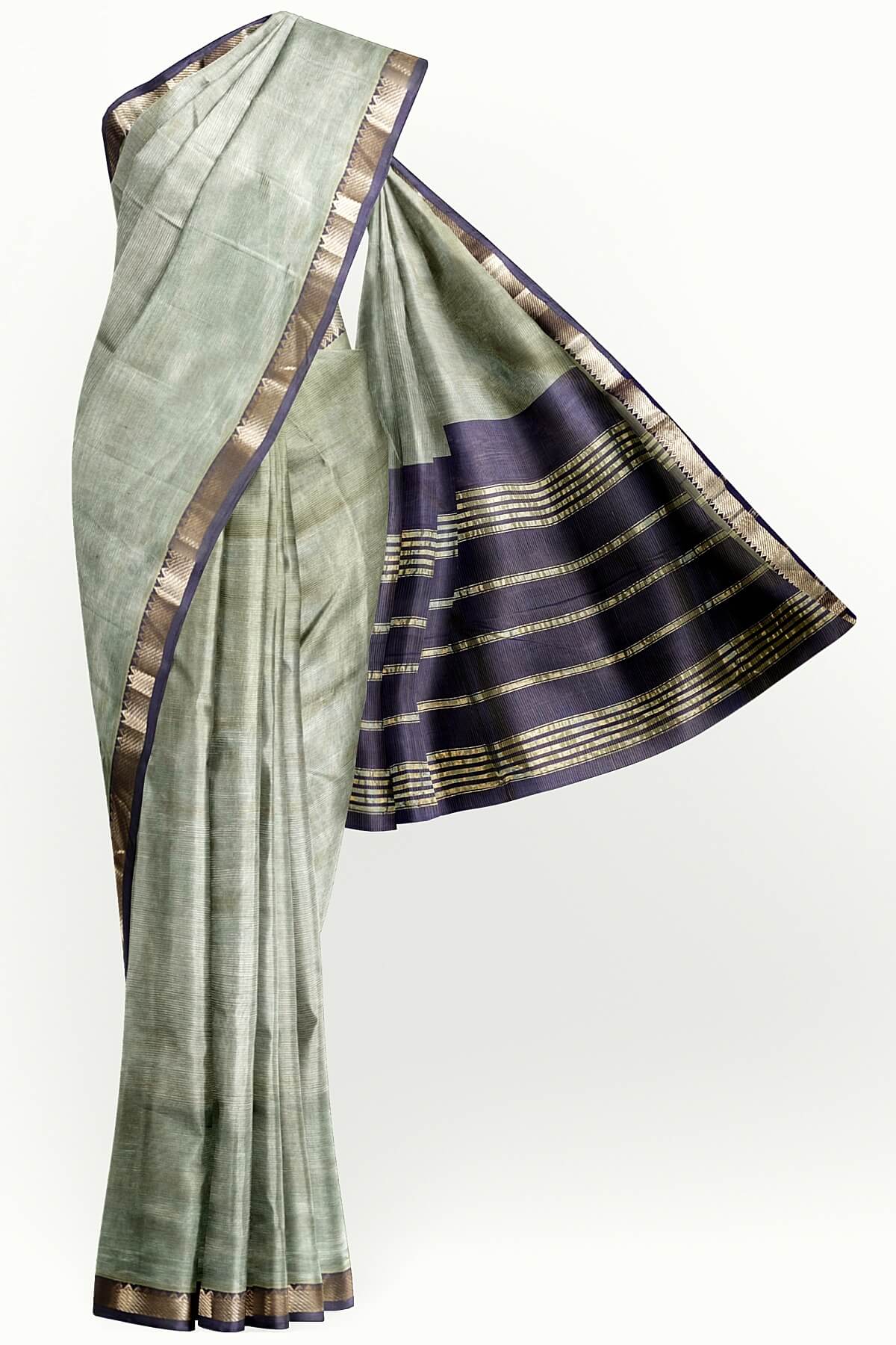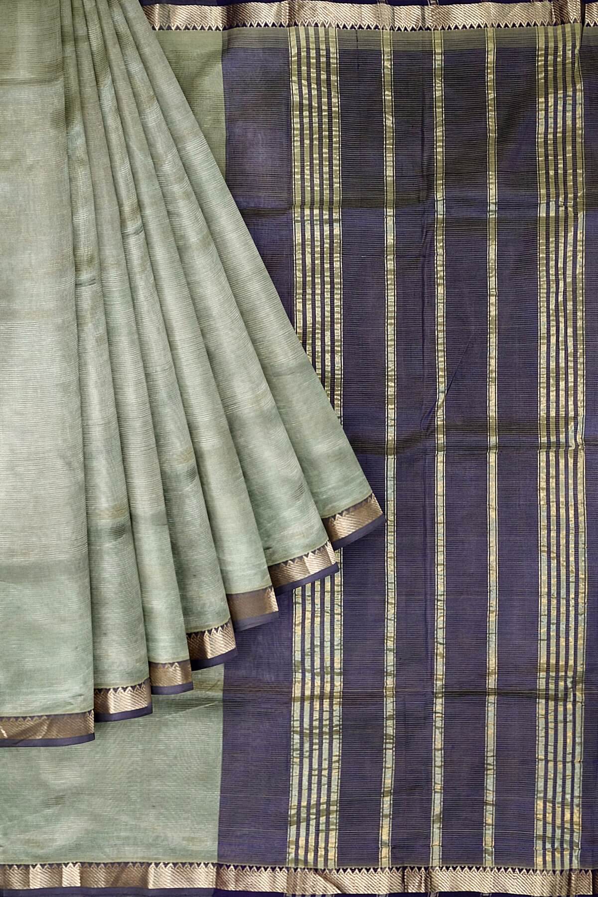 Description: Mangalgiri silk cotton saree in sage green with silver border and a contrast pallu