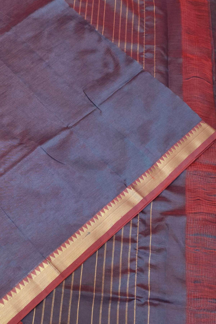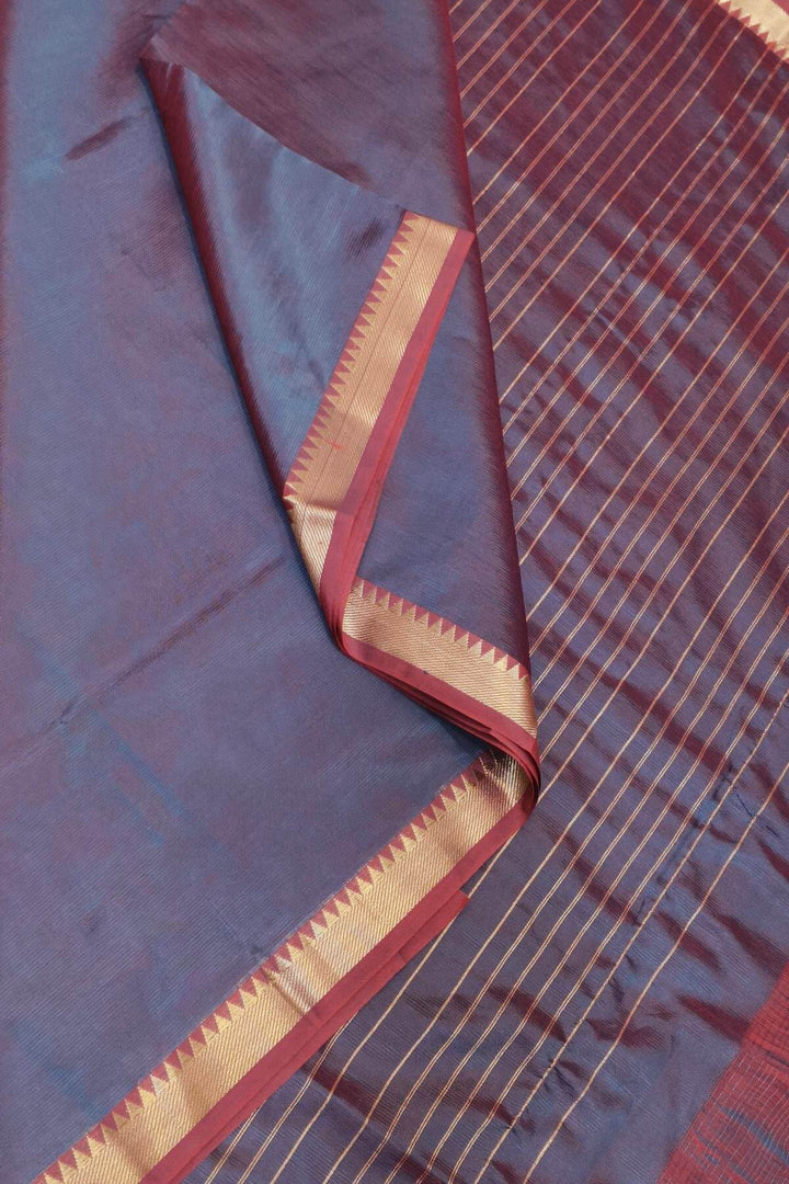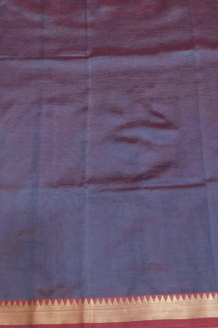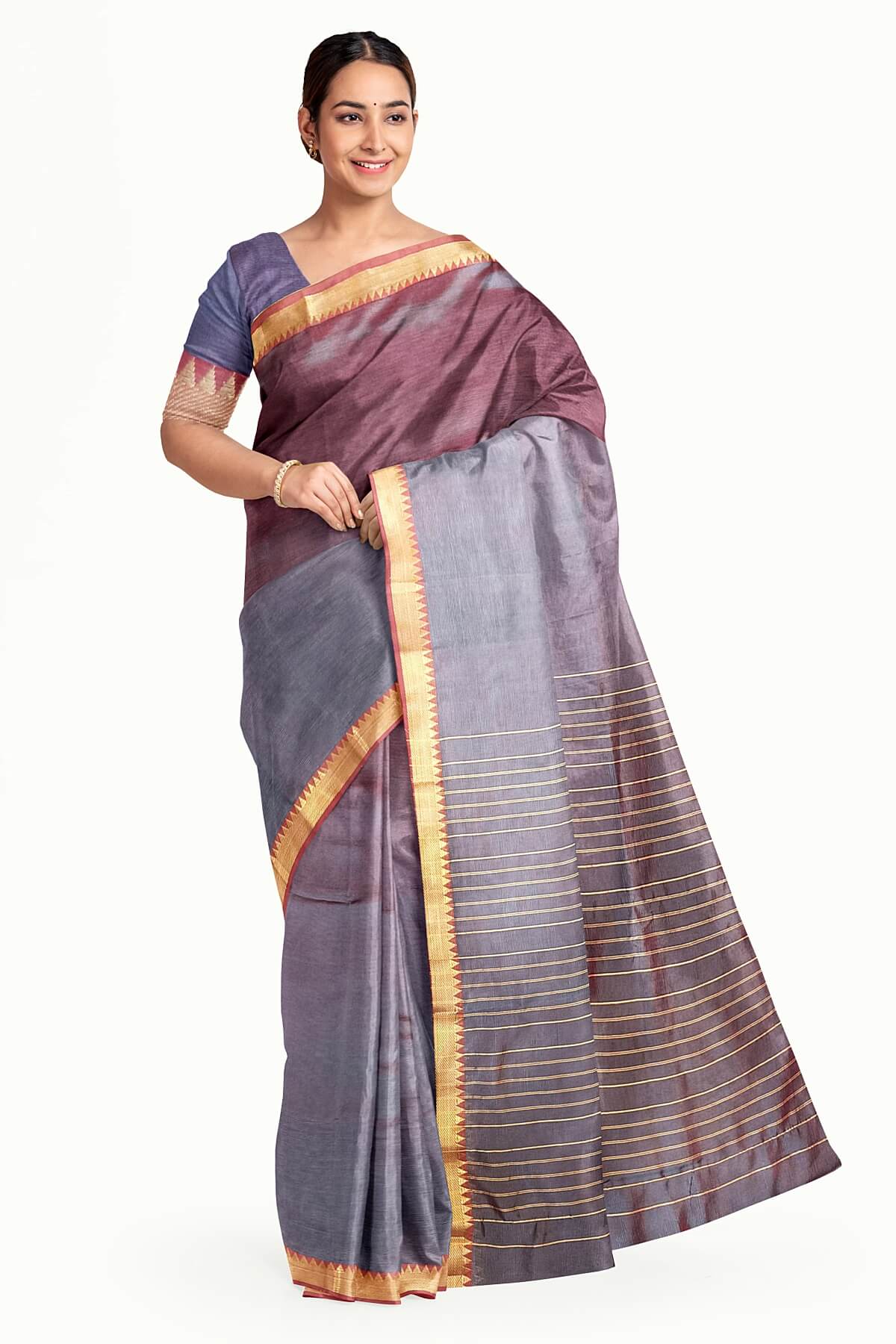 Description: Mangalgiri silk cotton saree in two tone violet with silver border and a contrast pallu