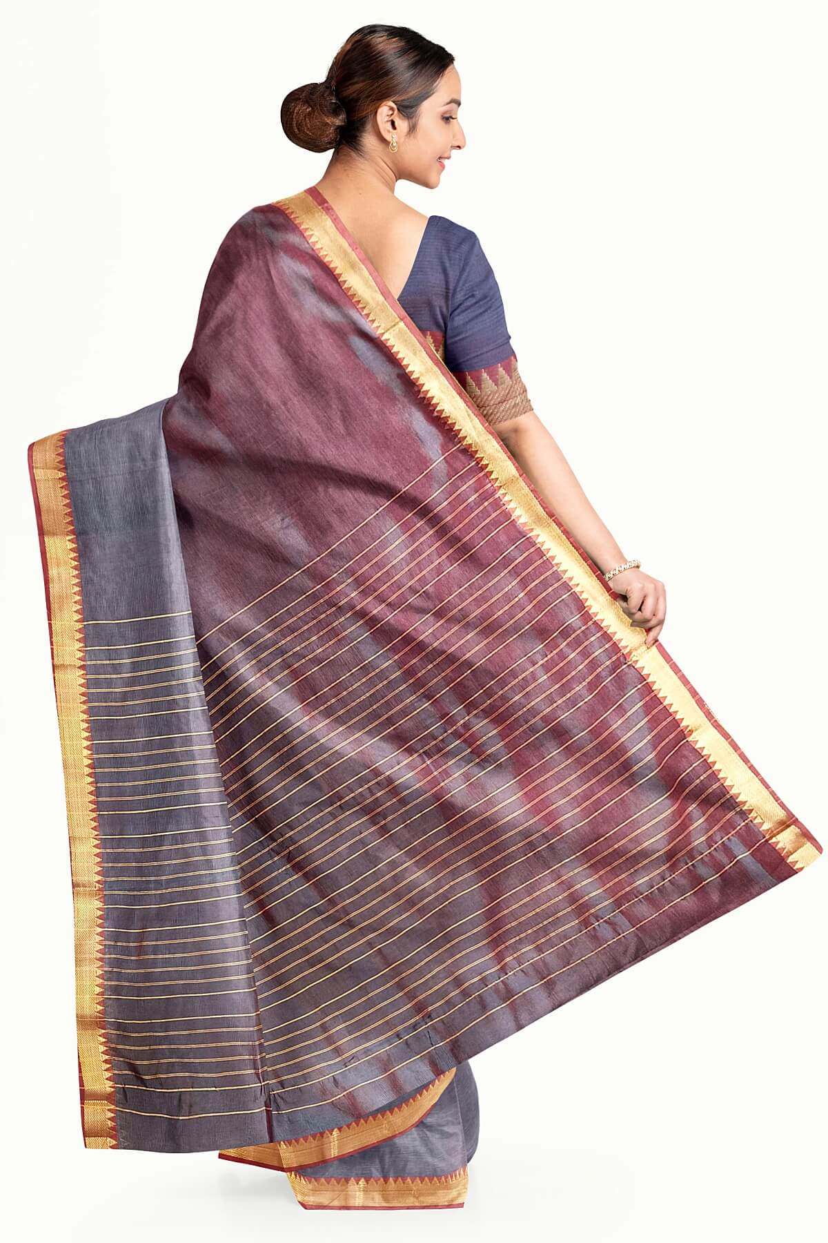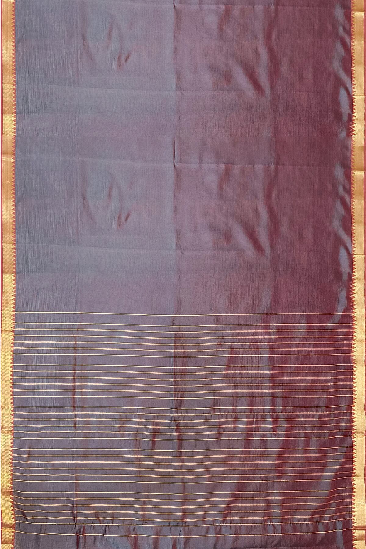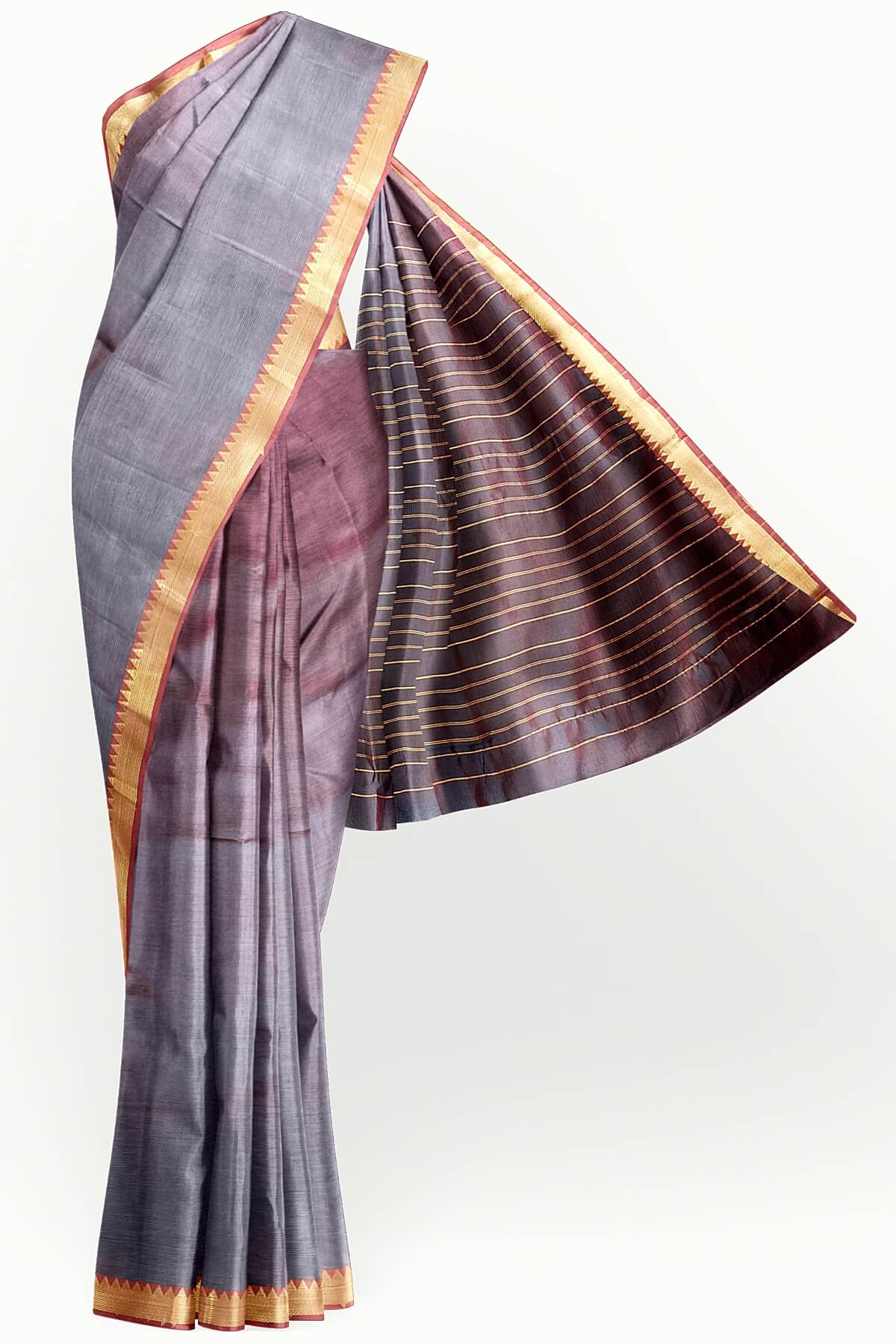 Description: Mangalgiri silk cotton saree in two tone violet with silver border and a contrast pallu
