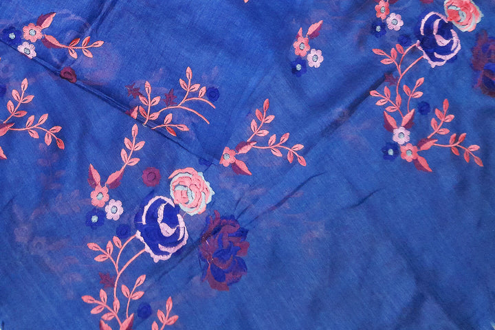 Description:  Handloom tussar pure silk dupatta in blue with floral embroidery work