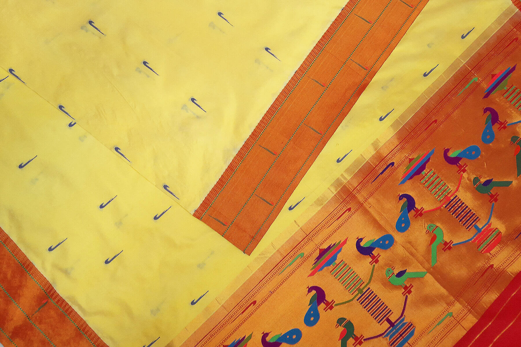 Description: Handwoven Paithani pure silk dupatta in pastel shade of yellow with muniyas on the body and  peacock & parrot motifs . This is complemented with double  muniya borders