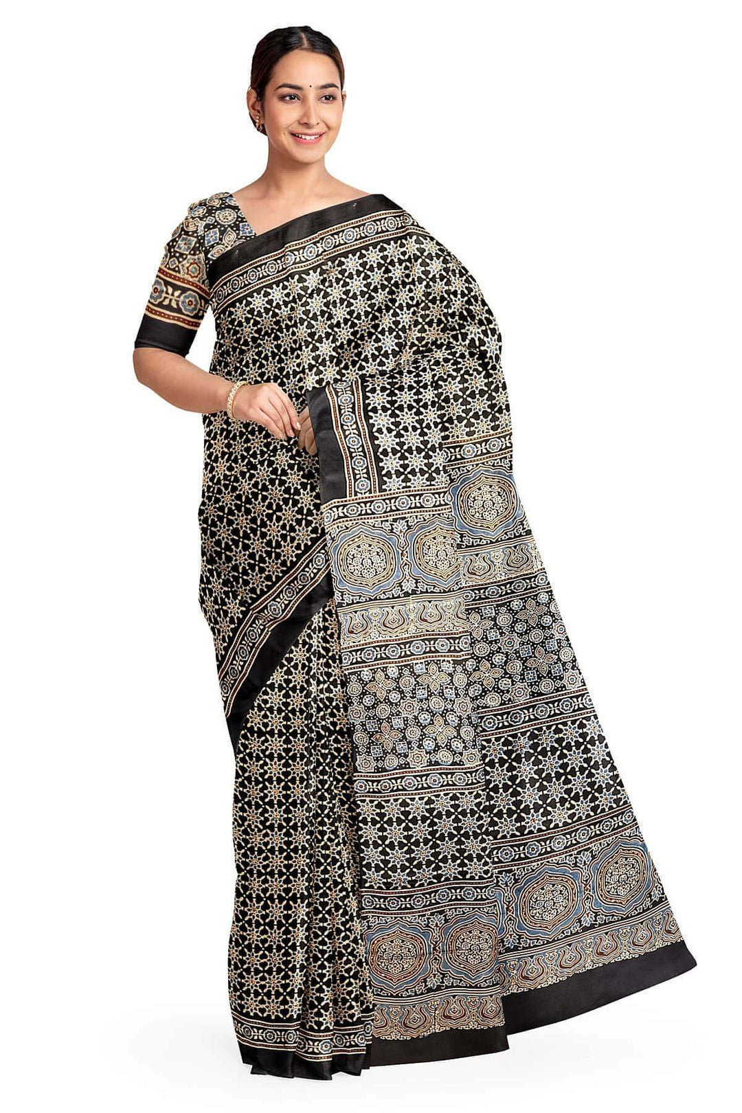 Modal silk saree in red in hand block ajrakh print in floral pattern