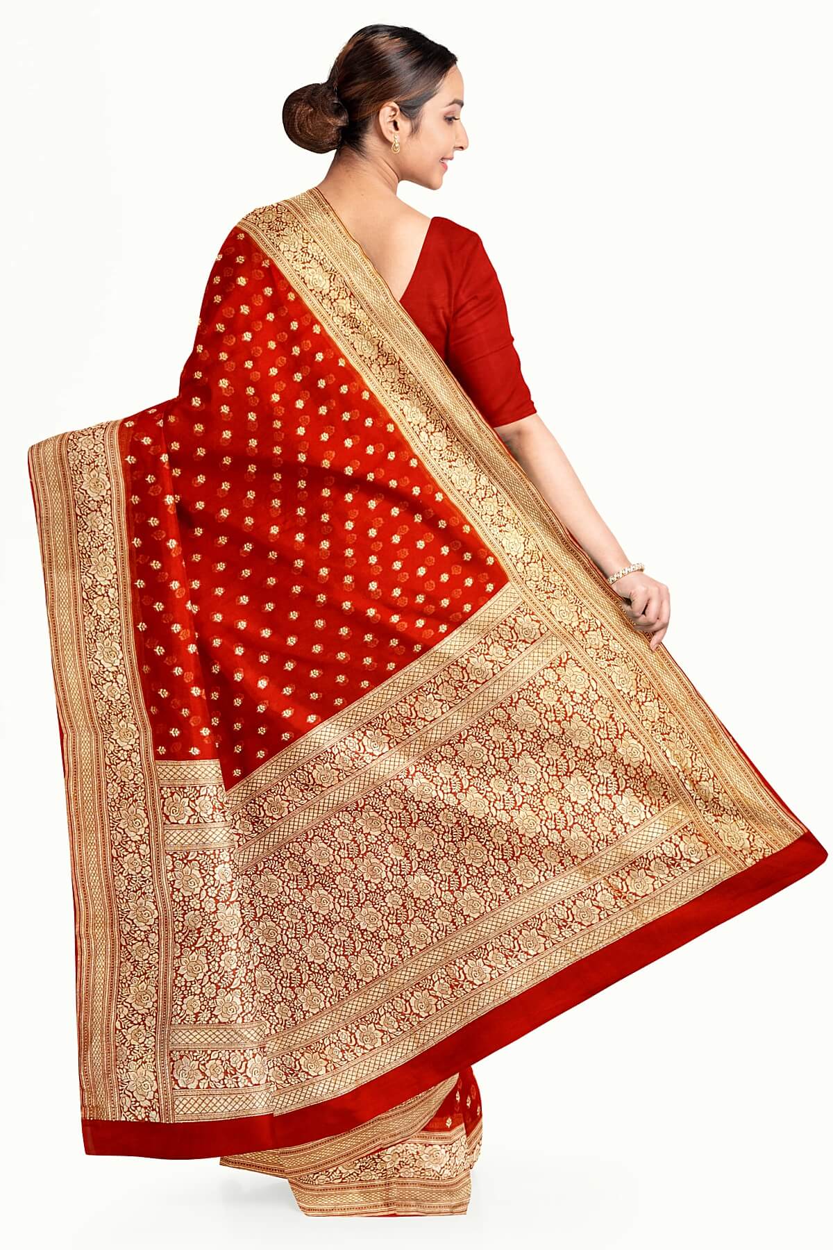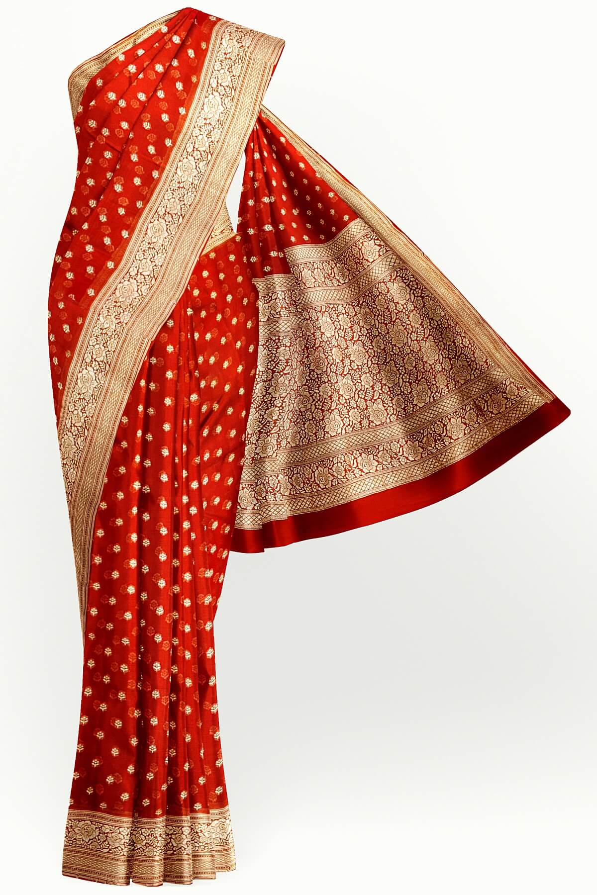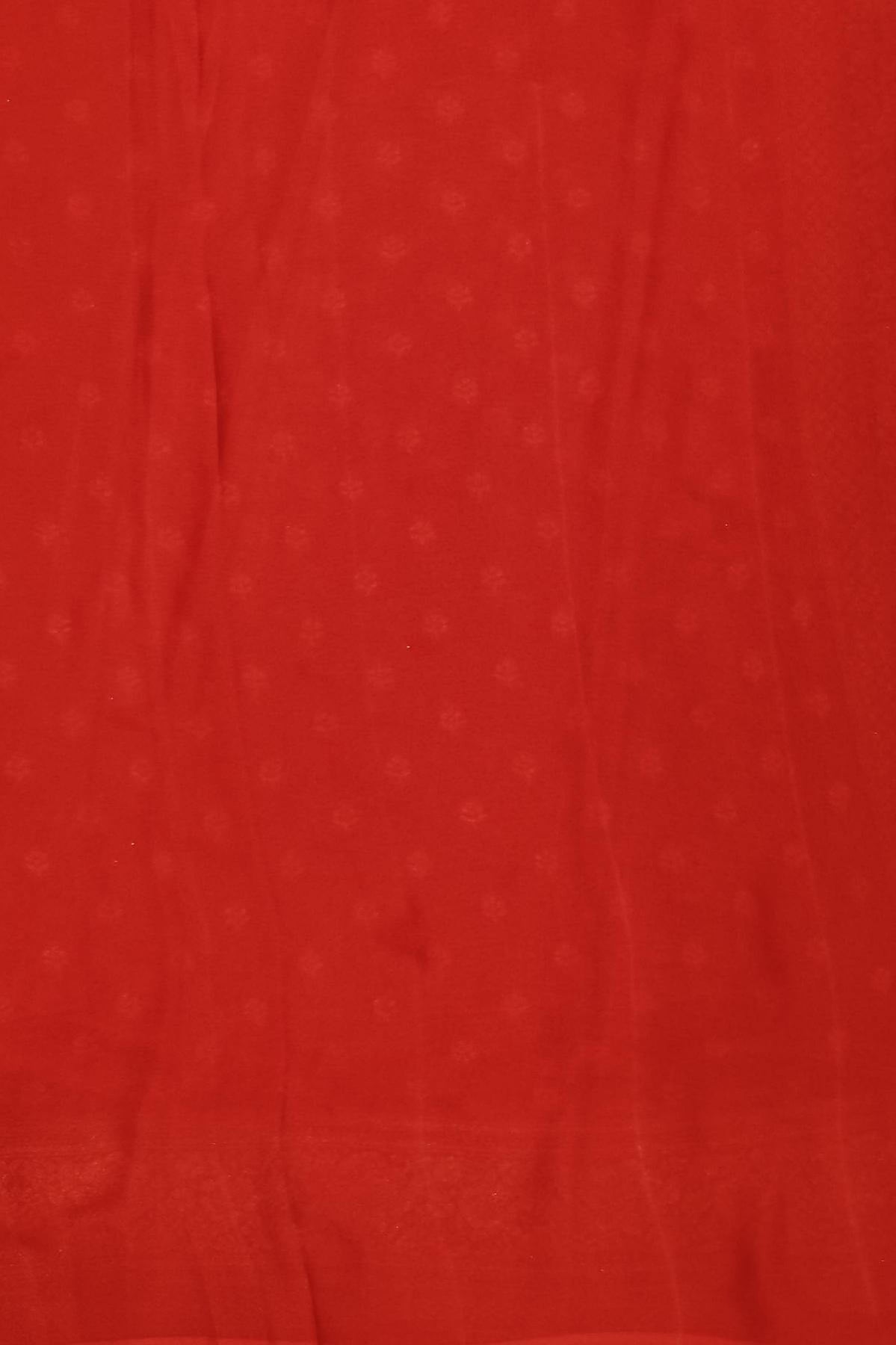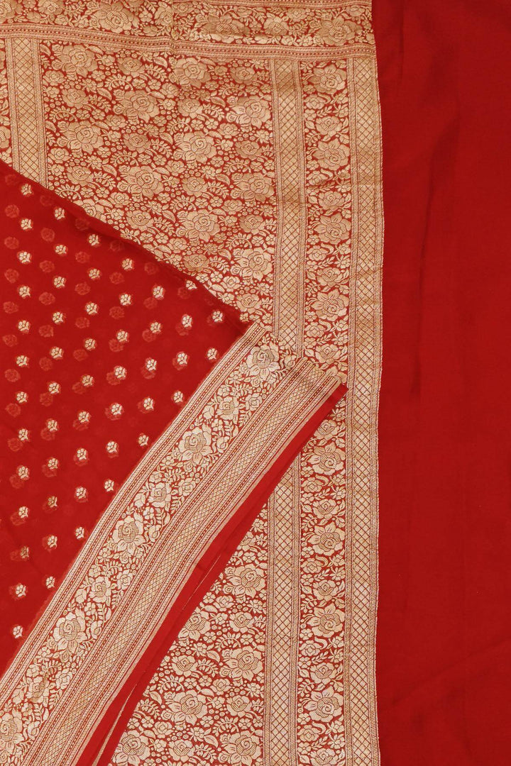Description : Banarasi silk georgette saree in red with small motifs all over the body.