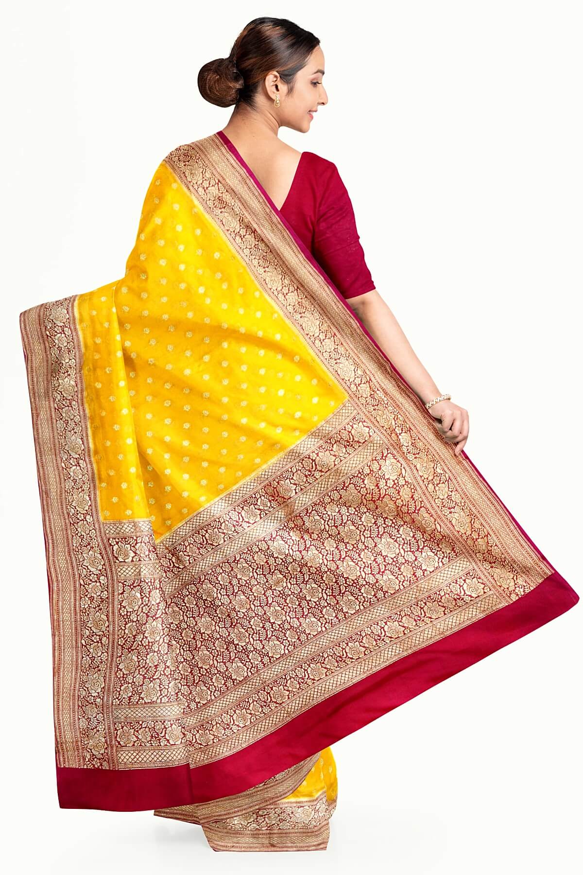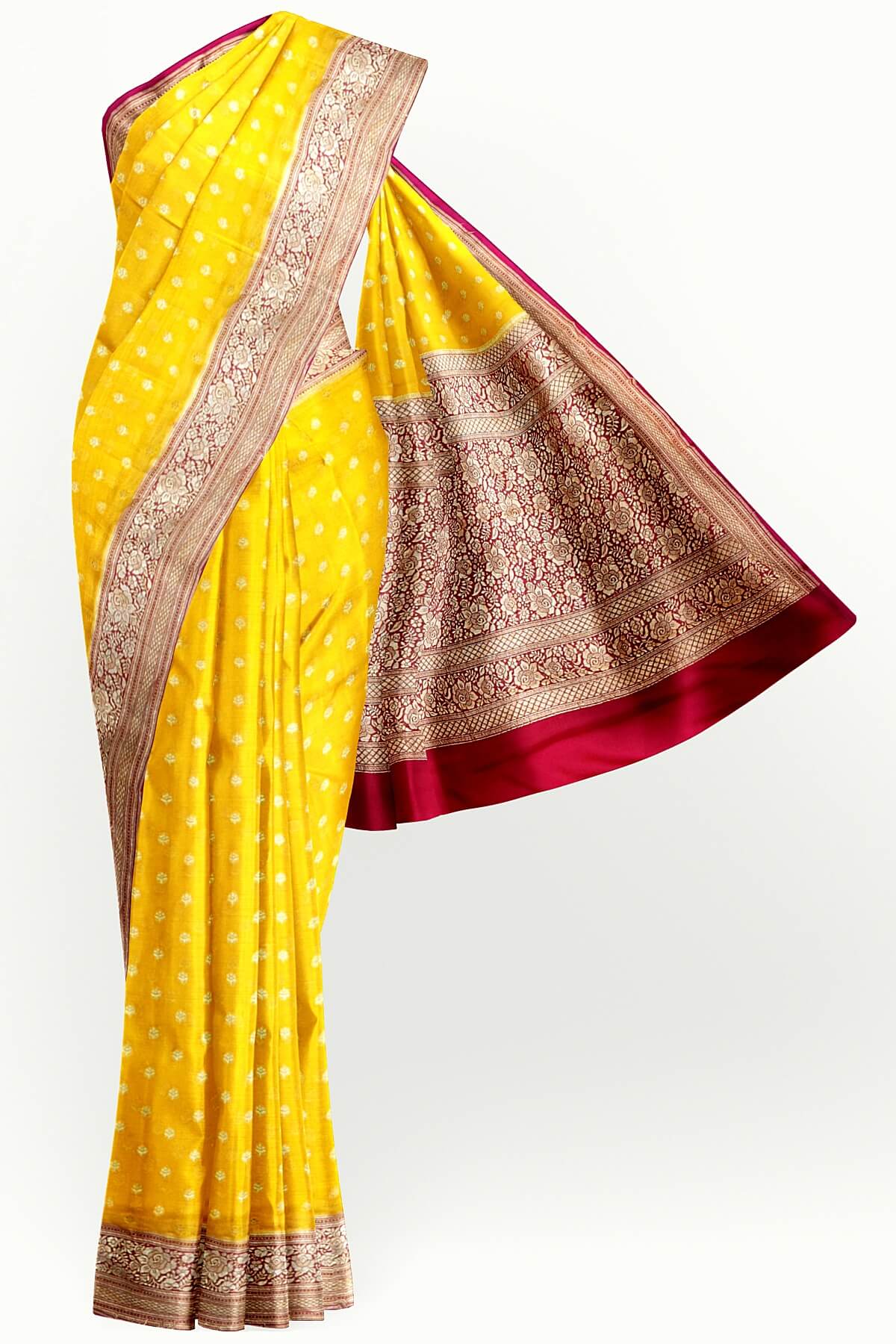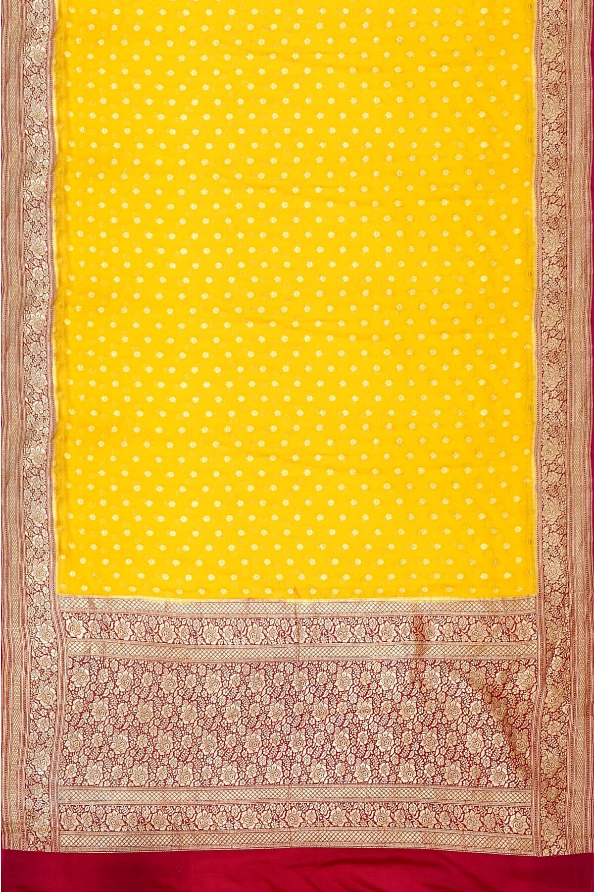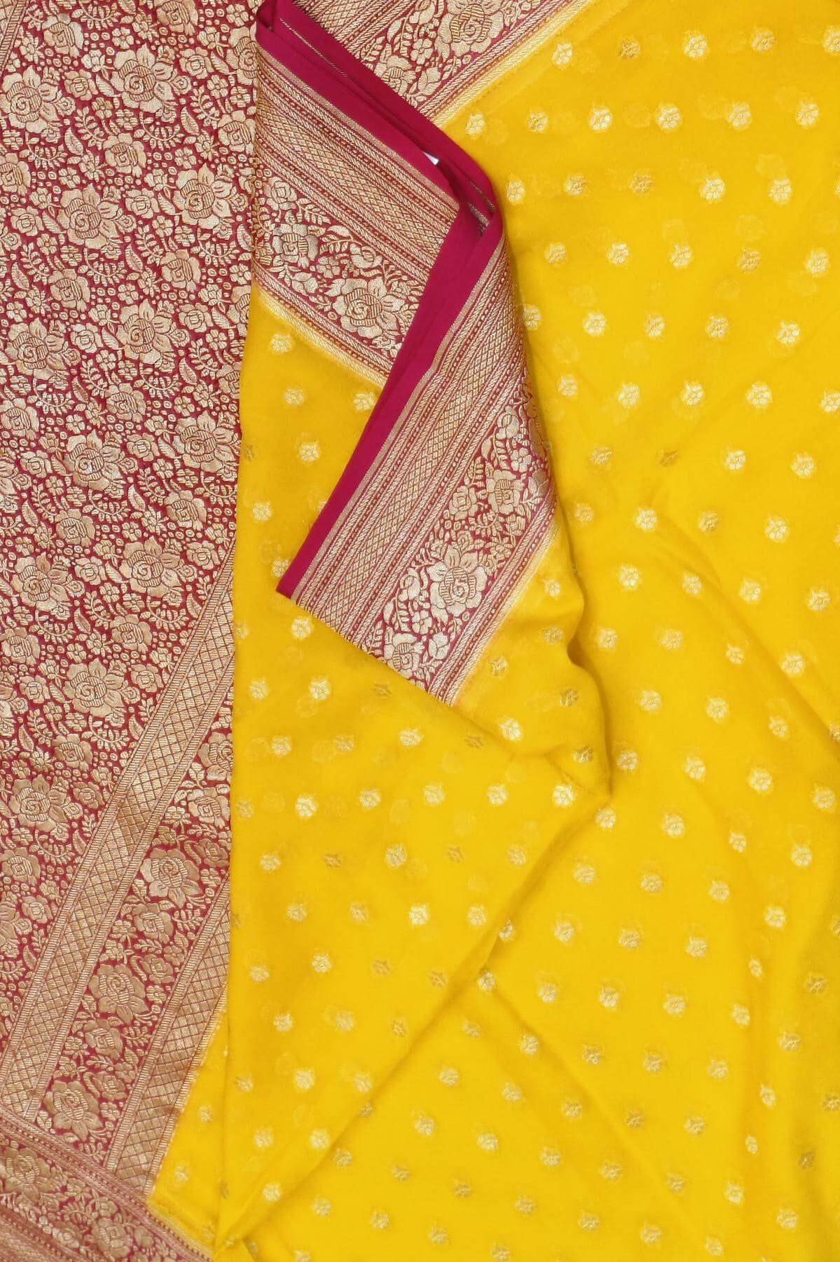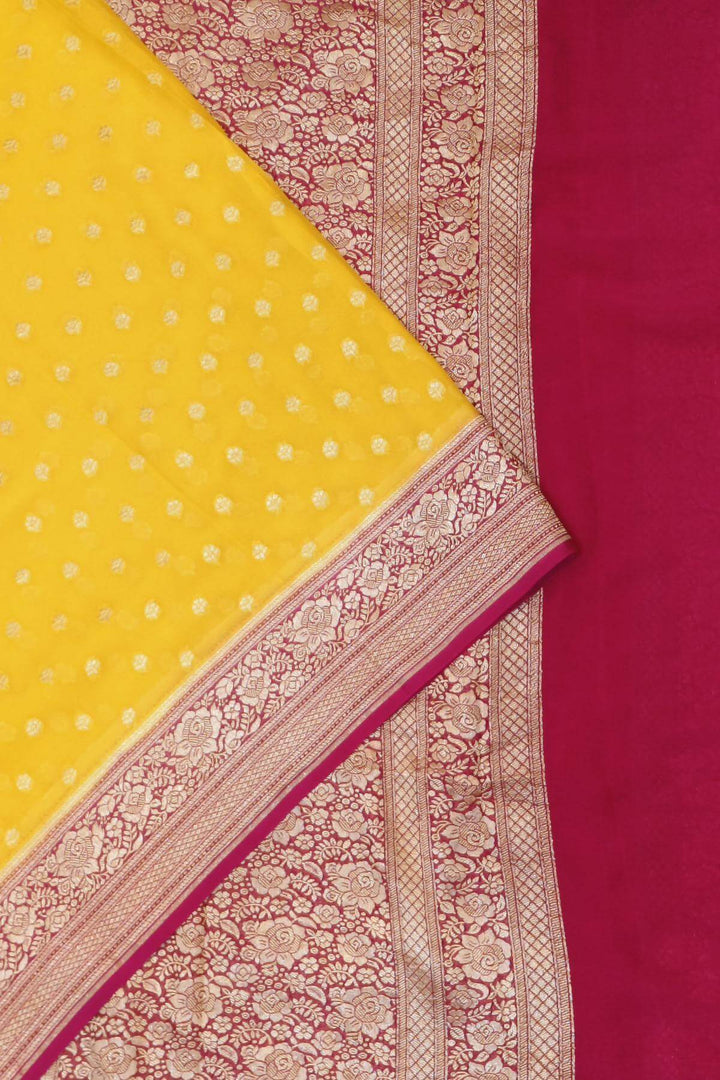 Description : Banarasi silk georgette saree in yellow with small motifs all over the body.
