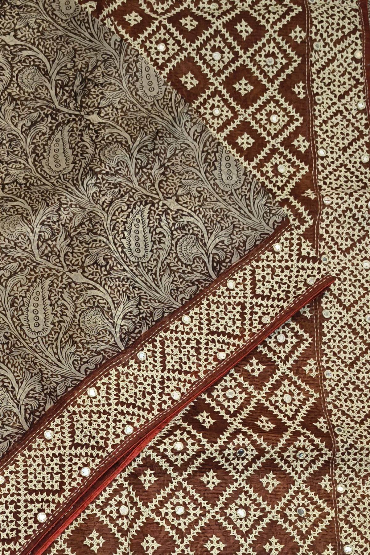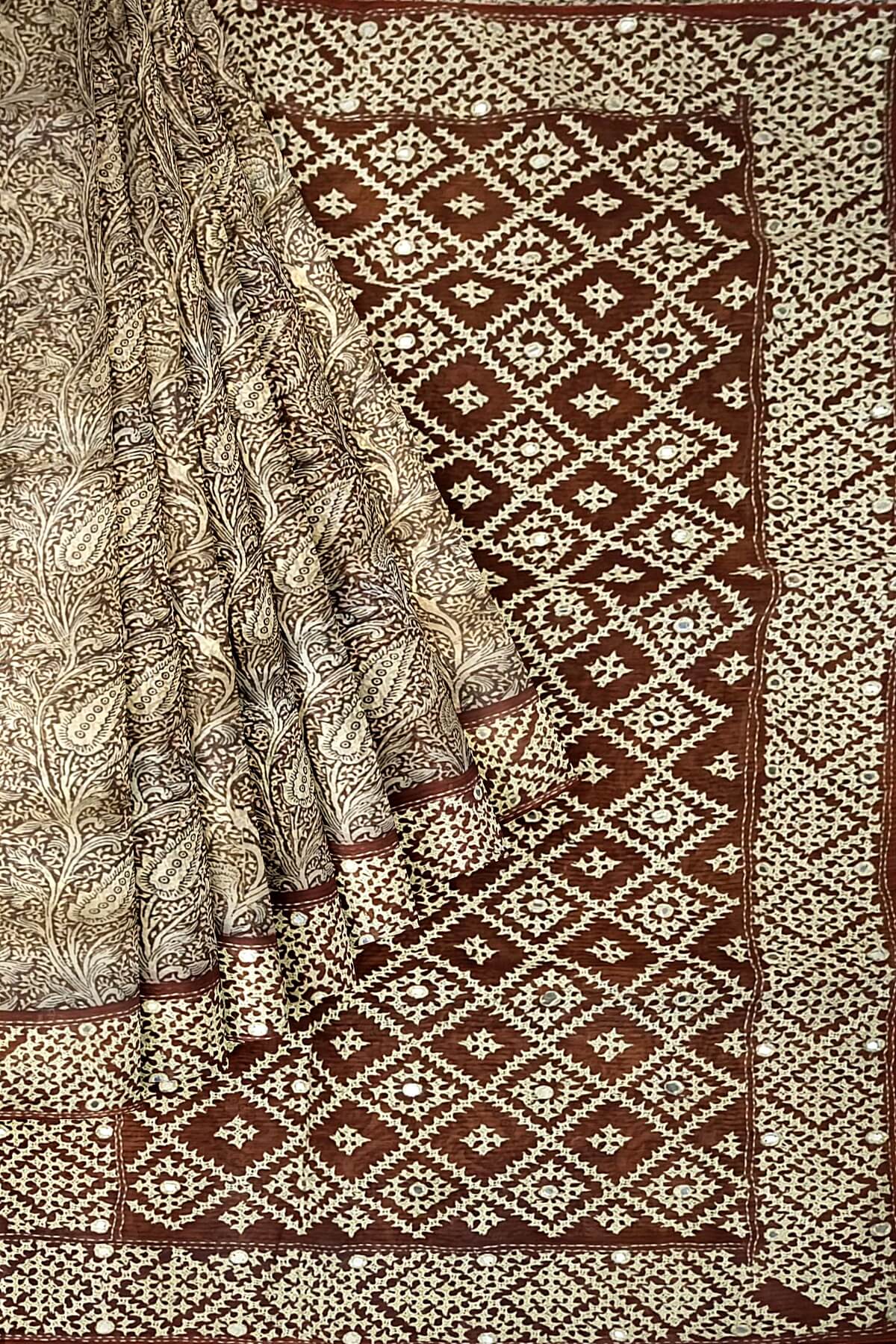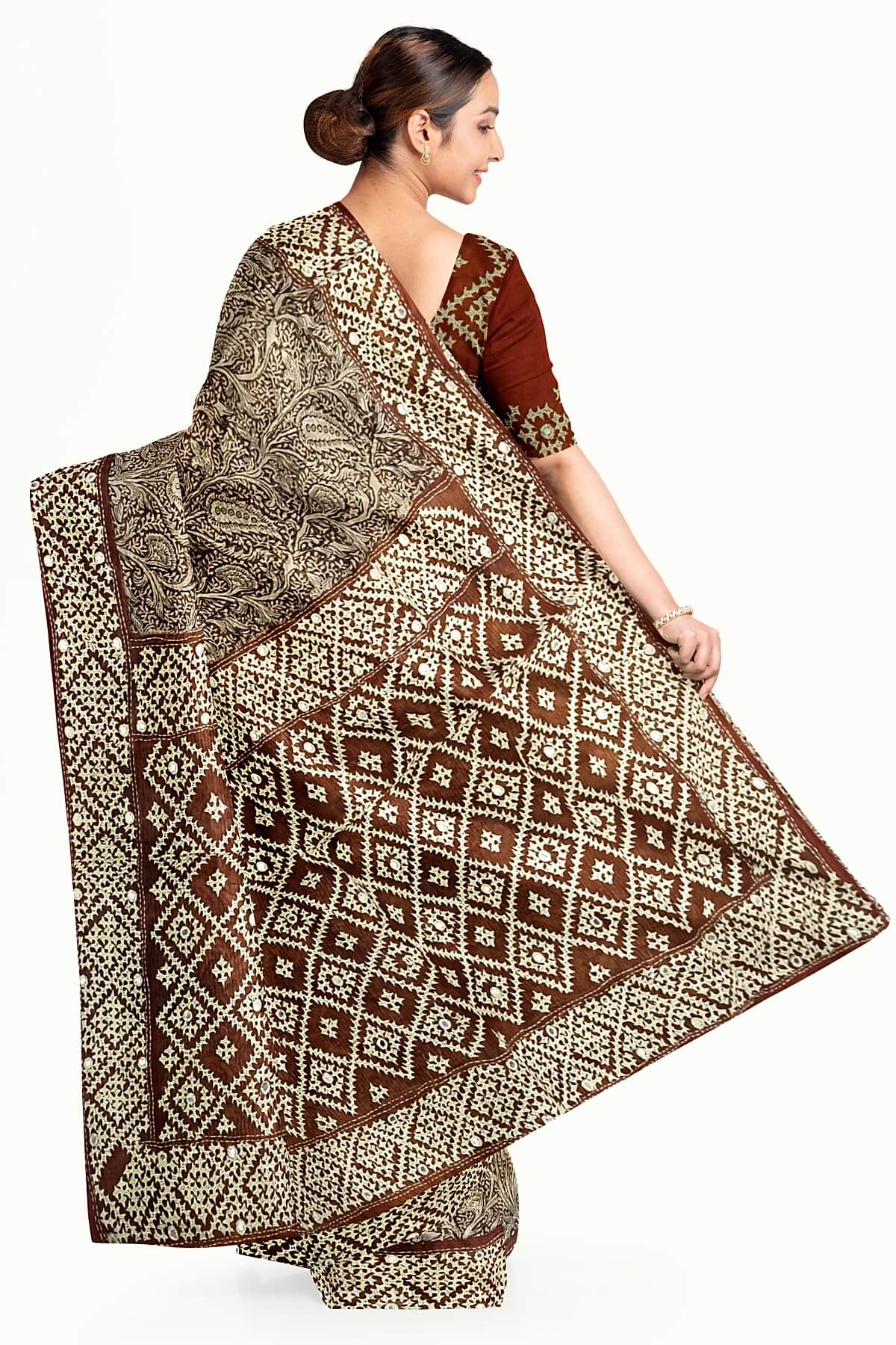 Description : Organza silk saree in brown with kutch embroidery borders & pallu