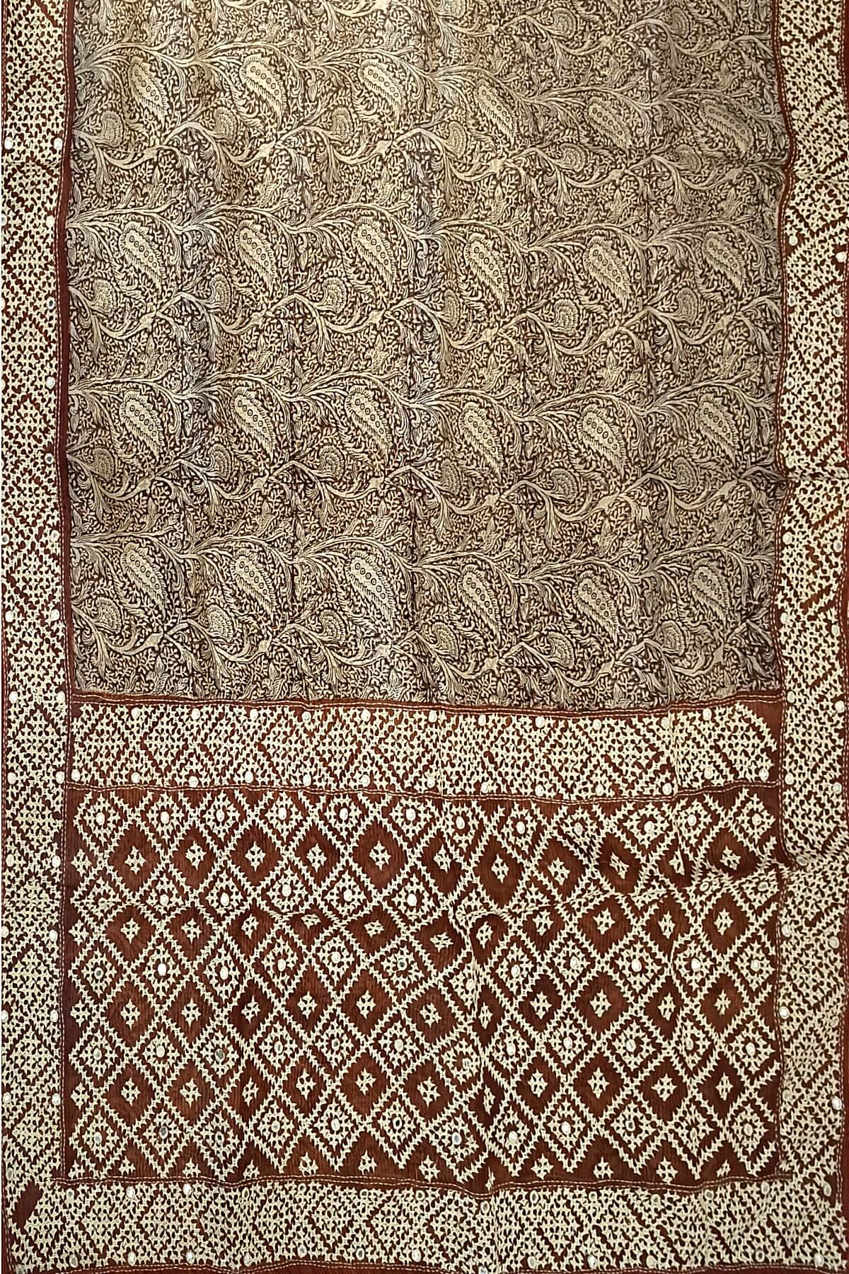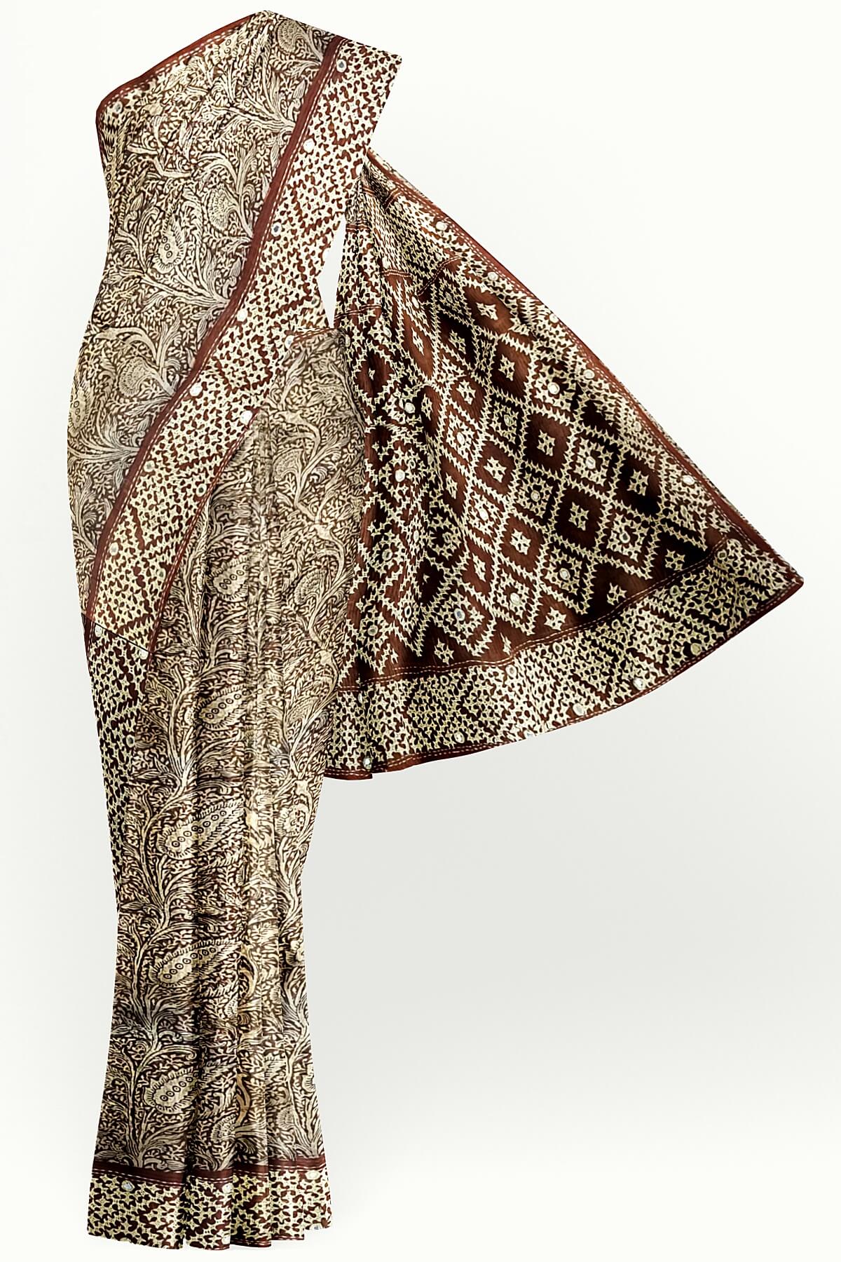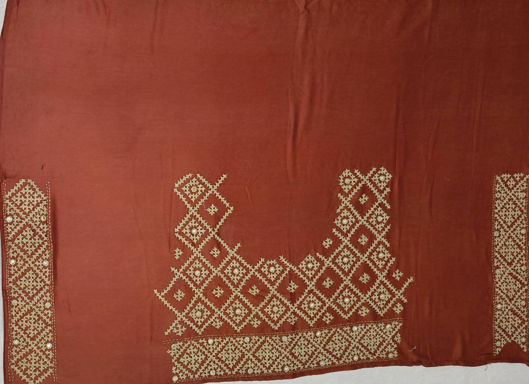 Description : Organza silk saree in brown with kutch embroidery borders & pallu